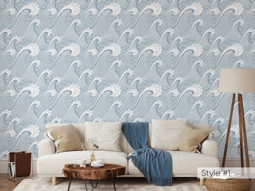 Blue Japanese Waves Wallpaper: Inspired by traditional Japanese art, this wallpaper showcases graceful waves in shades of blue, symbolizing strength, resilience, and tranquility.