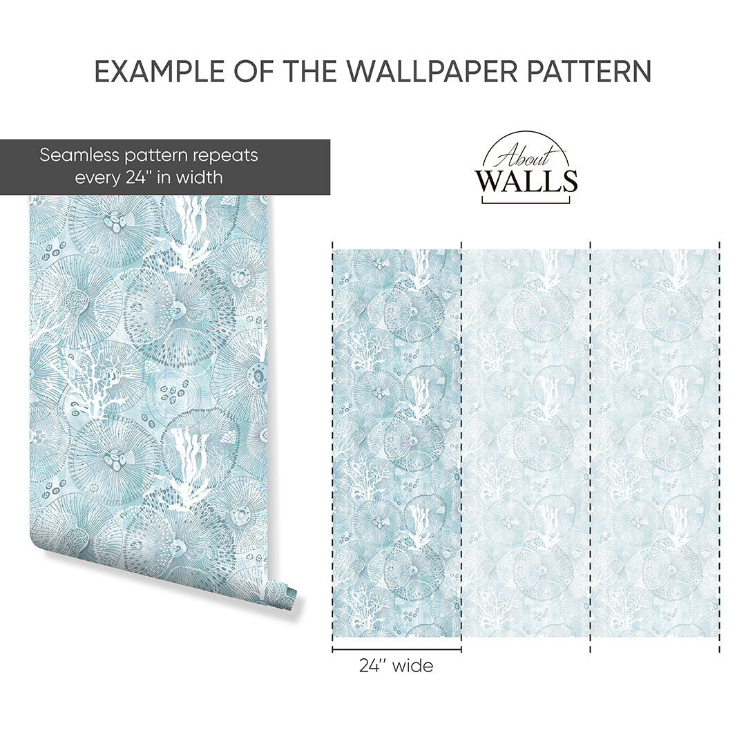 Self Adhesive Temporary Removable Vinyl Wallpaper Or Polyester Peel and Stick Wallpaper Coastal Tropical Art with Abstract Seafoam Green Coral Reef. Underwater Ocean Inspired Pattern Fabric Wallcovering.