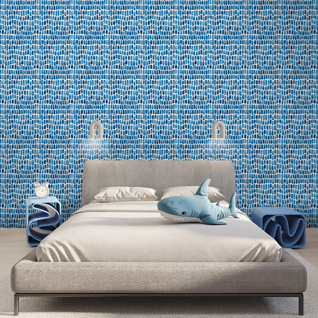 Self Adhesive Temporary Removable Vinyl Wallpaper Or Polyester Peel and Stick Wallpaper with Blue Abstract Watercolor Mosaic Tiles on White Background. Scandinavian Japandi Coastal Pattern Fabric Wallcovering.