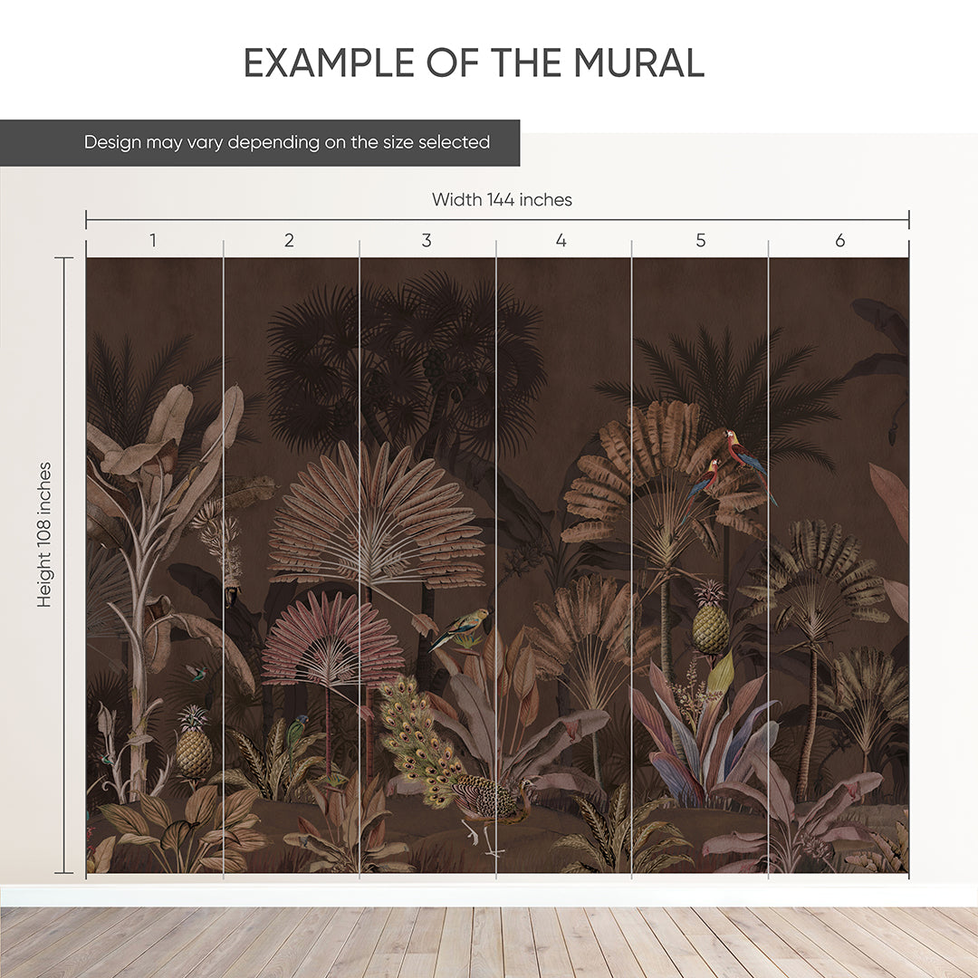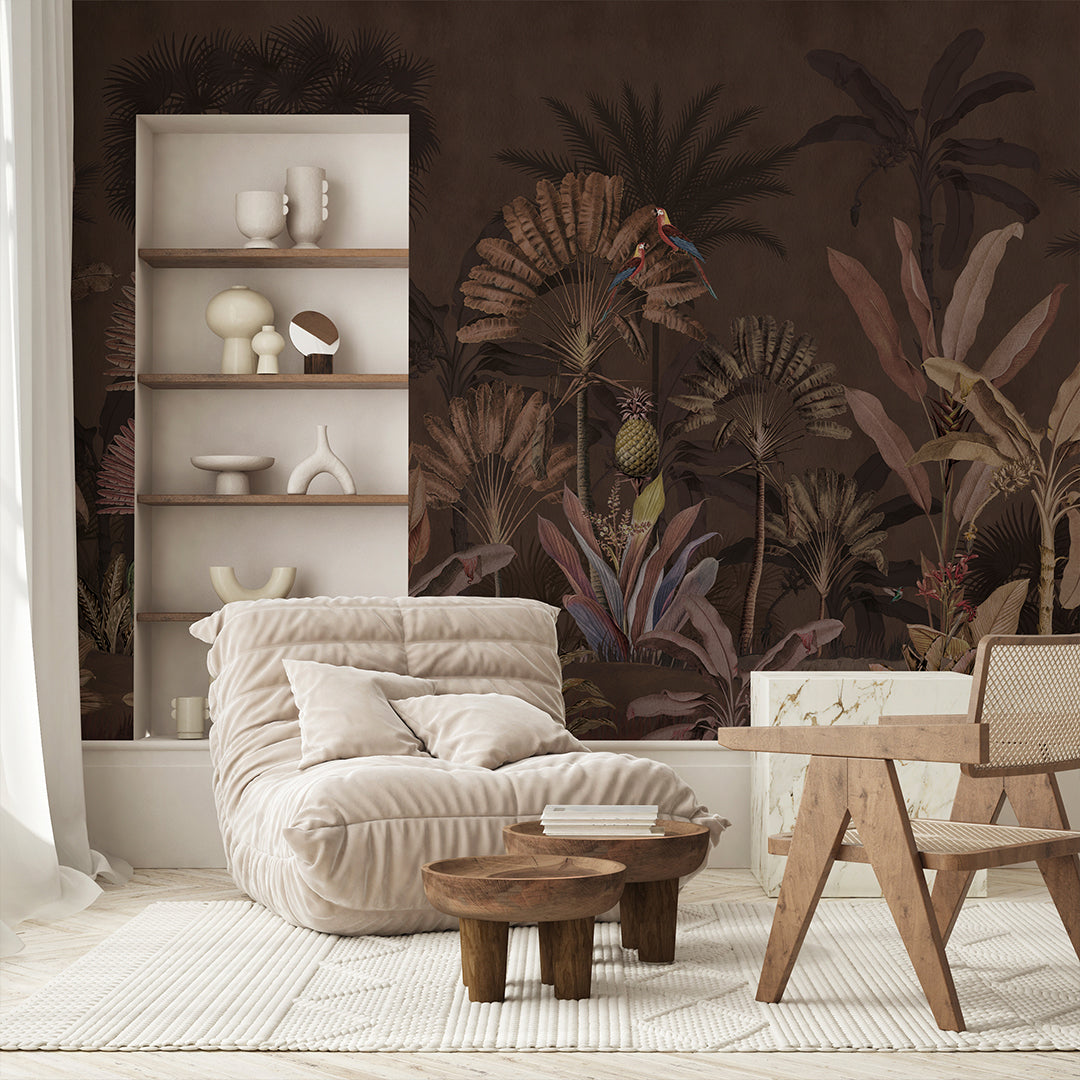 Peel and Stick Temporary Removable Vinyl Wallpaper, Traditional Unpasted Or Polyester Fabric Wallpaper with Brown Bronze Watercolor Palm Leaves and Birds on Dark Plaster Style Background. Vintage Botanical Tropical Modern Coastal Pattern Fabric Wallcovering.