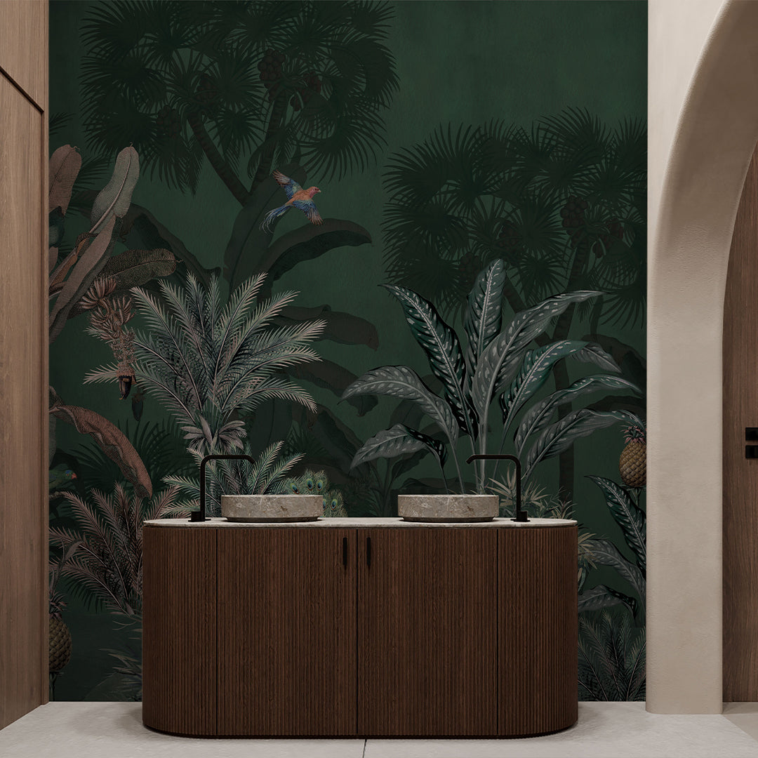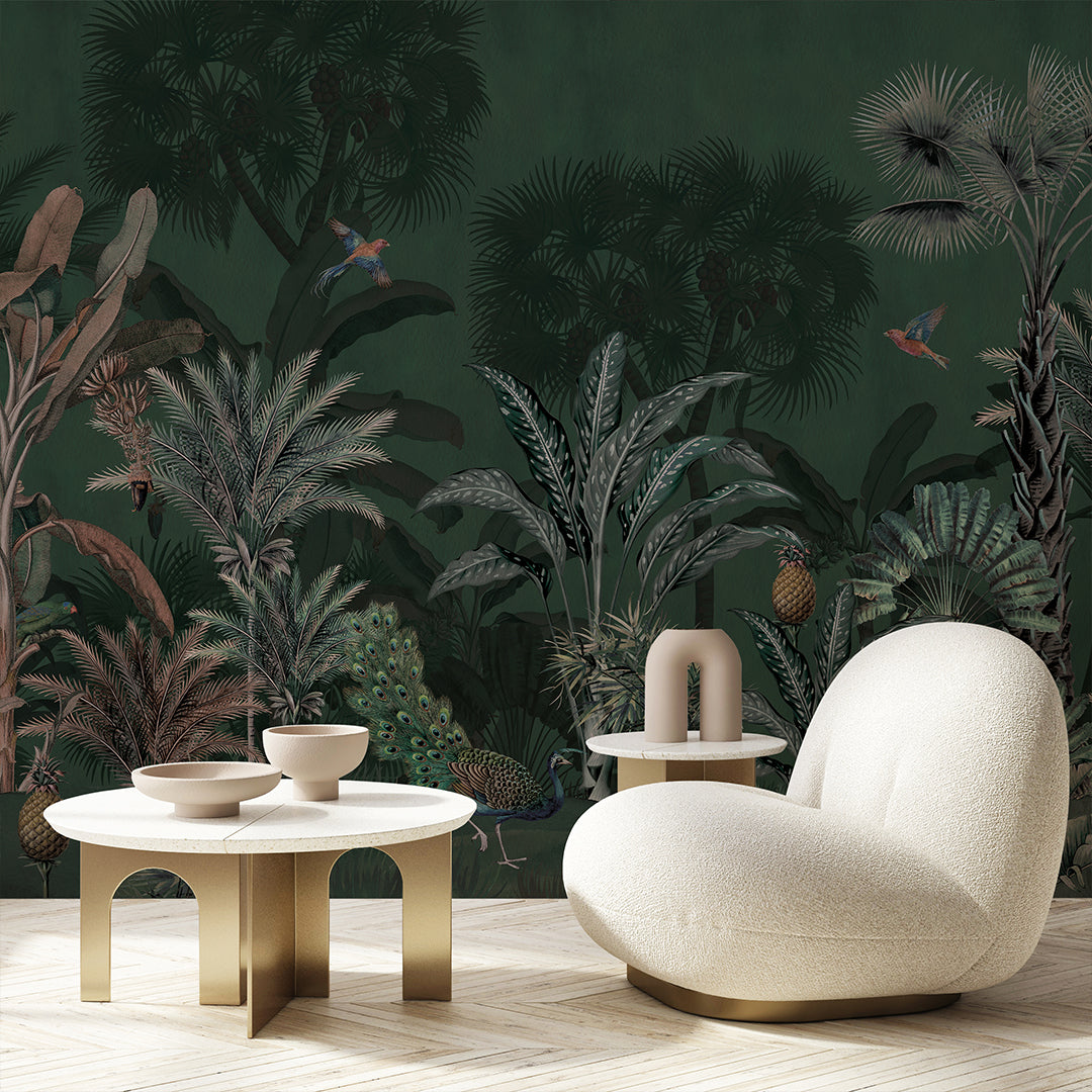 Peel and Stick Temporary Removable Vinyl Wallpaper, Traditional Unpasted Or Polyester Fabric Wallpaper with Green Brown Watercolor Palm Leaves and Birds on Dark Green Plaster Style Background. Vintage Botanical Tropical Modern Coastal Pattern Fabric Wallcovering.