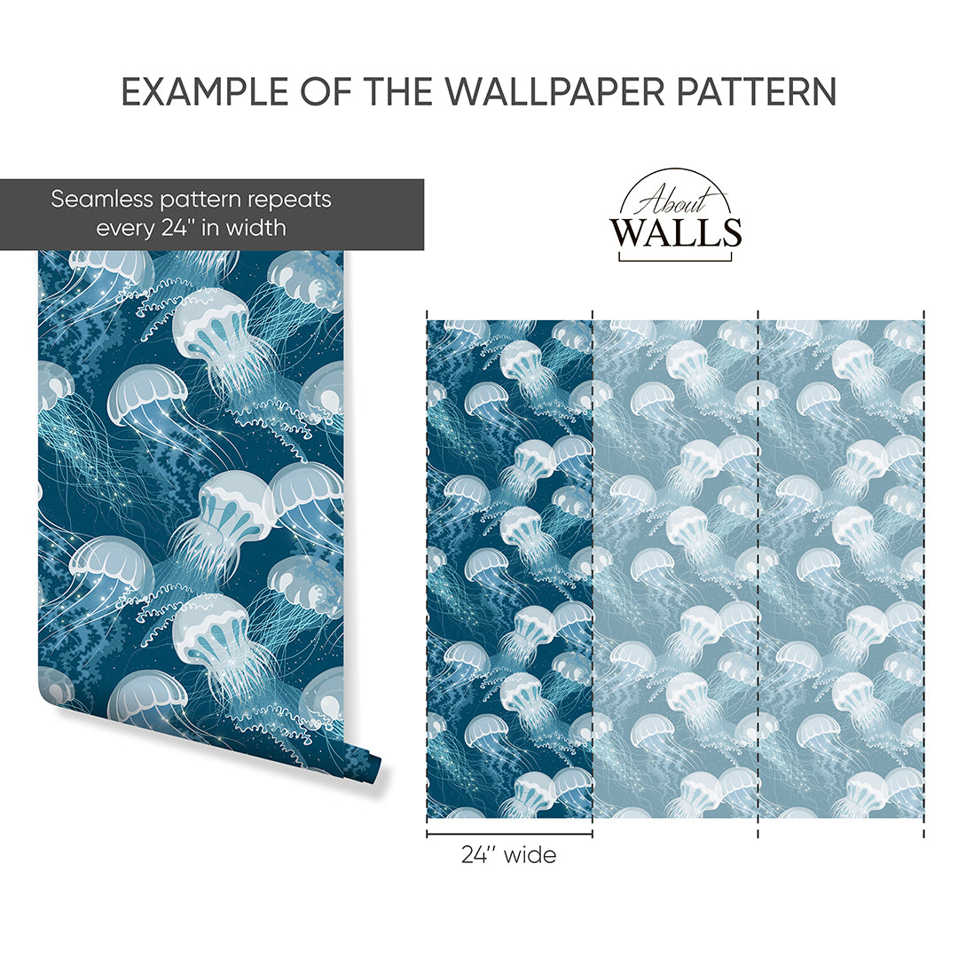 Self Adhesive Temporary Removable Vinyl Wallpaper Or Polyester Peel and Stick Wallpaper with Underwater Pattern With Neon Blue Effect Jellyfish on Dark Blue Water Background. Deep Sea Coastal Pattern Fabric Wallcovering.