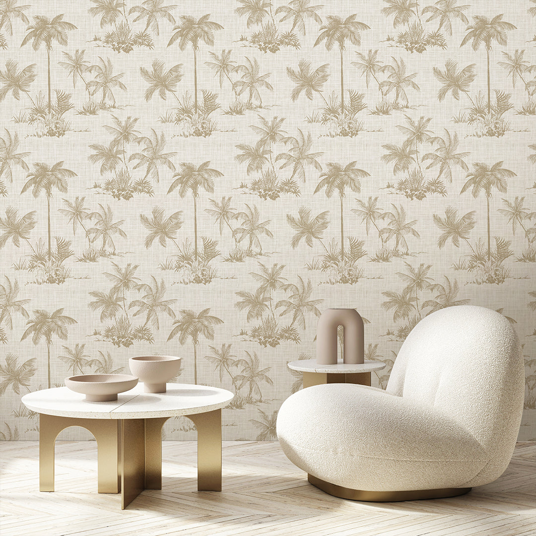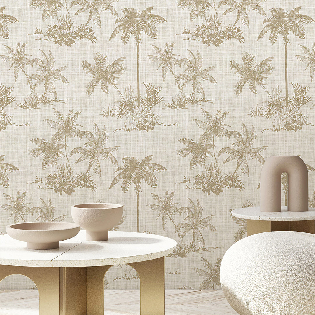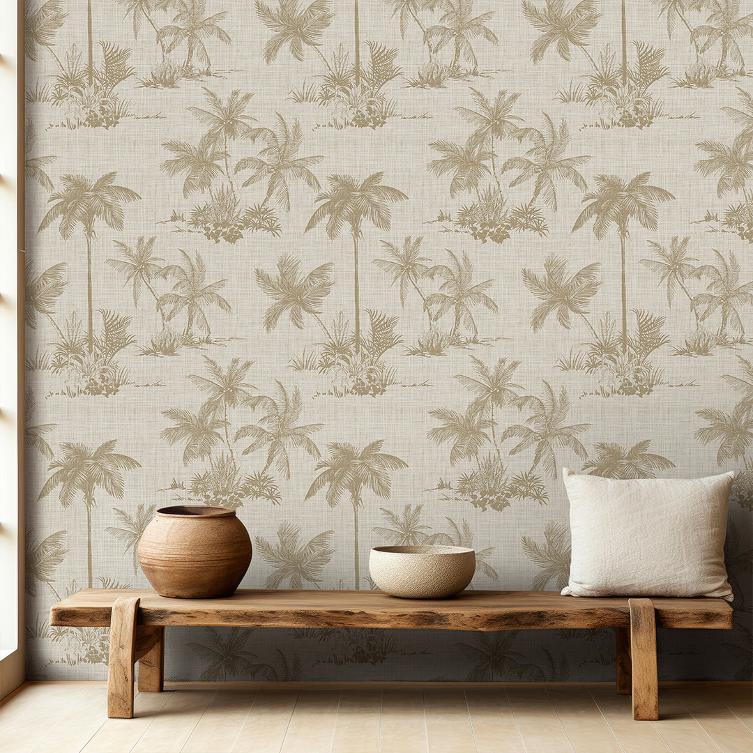 Self Adhesive Temporary Removable Vinyl Wallpaper Or Polyester Fabric Peel and Stick Wallpaper with Beige Palms on Neutral Linen Effect Background. Botanical Vintage Coastal Pattern Fabric Wallcovering.