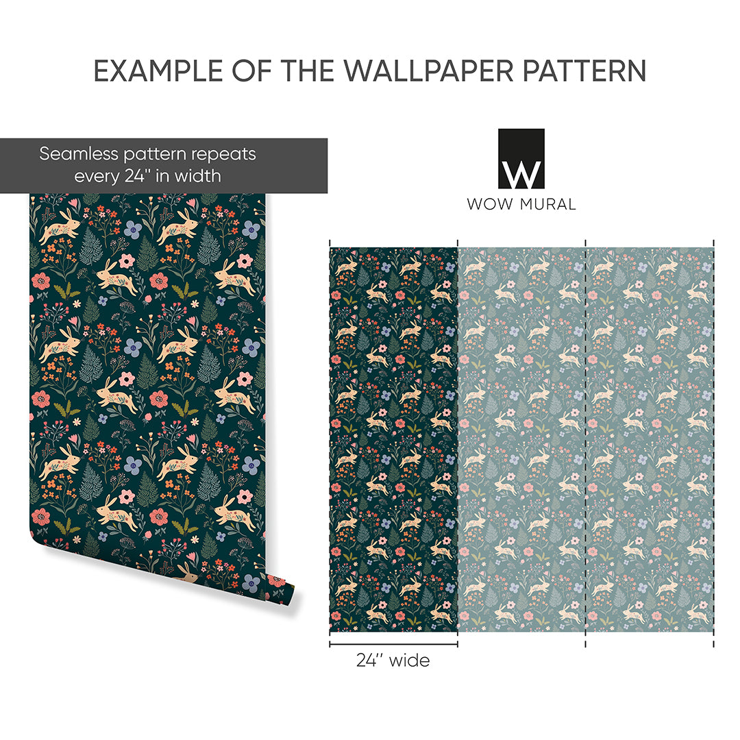 Self Adhesive Temporary Removable Vinyl Wallpaper Or Polyester Fabric Peel and Stick Wallpaper with Forest Green Rabbit and Floral on Dark Green Background. Botanical Cottagecore Farmhouse Design Pattern Fabric Wallpaper Wallcovering.