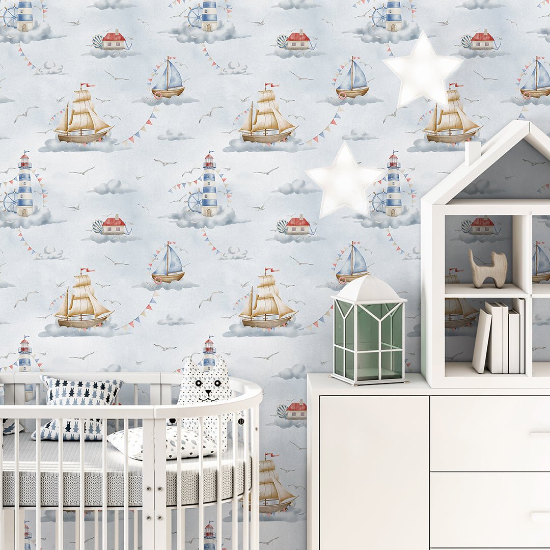 Self Adhesive Temporary Removable Vinyl Wallpaper Or Polyester Peel and Stick Wallpaper with Cute Blue Beige Tiny Sailing Boats Lighthouses Clouds and Miniature Houses on Light Blue Watercolor Background. Minimalist Pastel Nautical Pattern Fabric Wallcovering.