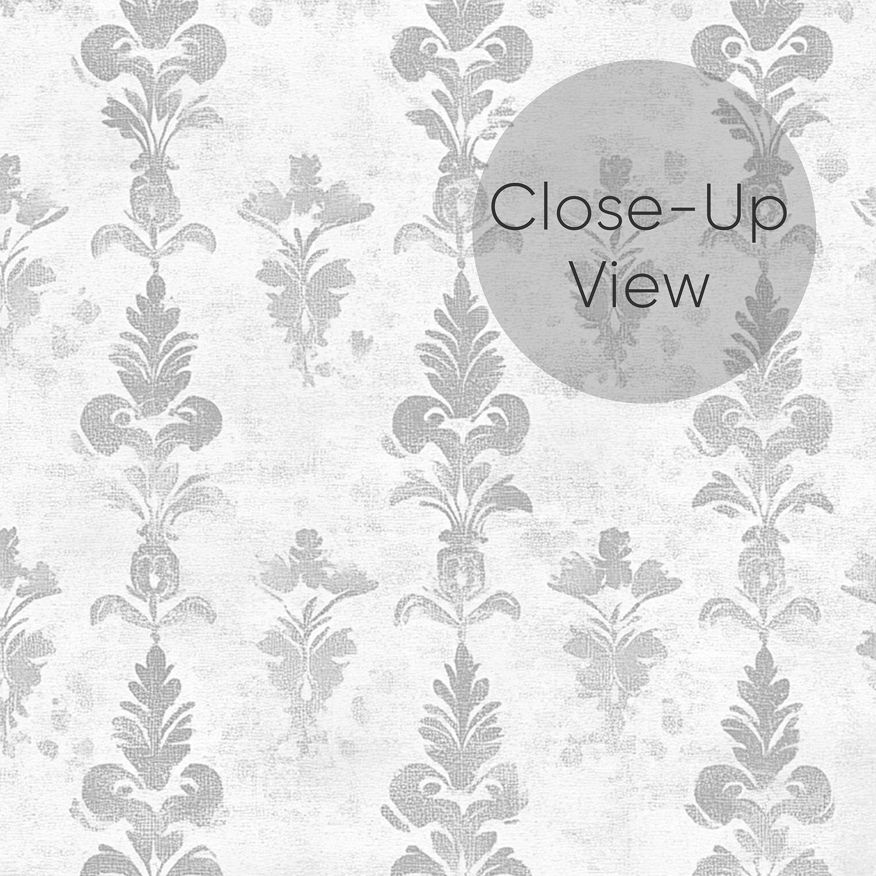 Gray Damask Wallpaper showcases narrow, classic damask emblems in cool gray on a pale off-white ground with a softly distressed, vintage-washed texture. This Gray Damask Wallpaper elevates a bedroom, dining room, or hallway in French country, cottage, or modern farmhouse style, adding elegant detail without heavy color. Ideal for anyone searching for neutral gray damask wallpaper for a refined traditional living room accent wall. Removable peel and stick vinyl, temporary, self-adhesive canvas, traditional unpasted wallpaper or pre-pasted wallpaper and Wall Murals - all materials are eco-friendly. Made in the USA. High-quality removable material, this wallpaper is easy to apply and reposition, making it suitable for renters and home decorators and designers.