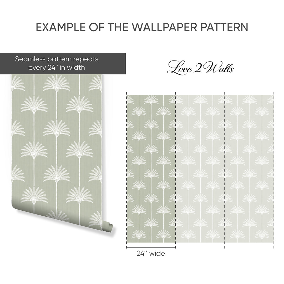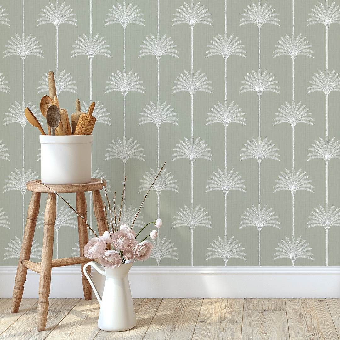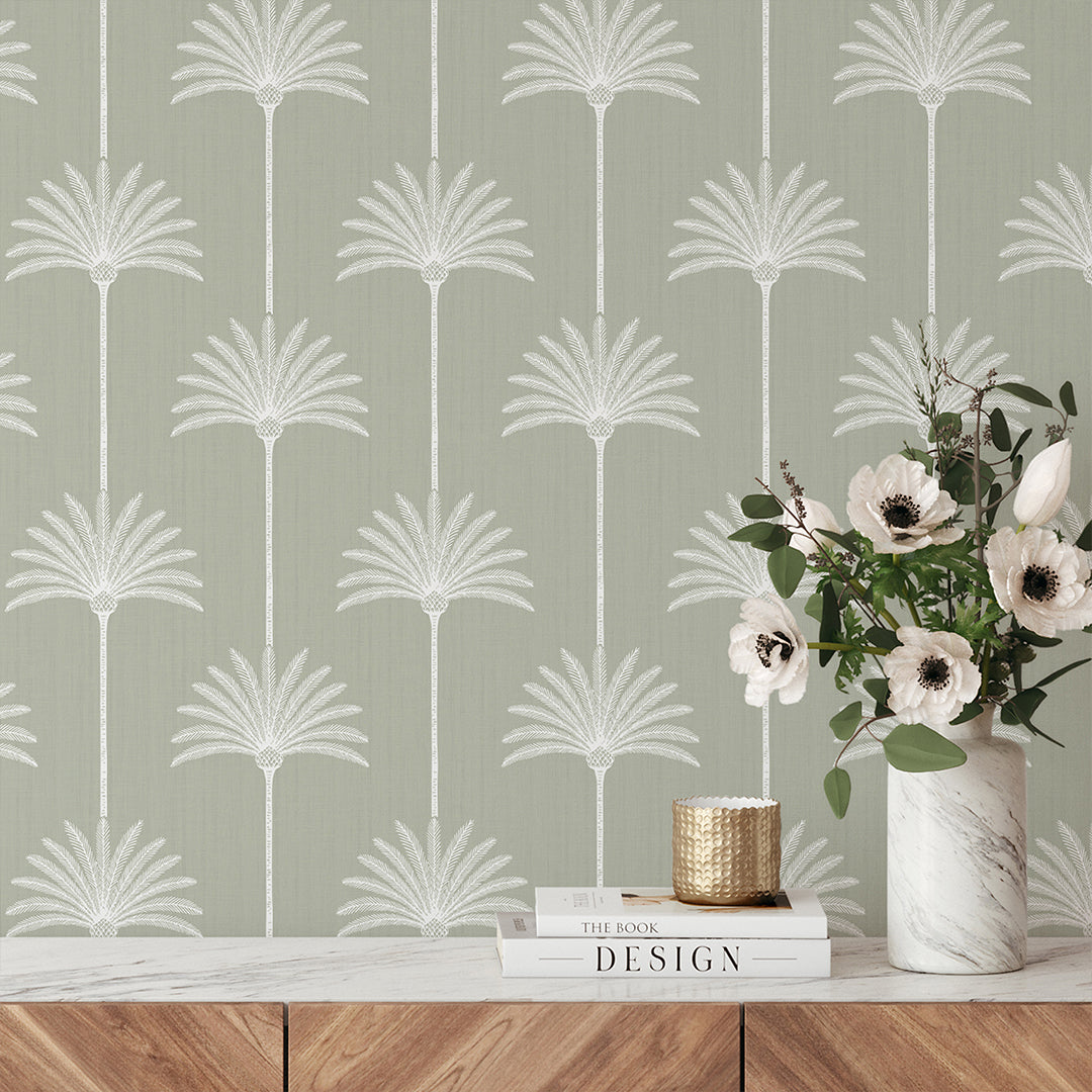 Sage green palm tree wallpaper mural with white palms on a linen texture background, a calm coastal tropical look for bedroom, bathroom, nursery, or living room. Removable peel and stick, temporary, self-adhesive, traditional unpasted wallpaper or pre-pasted wallpaper and Wall Murals - all materials are eco-friendly. Made in the USA. High-quality removable material, easy to apply and reposition for renters, home decorators and designers.