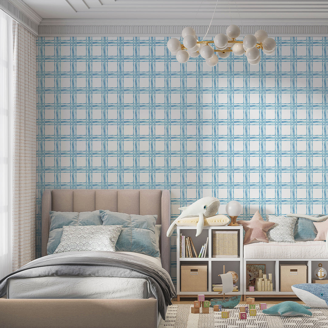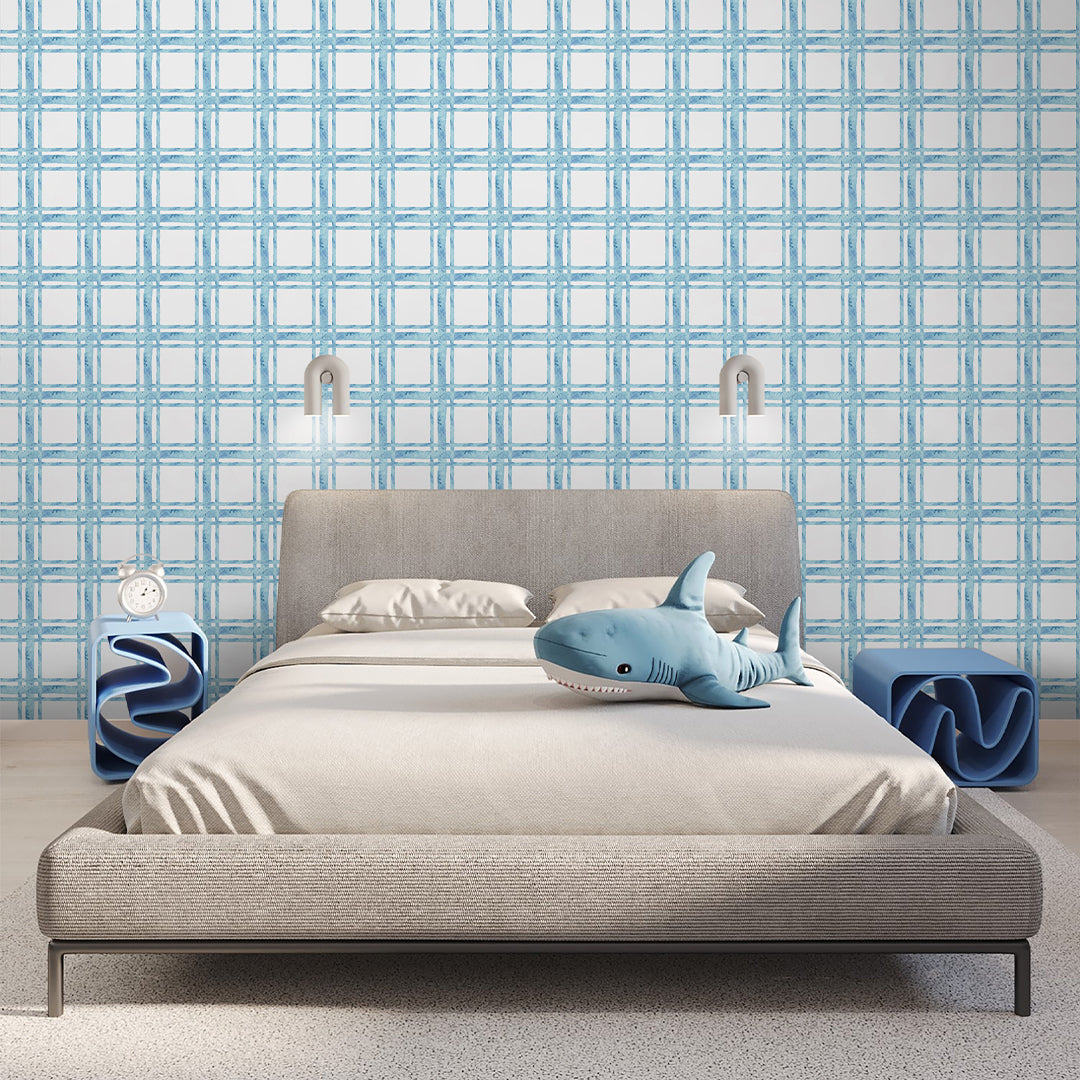 Self Adhesive Temporary Removable Vinyl Wallpaper Or Polyester Peel and Stick Wallpaper with Light Blue Watercolor Checkered Pattern. Farmhouse Cottagecore Style Pattern Fabric Wallcovering.