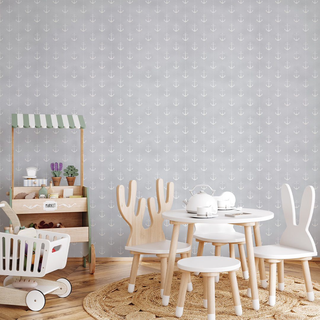 Self Adhesive Temporary Removable Vinyl Wallpaper Or Polyester Peel and Stick Wallpaper with Tiny White Anchors on Textured Soft Grey Watercolor Background. Minimalist Pastel Nautical Pattern Fabric Wallcovering.