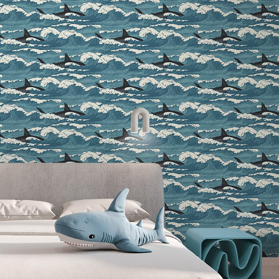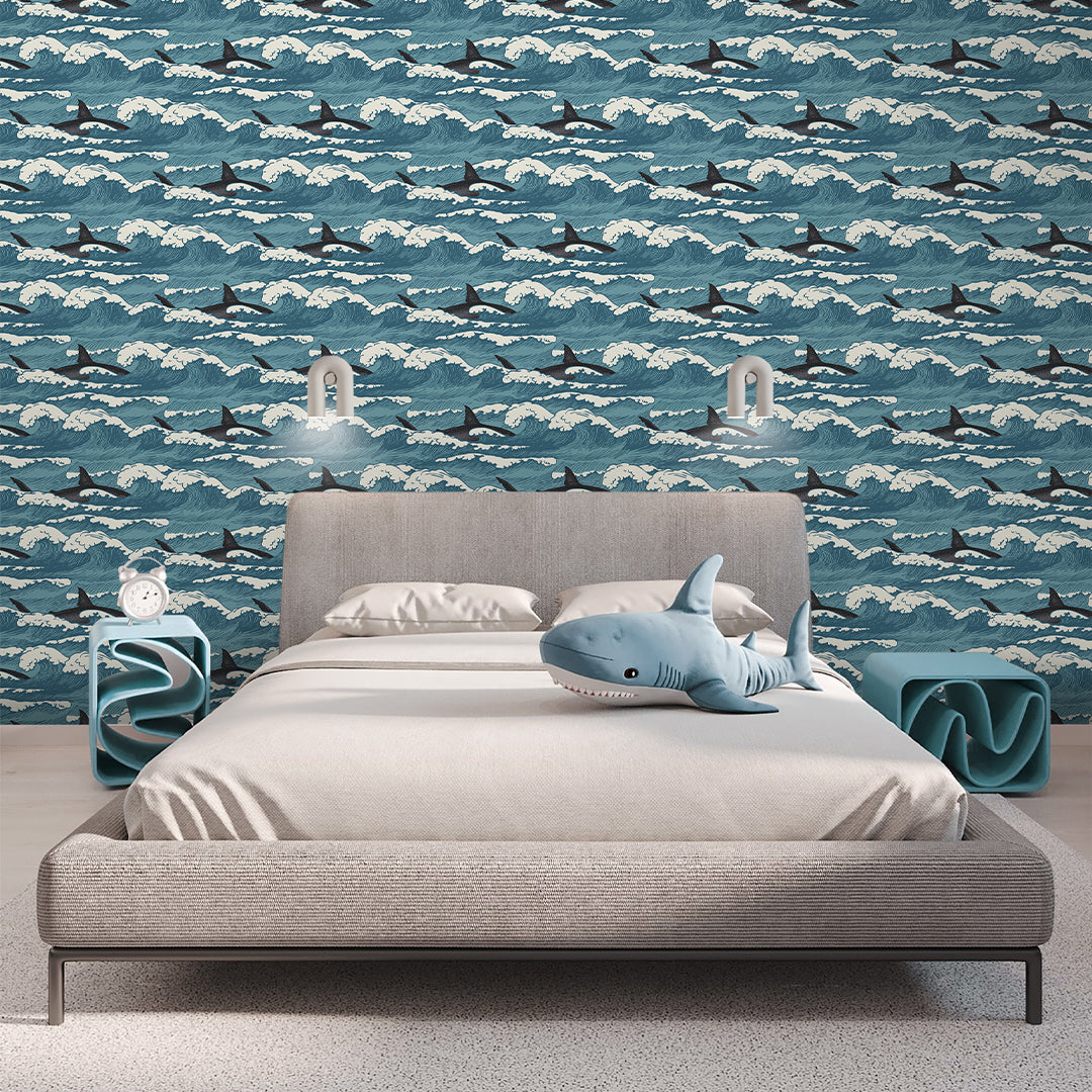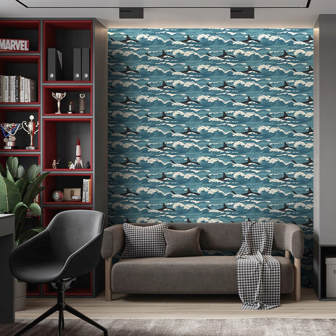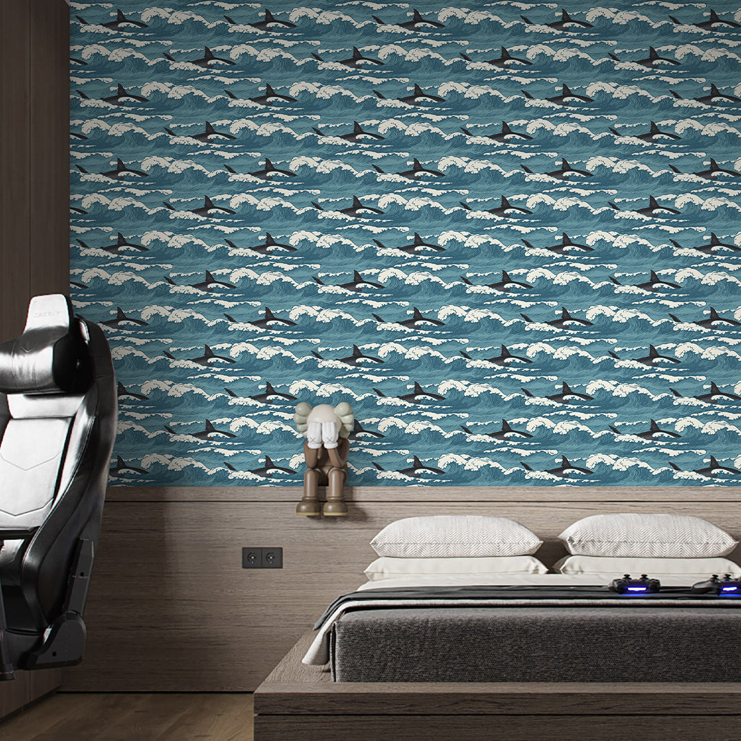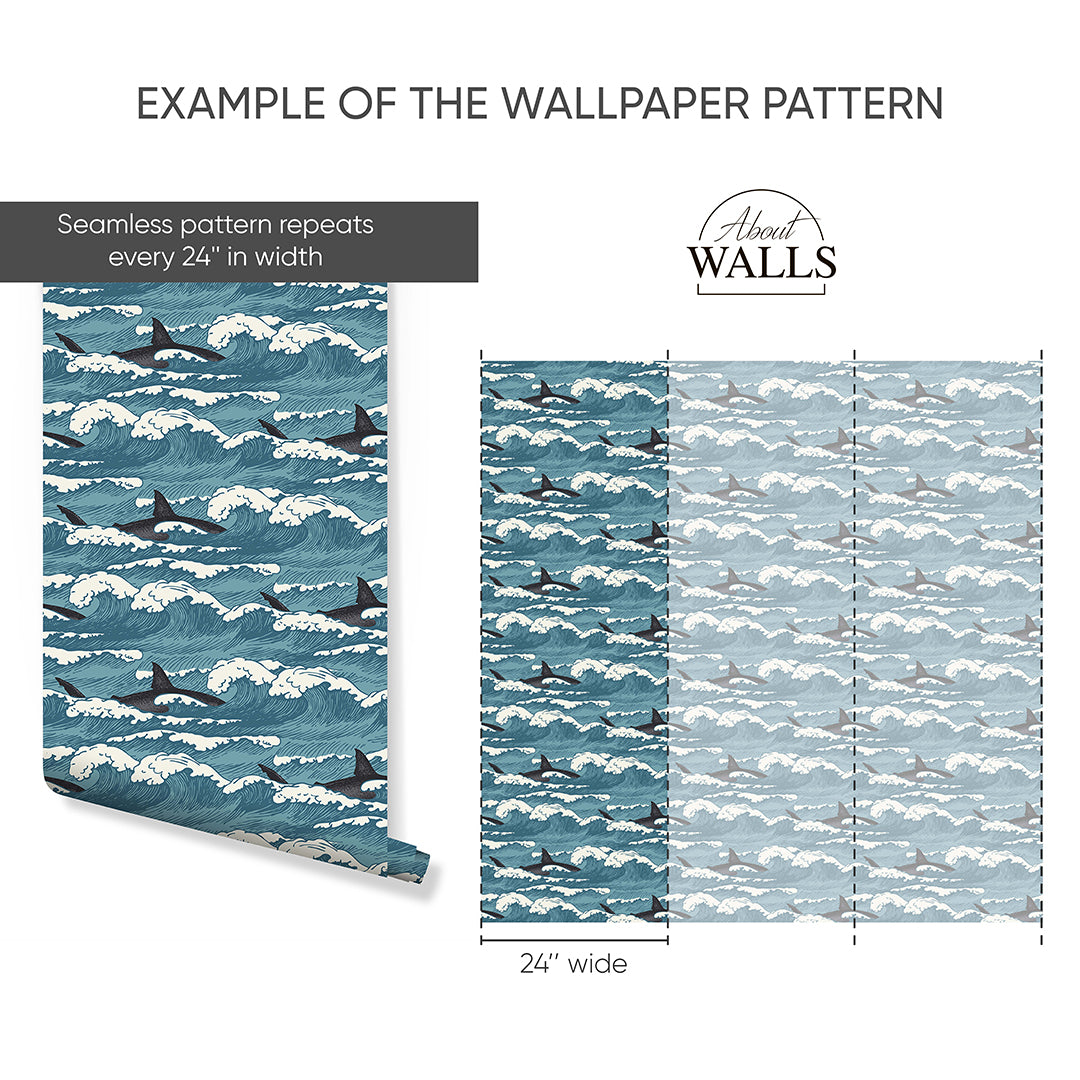 Self Adhesive Temporary Removable Vinyl Wallpaper Or Polyester Peel and Stick Wallpaper Hokusai Style Blue Abstract Ocean Waves and Orca Whales Art. Vintage Japanese Seigaiha Ocean Flow Pattern Fabric Wallcovering.