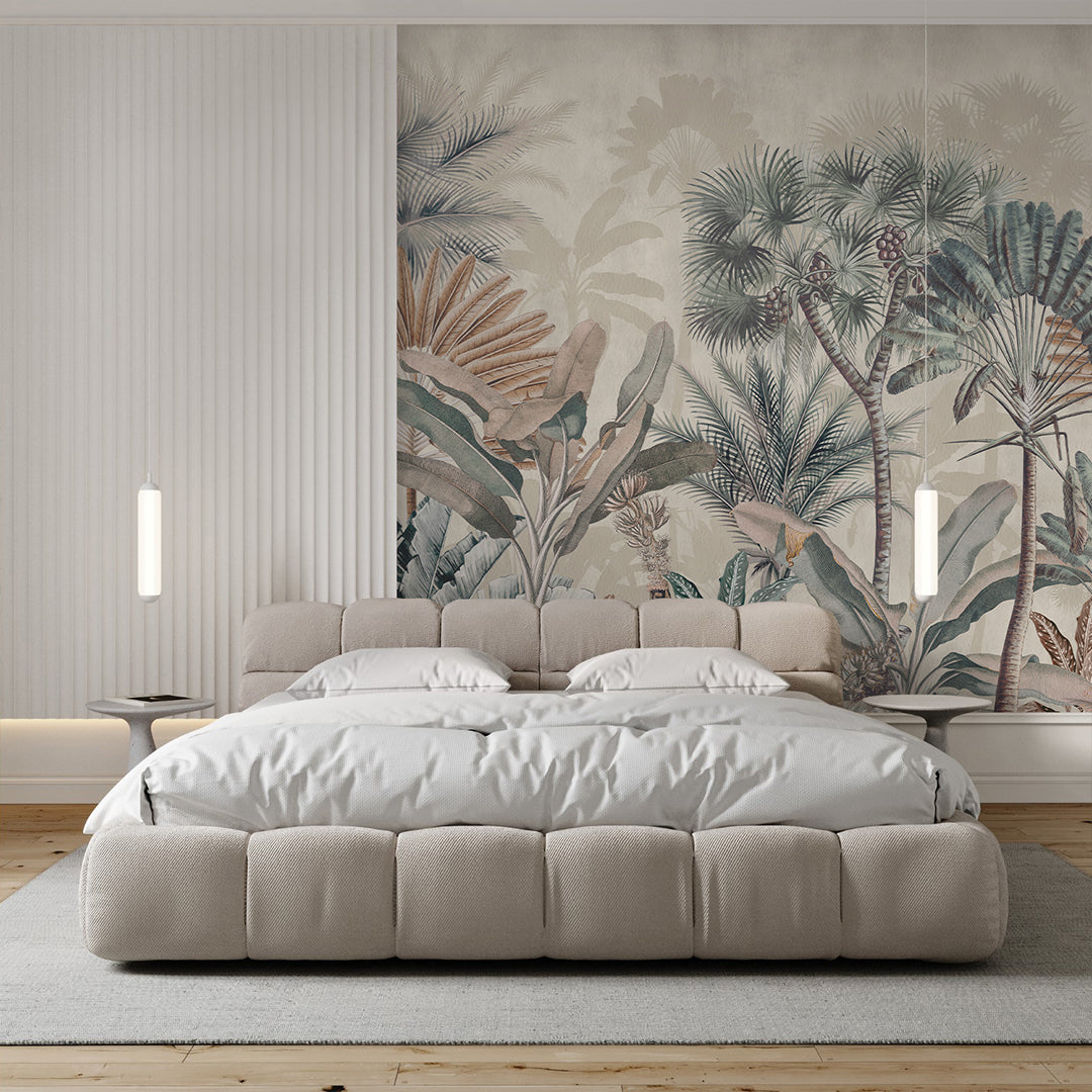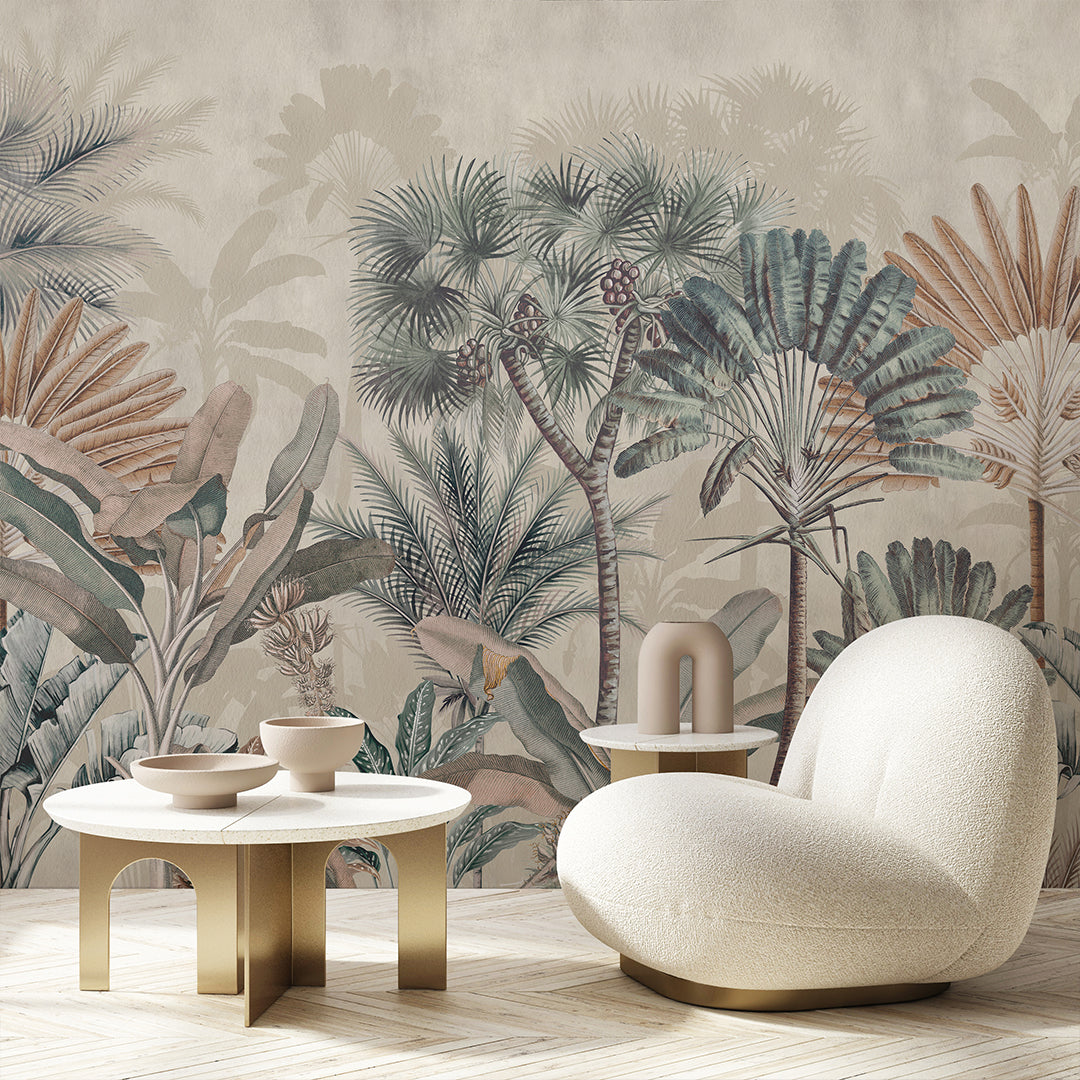 Peel and Stick Temporary Removable Vinyl Wallpaper, Traditional Unpasted Or Polyester Fabric Wallpaper with Light Soft Green Watercolor Palm Leaves on Beige Plaster Style Background. Neutral Botanical Tropical Modern Coastal Pattern Fabric Wallcovering.
