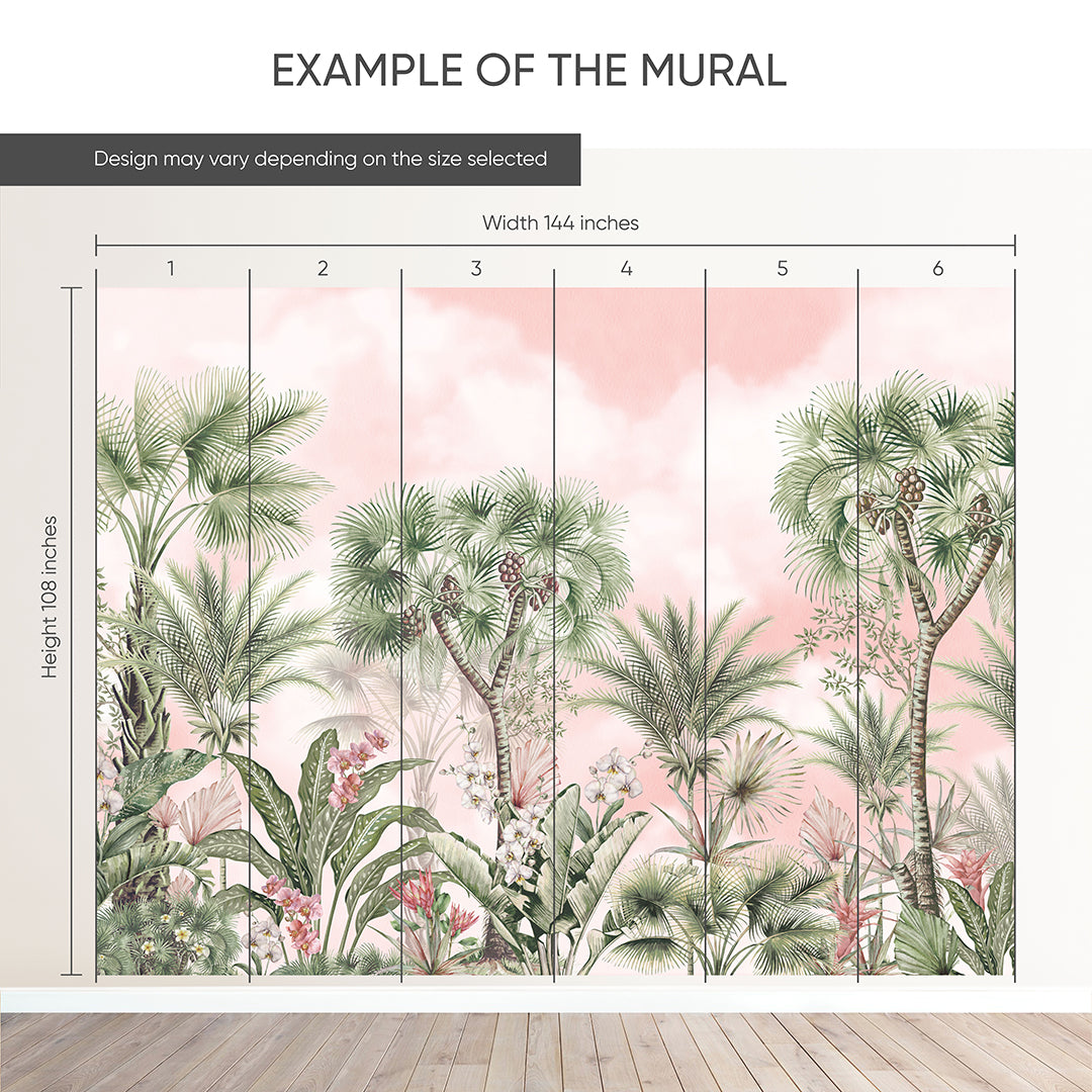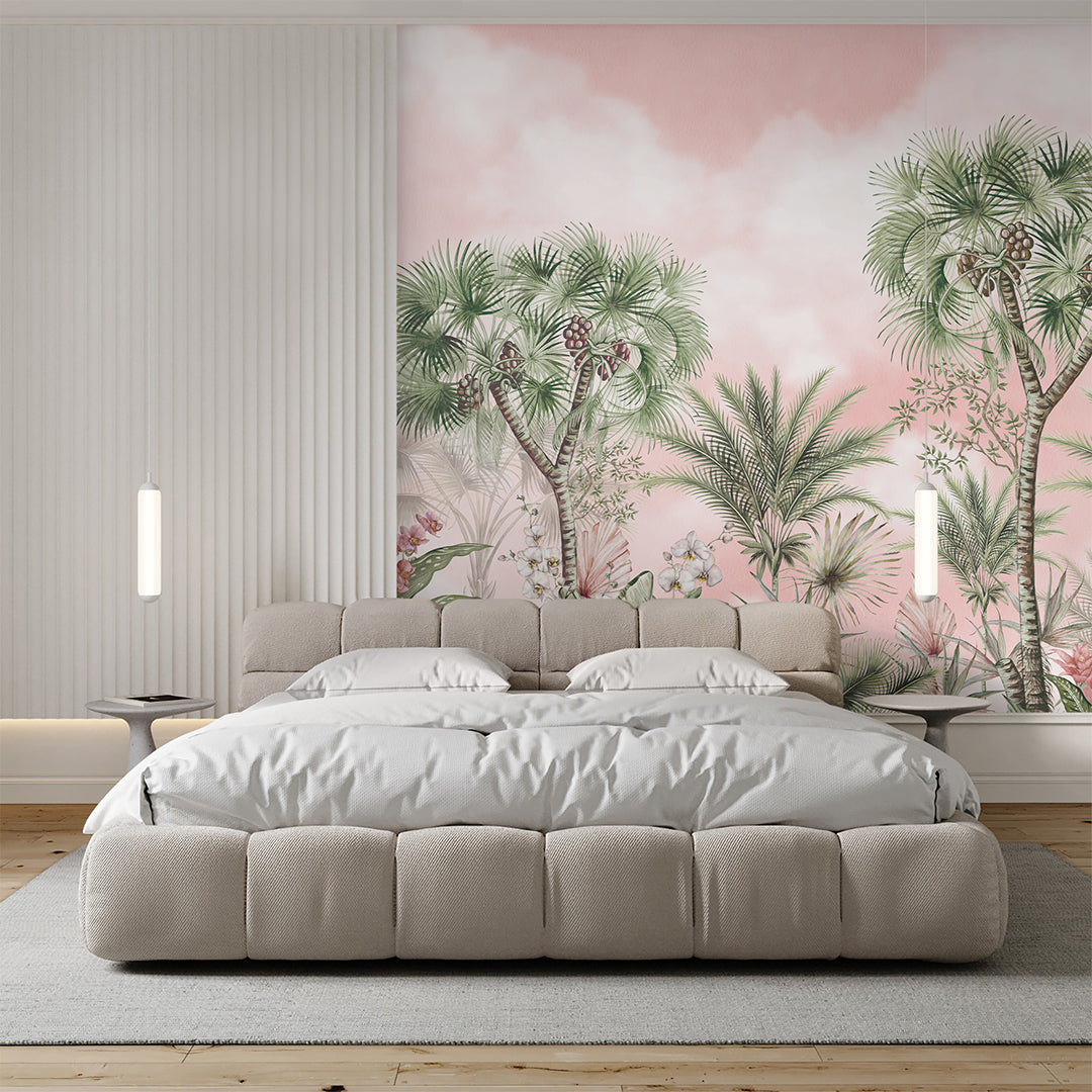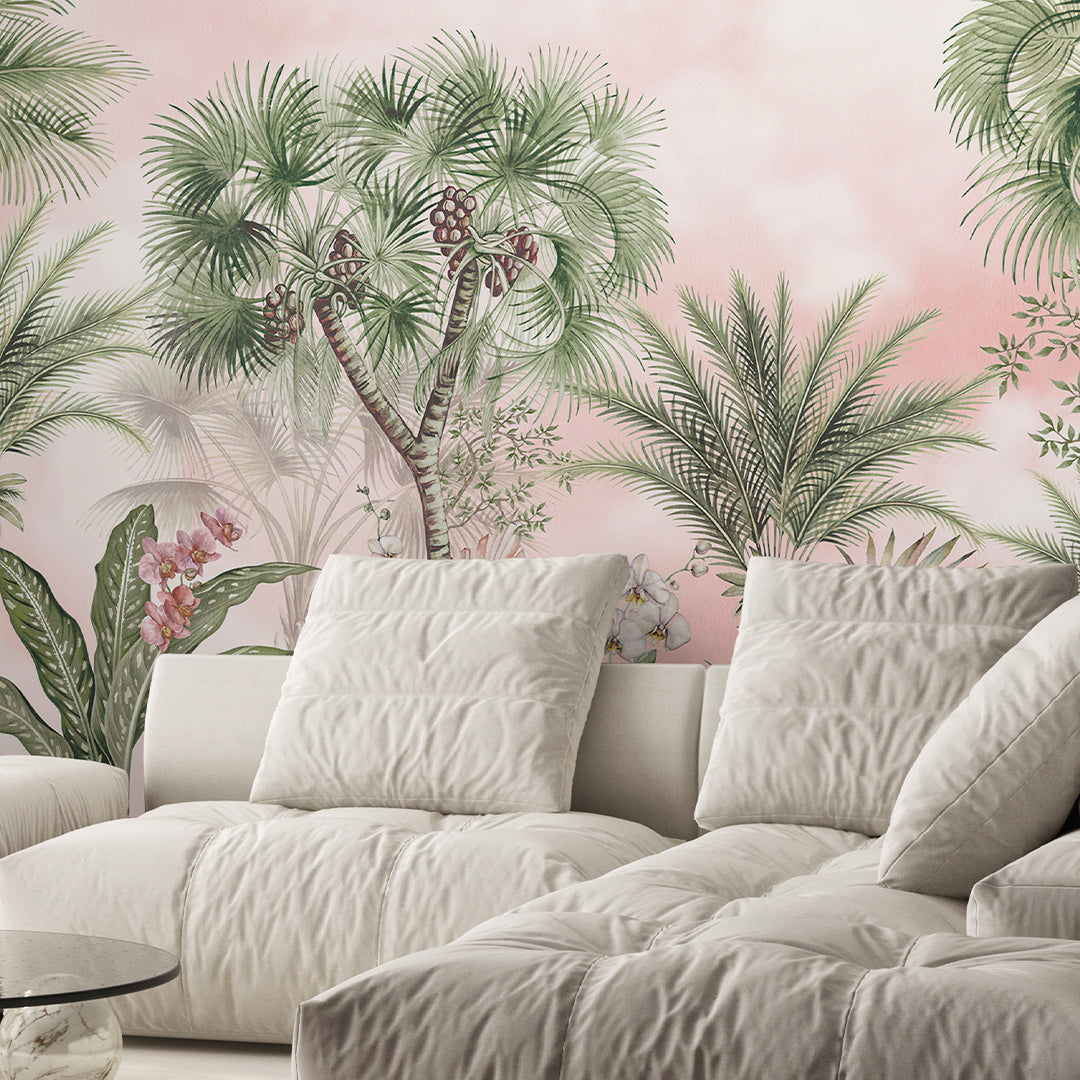 Peel and Stick Temporary Removable Vinyl Wallpaper, Traditional Unpasted Or Polyester Fabric Wallpaper with Light Soft Green Watercolor Palm Leaves on Pink Cloud Plaster Background. Botanical Tropical Modern Coastal Pattern Fabric Wallcovering.