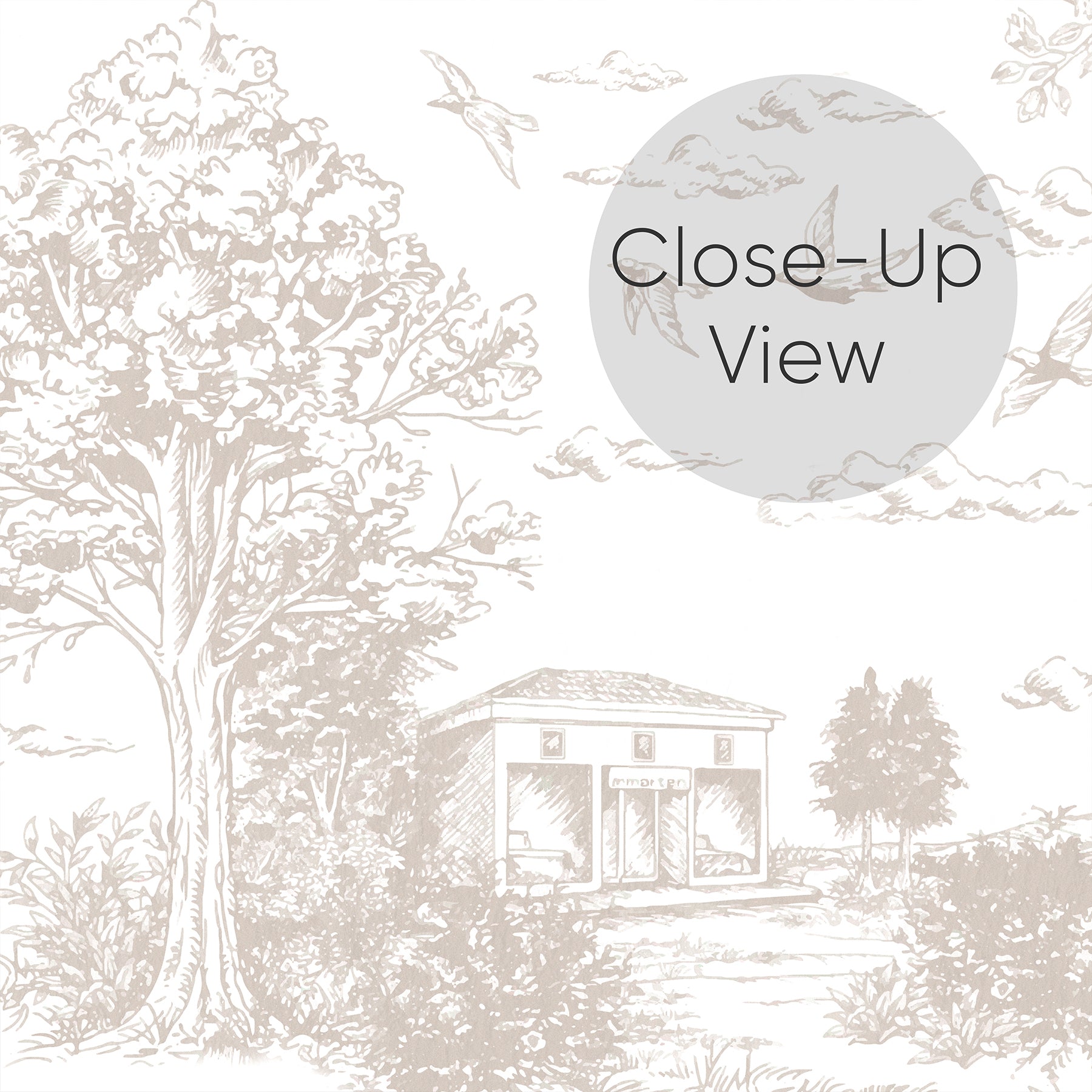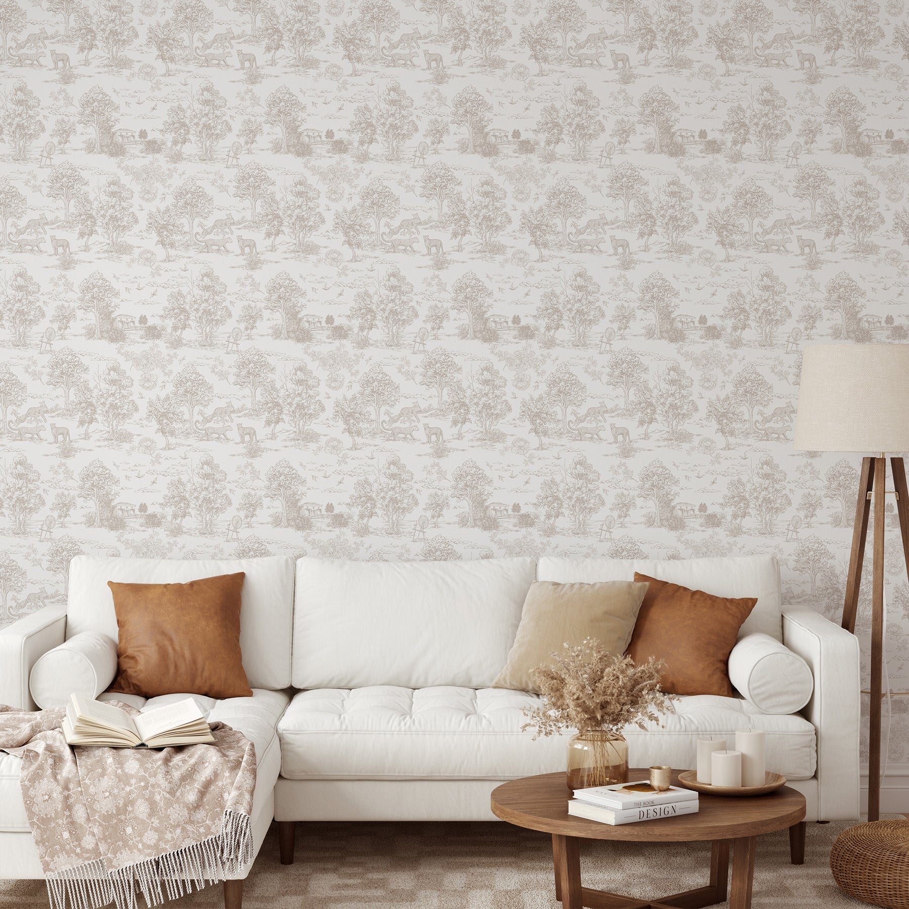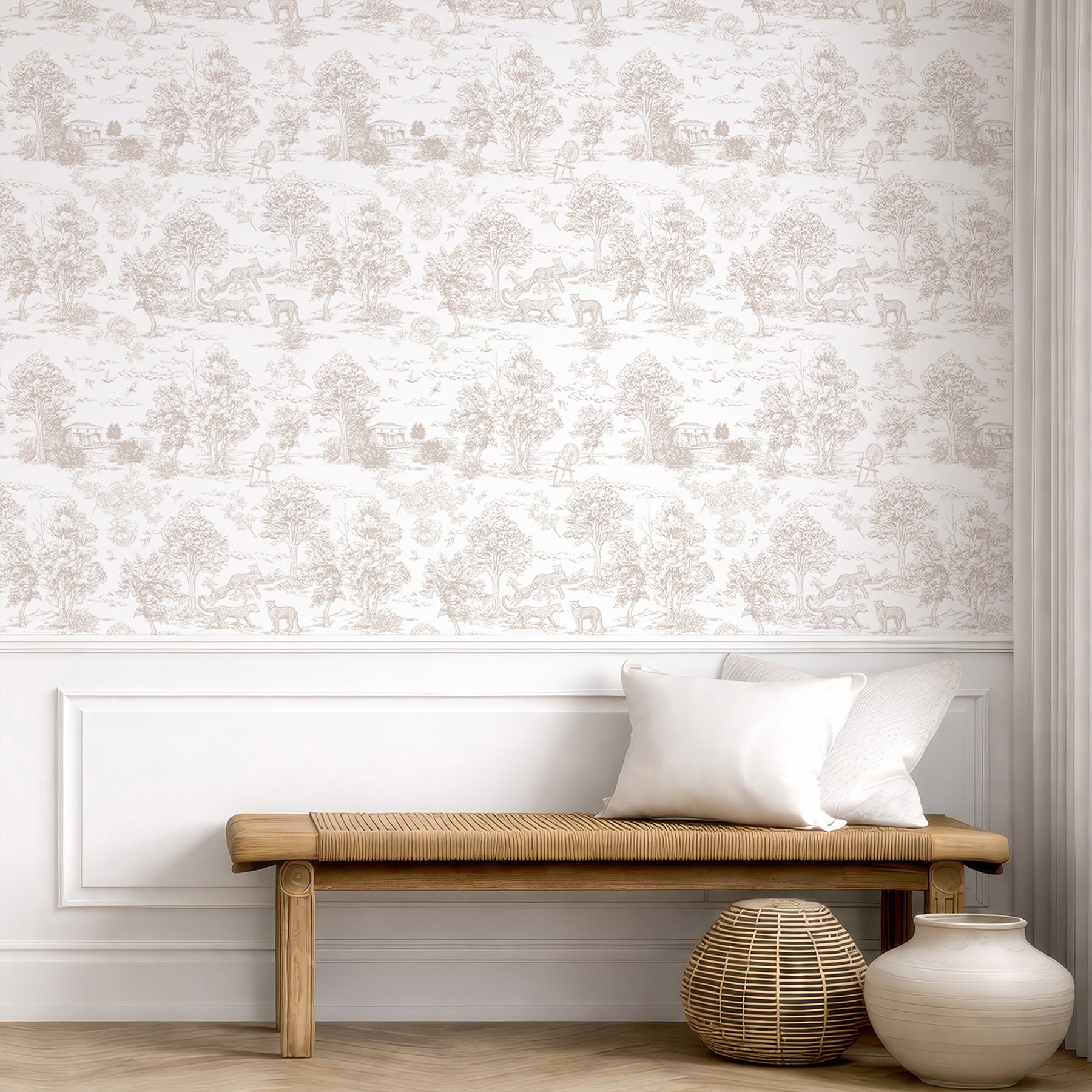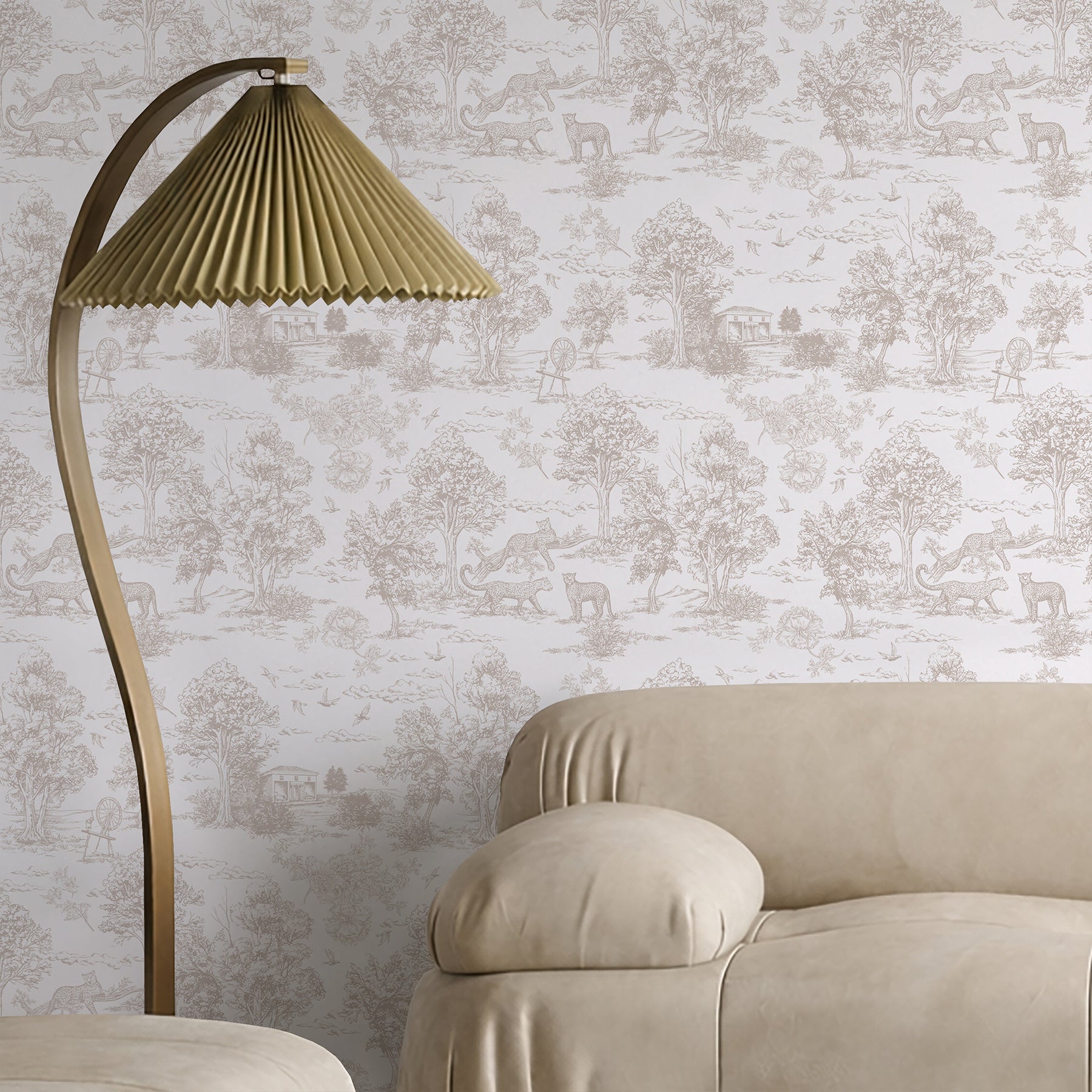 Neutral French toile safari wall mural with delicate beige sketch landscape and wild cats. Choose Removable peel and stick, temporary, self-adhesive, traditional unpasted wallpaper or pre-pasted wallpaper. Wall Murals - all materials are eco-friendly. Made in the USA. High-quality removable material, easy to apply, remove, and reposition for renters, home decorators, and designers.