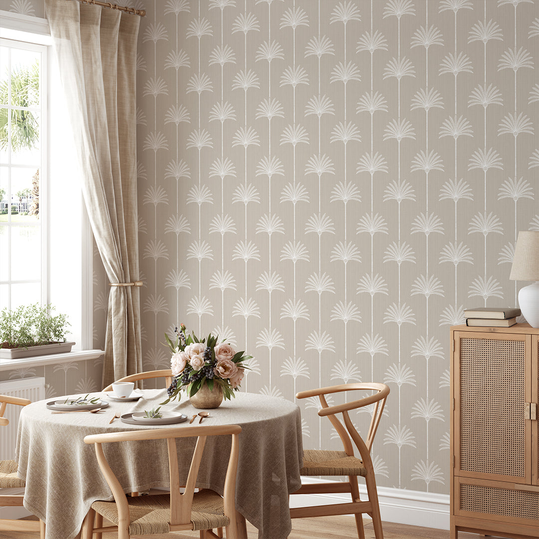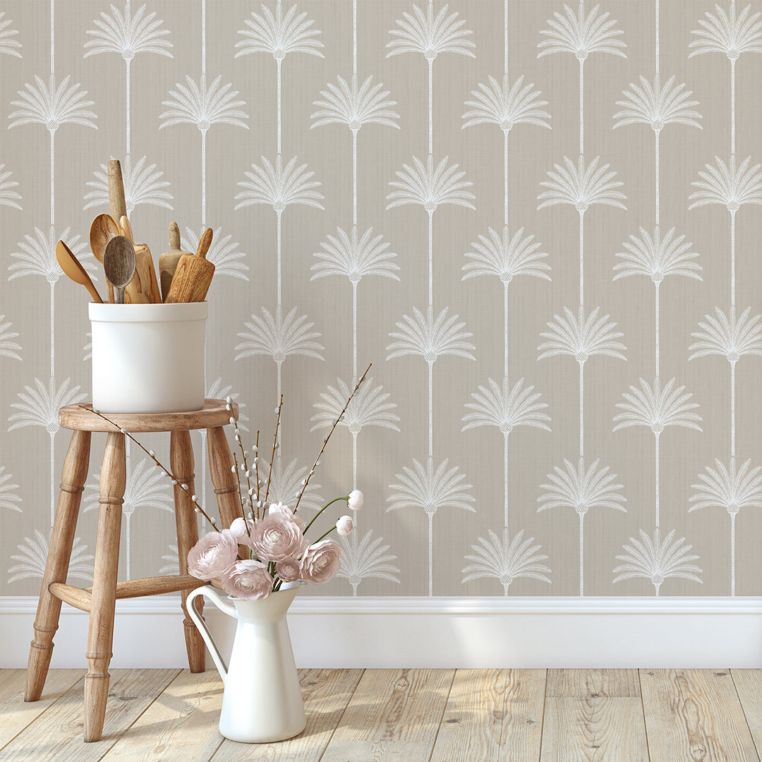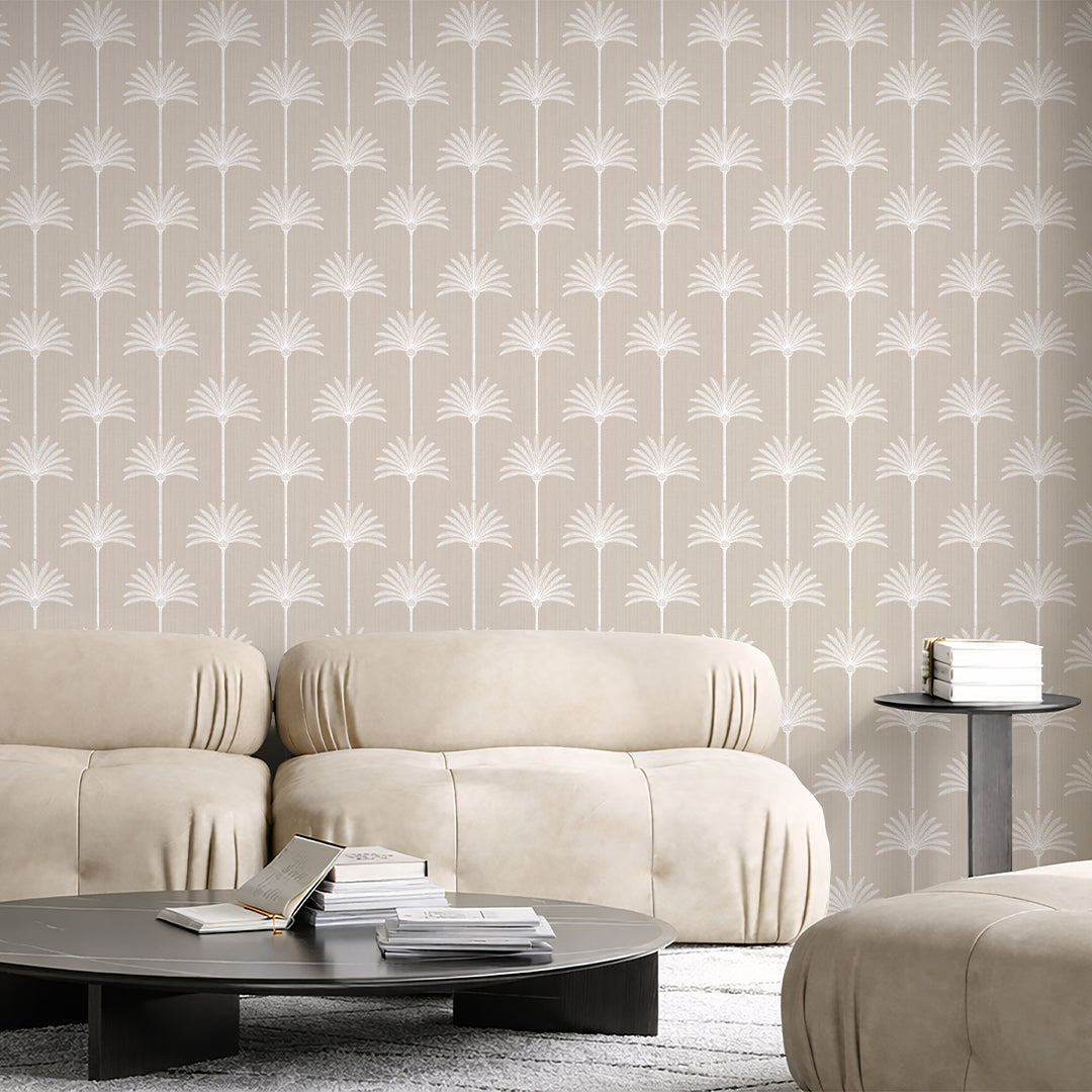 Warm beige palm tree wallpaper mural with white palms on a linen texture background, a neutral coastal tropical look for bedroom, bathroom, nursery, or living room. Removable peel and stick, temporary, self-adhesive, traditional unpasted wallpaper or pre-pasted wallpaper and Wall Murals - all materials are eco-friendly. Made in the USA. High-quality removable material, easy to apply and reposition for renters, home decorators and designers.