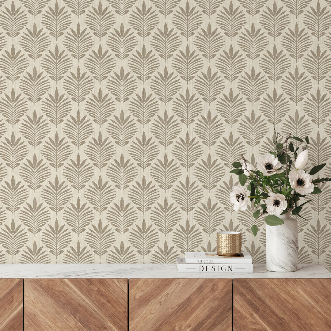 Beige taupe palm fan leaf wallpaper mural with a soft linen texture for boho or art deco rooms. Choose Removable peel and stick, temporary, self-adhesive, traditional unpasted wallpaper or pre-pasted wallpaper and Wall Murals - all materials are eco-friendly. Made in the USA. High-quality removable material is easy to apply and reposition, perfect for renters, home decorators and designers.