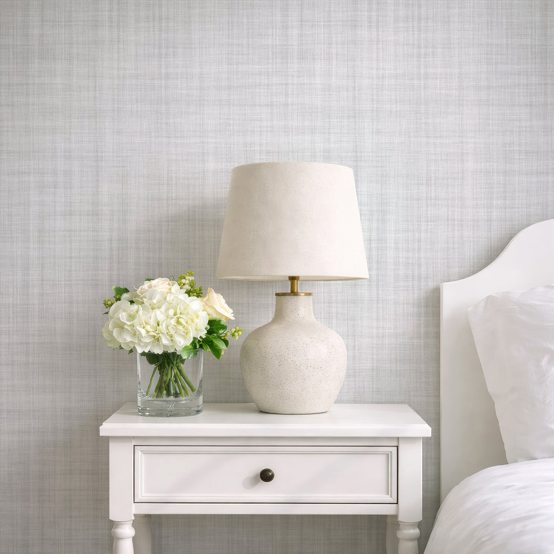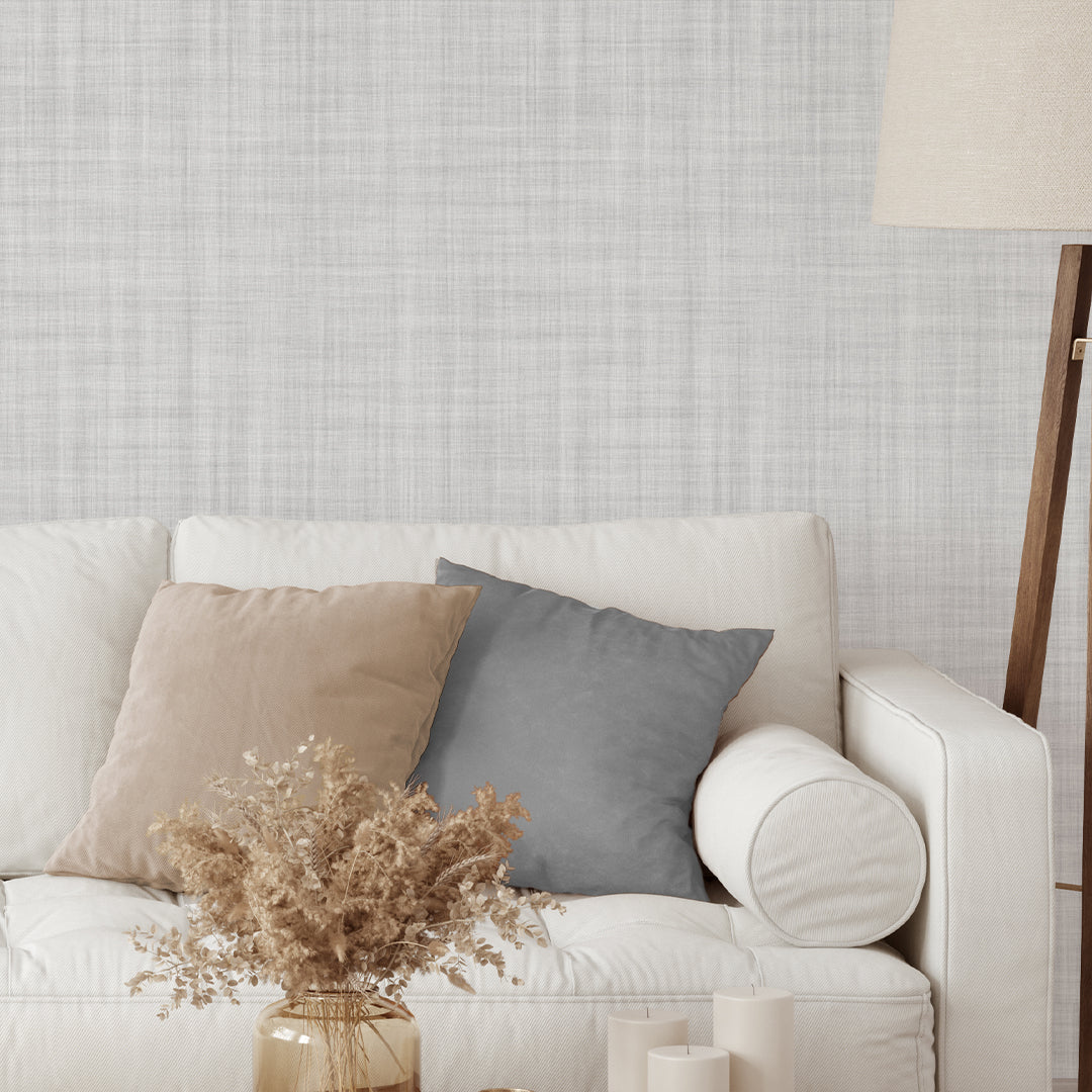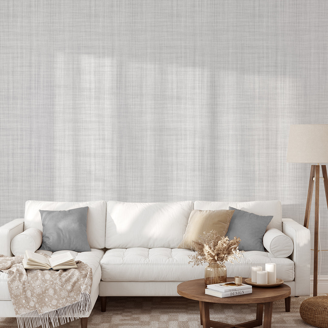 Modern minimalist linen-look wallpaper mural with a soft light gray woven crosshatch texture. Removable peel and stick, temporary, self-adhesive, traditional unpasted wallpaper or pre-pasted wallpaper and Wall Murals - all materials are eco-friendly. Made in the USA. High-quality removable material, easy to apply and reposition, ideal for renters, designers, nurseries, bedrooms and offices.