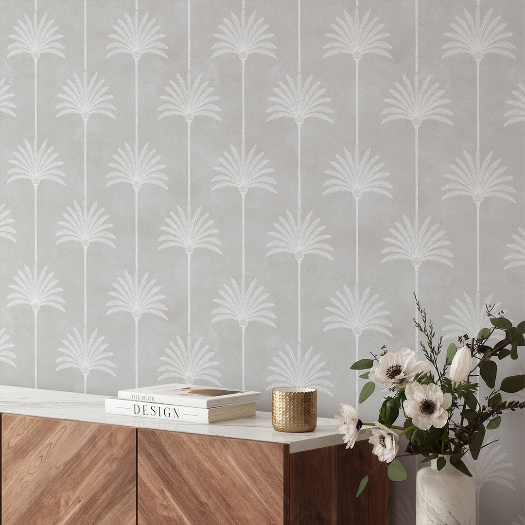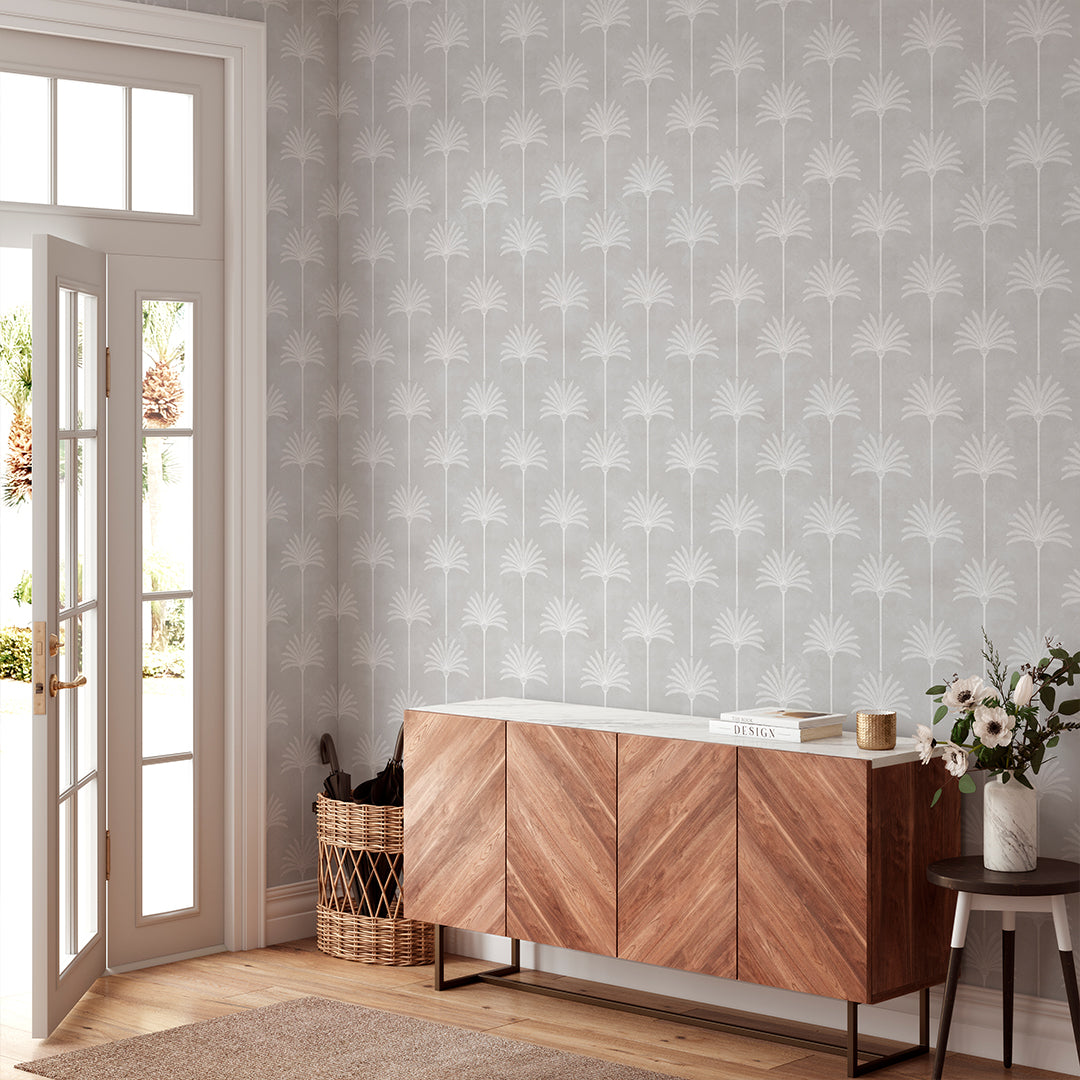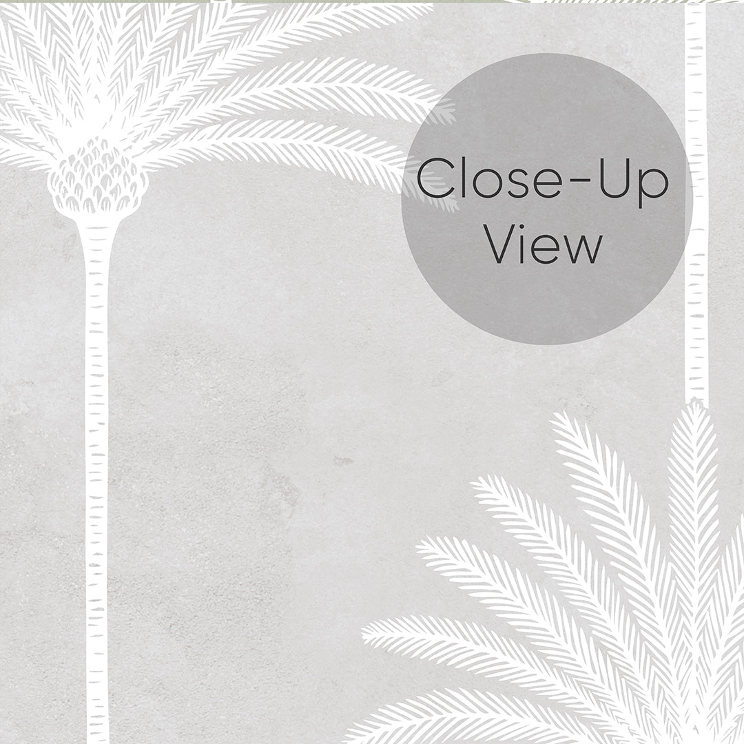Light gray palm tree wallpaper mural with white palms on a soft plaster texture background, a calm coastal tropical look for bedroom, bathroom, nursery, or living room. Removable peel and stick, temporary, self-adhesive, traditional unpasted wallpaper or pre-pasted wallpaper and Wall Murals - all materials are eco-friendly. Made in the USA. High-quality removable material, this wallpaper is easy to apply and reposition, making it suitable for renters and home decorators and designers.