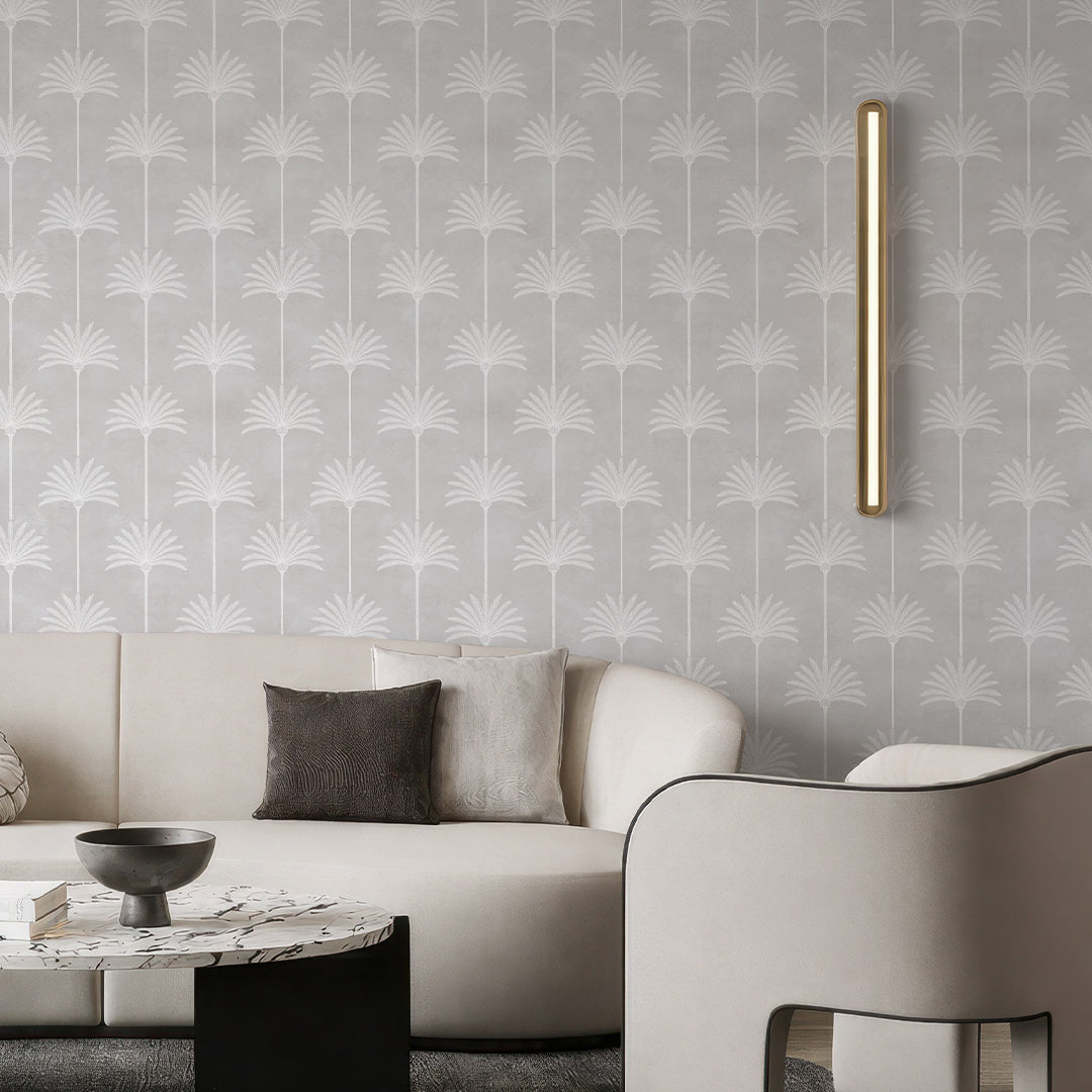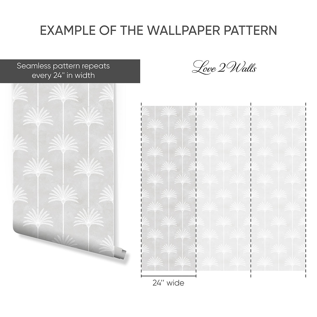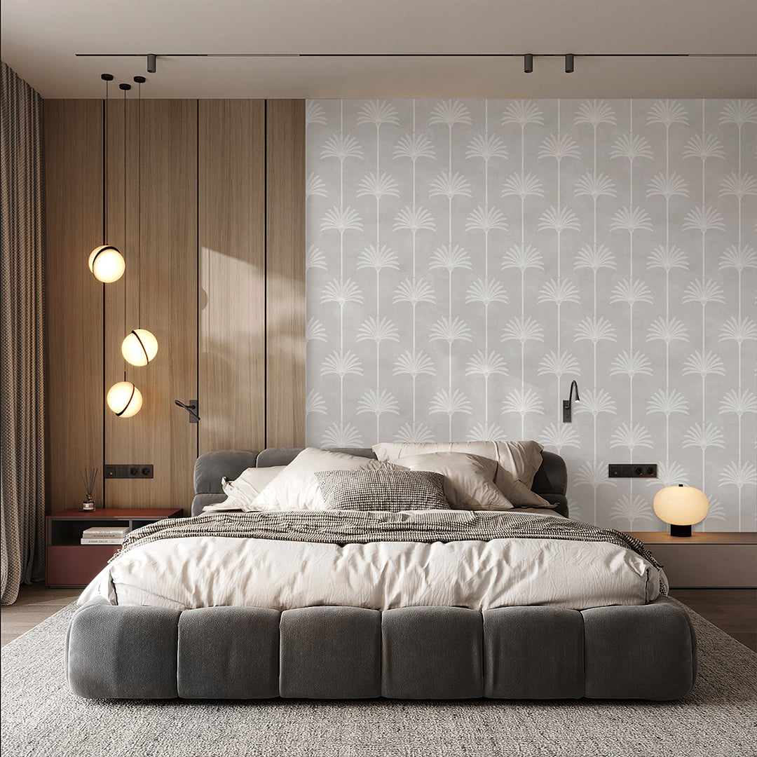 Light gray palm tree wallpaper mural with white palms on a soft plaster texture background, a calm coastal tropical look for bedroom, bathroom, nursery, or living room. Removable peel and stick, temporary, self-adhesive, traditional unpasted wallpaper or pre-pasted wallpaper and Wall Murals - all materials are eco-friendly. Made in the USA. High-quality removable material, this wallpaper is easy to apply and reposition, making it suitable for renters and home decorators and designers.