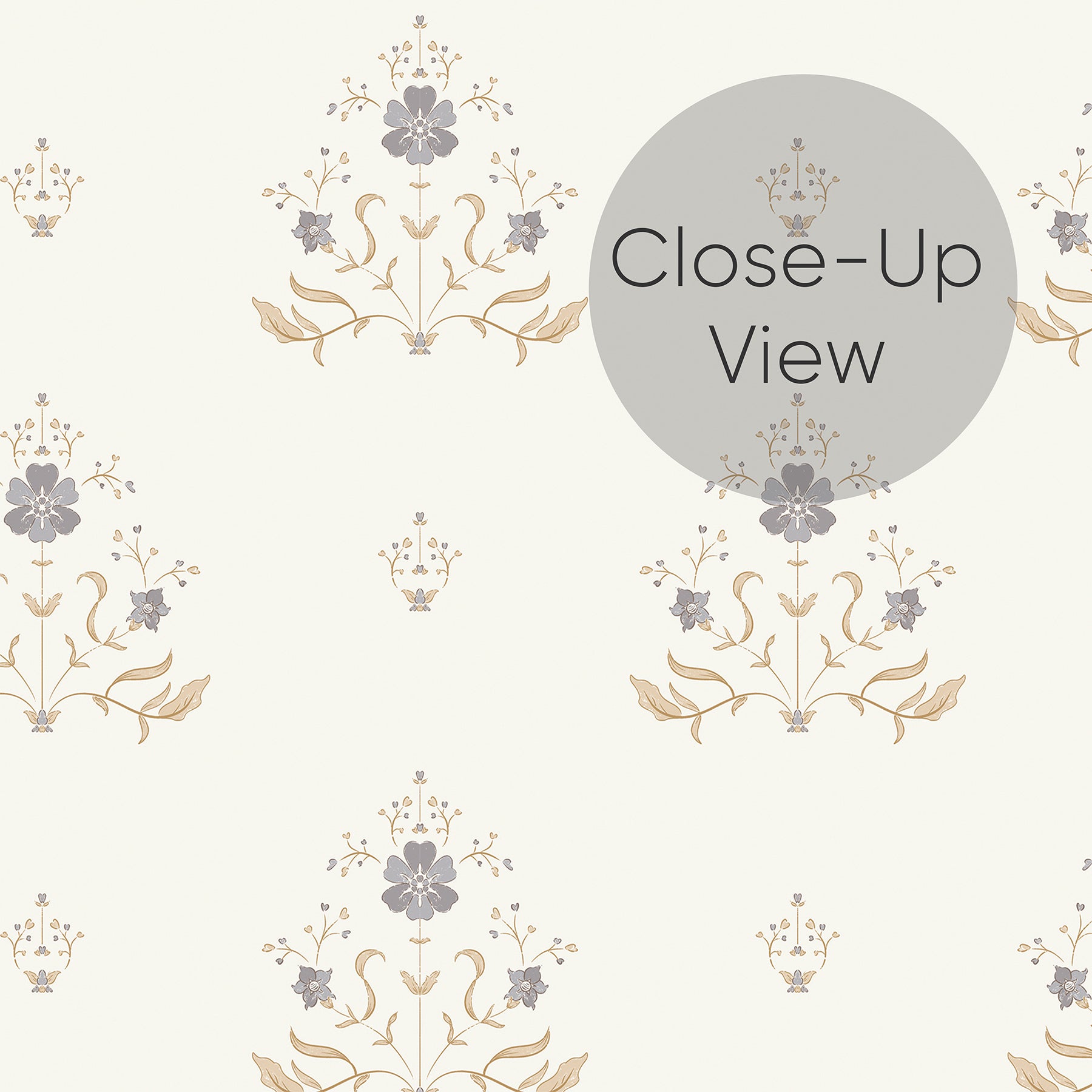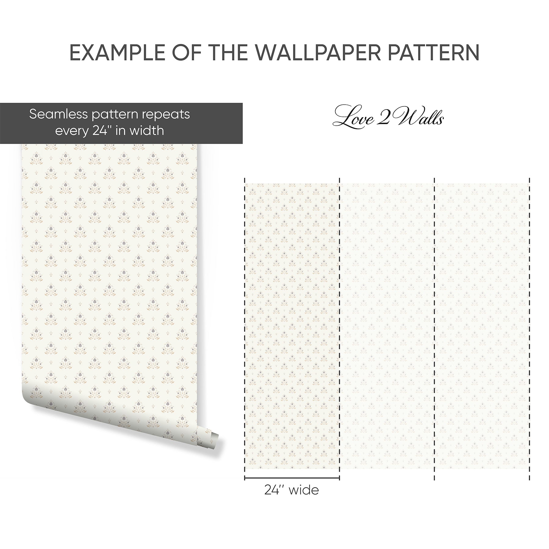 The sample shows the actual scale of the pattern, and a mini version showing how a full 24” x 48” sheet of wallpaper will look, to give you a better idea of the complete design pattern.