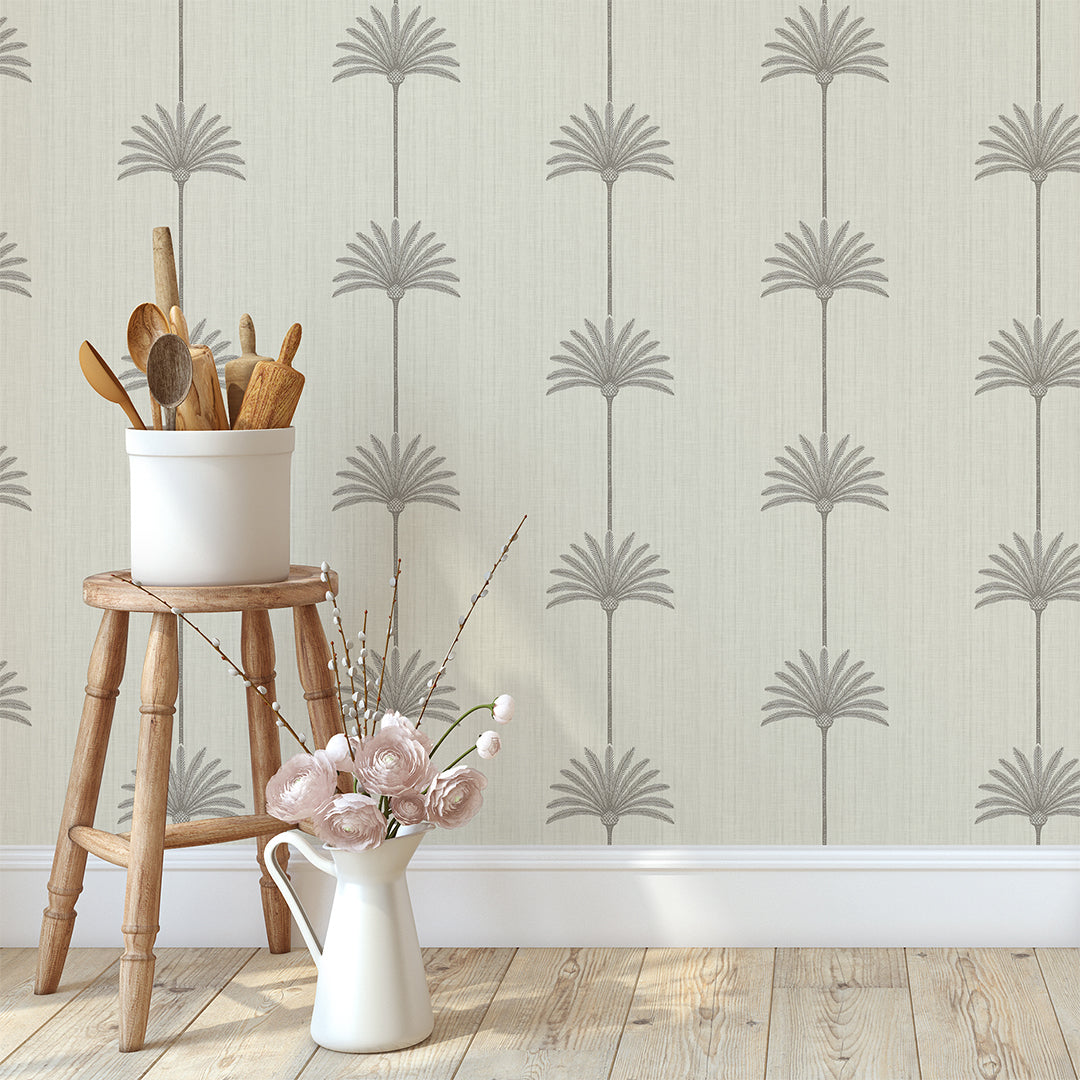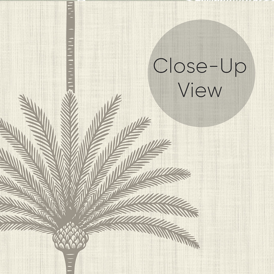 Neutral palm tree wallpaper mural on beige linen texture, soft gray tropical stripe for coastal, boho, beach house, nursery or bathroom walls. Removable peel and stick, temporary, self-adhesive, traditional unpasted wallpaper or pre-pasted wallpaper and Wall Murals - all materials are eco-friendly. Made in the USA. High-quality removable material, easy to apply and reposition for renters, home decorators and designers.