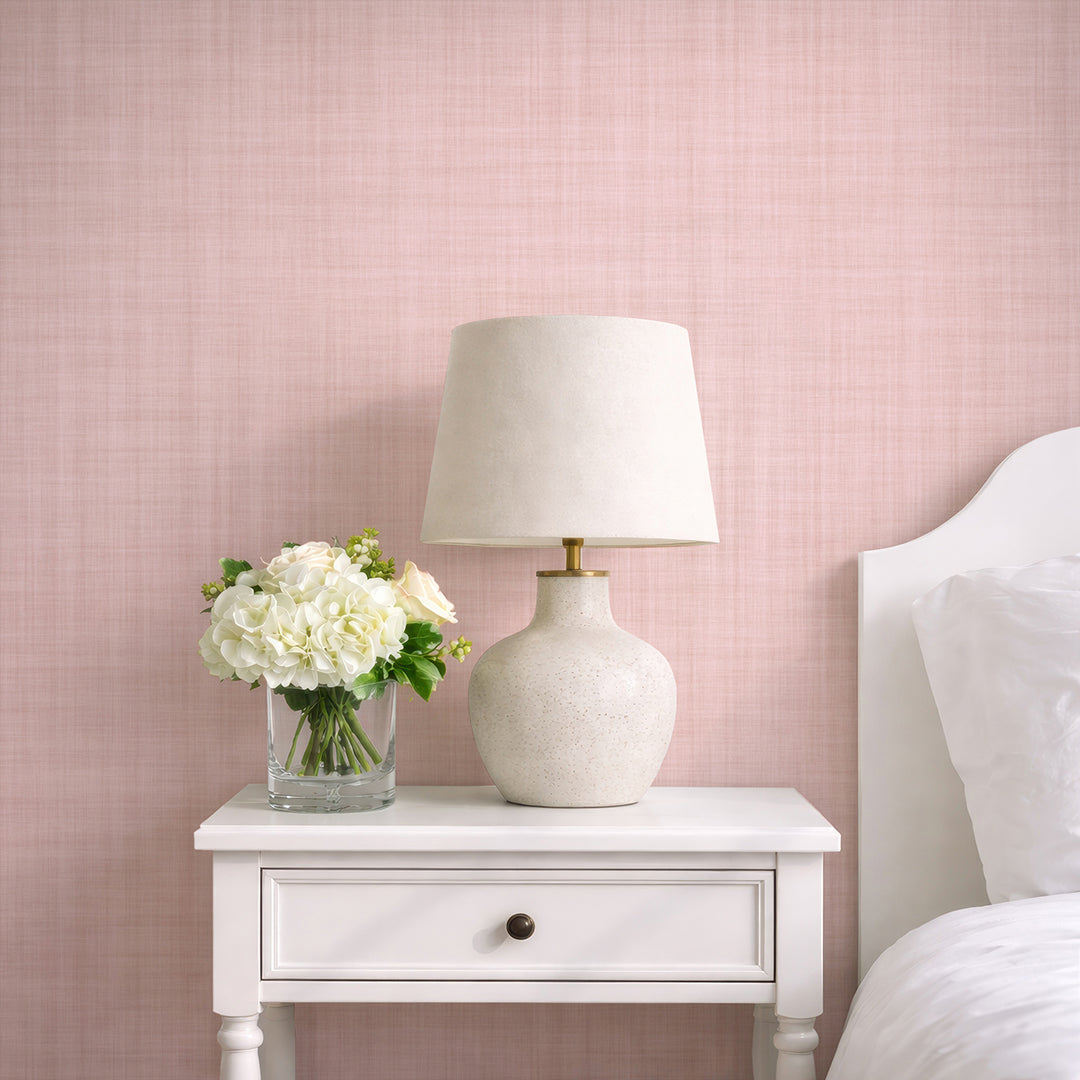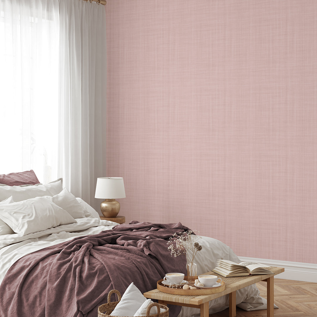 Peach pink linen texture wallpaper with a soft woven crosshatch look for modern minimalist interiors. Matte fabric-look finish. Removable peel and stick, temporary, self-adhesive, traditional unpasted wallpaper or pre-pasted wallpaper and Wall Murals - all materials are eco-friendly. Made in the USA. High-quality removable material, this wallpaper is easy to apply and reposition, making it suitable for renters and home decorators and designers.