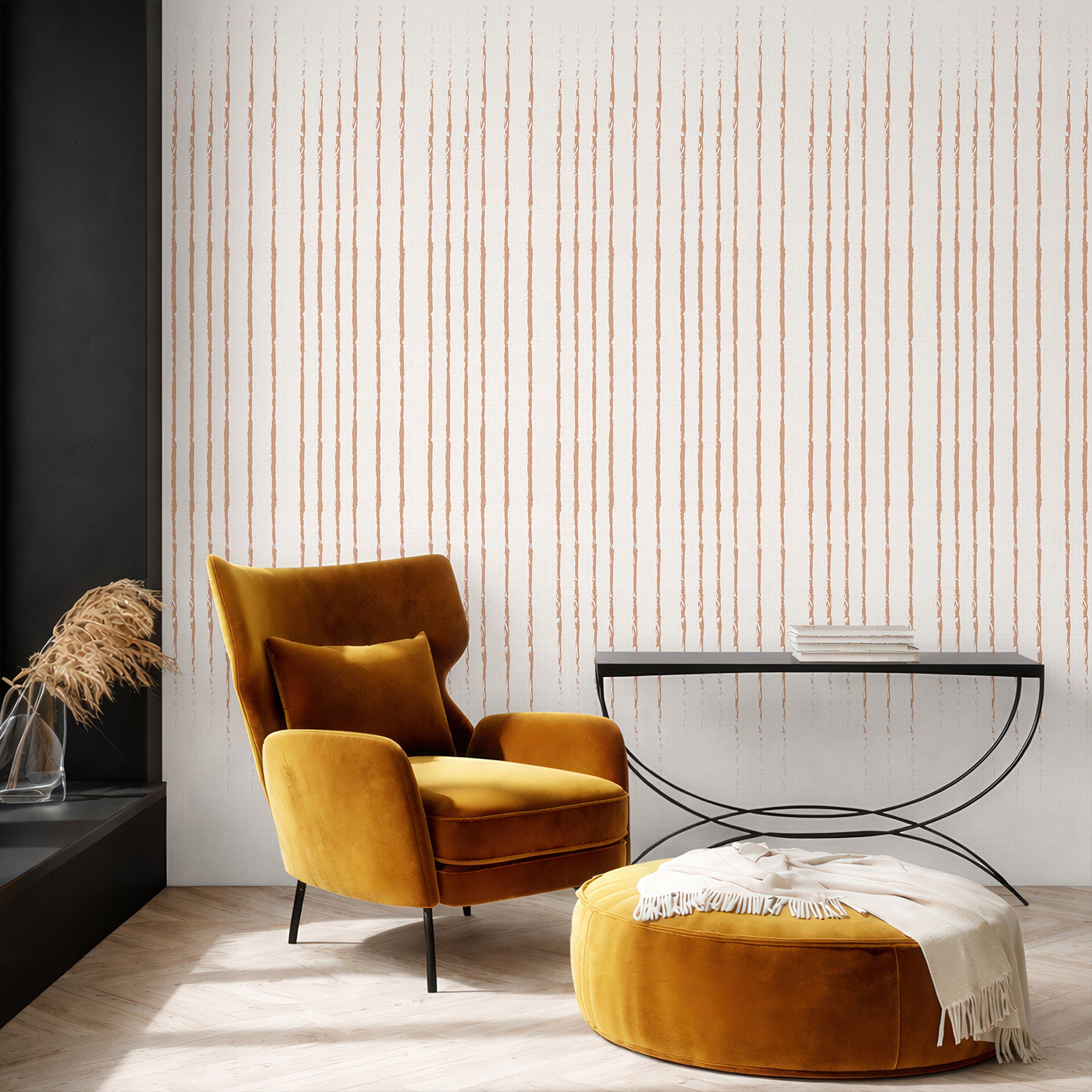 Warm soft orange vertical stripe mural on a linen-textured off-white background, perfect for modern minimalist, Scandinavian, wabi-sabi and boho neutral interiors. Great for bedroom, living room, nursery, hallway or office. Removable peel and stick, temporary, self-adhesive, traditional unpasted wallpaper or pre-pasted wallpaper and Wall Murals - all materials are eco-friendly. Made in the USA. High-quality removable material, easy to apply and reposition for renters, decorators and designers.