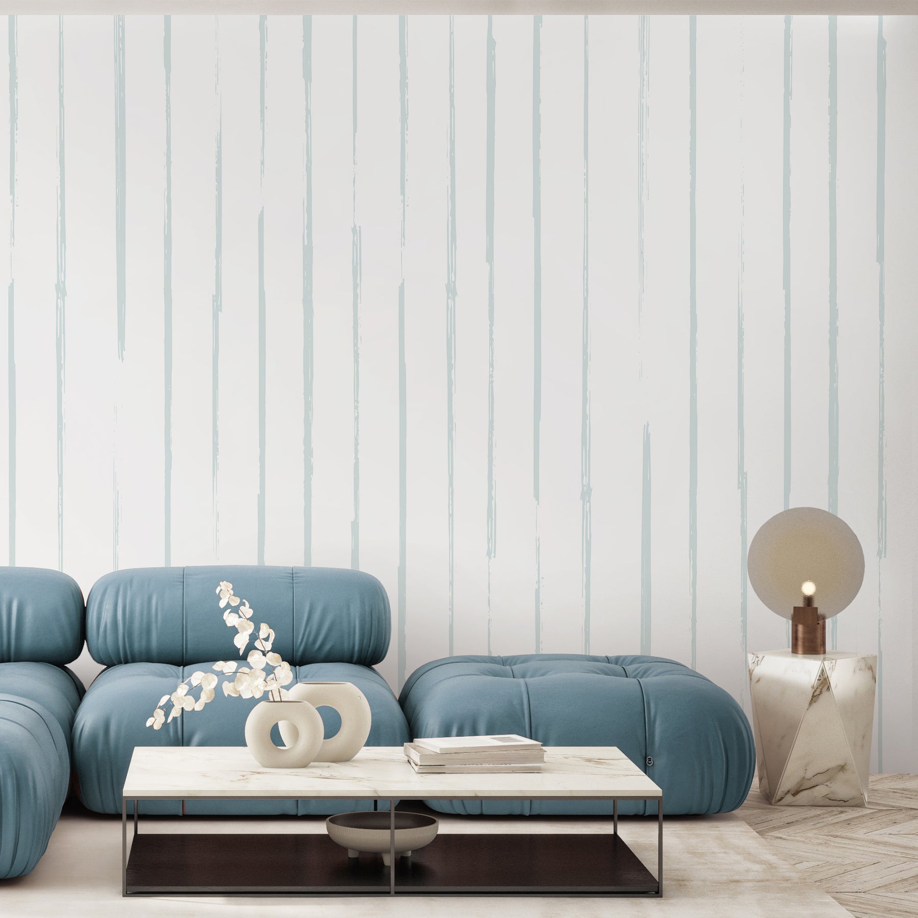 Pale blue green vertical stripe wallpaper mural with a hand-painted brush stroke look for coastal, Scandinavian, and Japandi spaces. Removable peel and stick, temporary, self-adhesive, traditional unpasted wallpaper or pre-pasted wallpaper and Wall Murals - all materials are eco-friendly. Made in the USA. High-quality removable material, this wallpaper is easy to apply and reposition, making it suitable for renters and home decorators and designers.