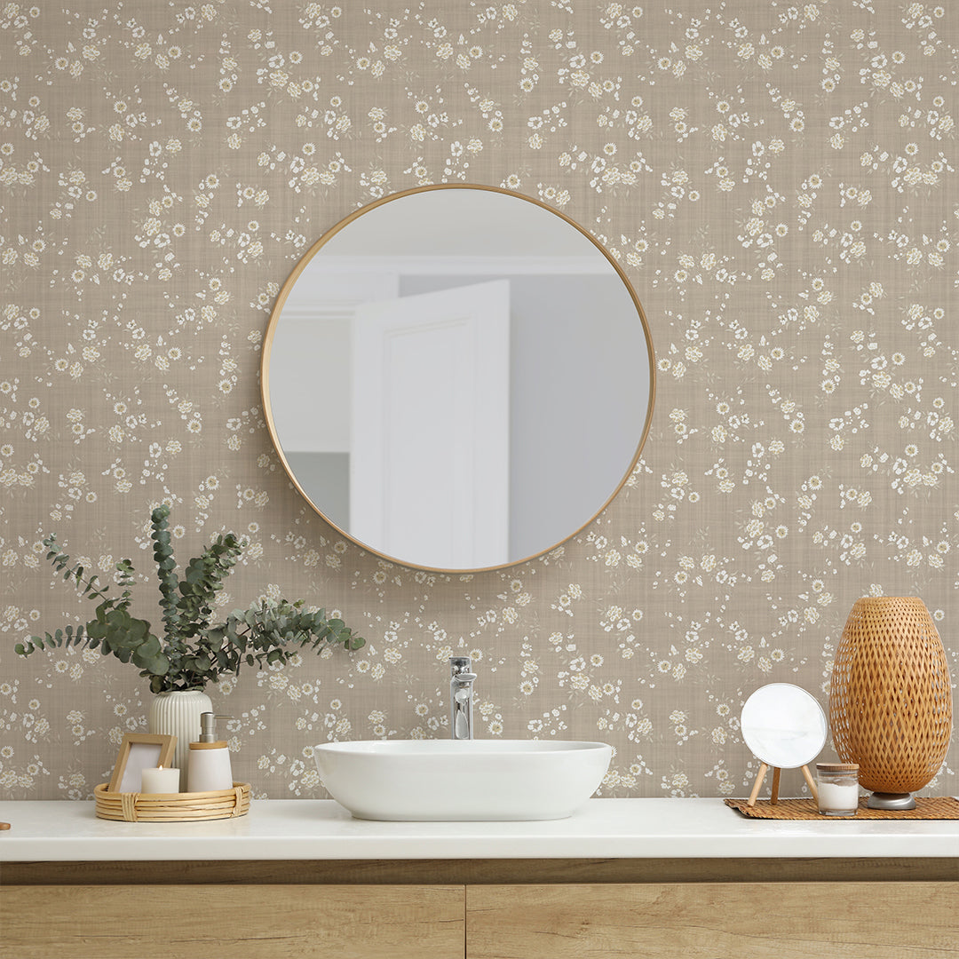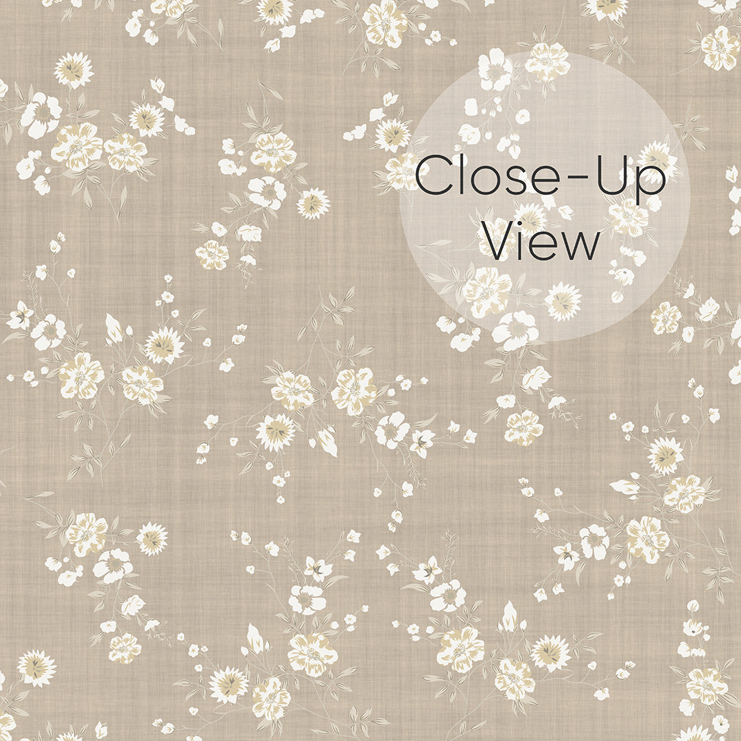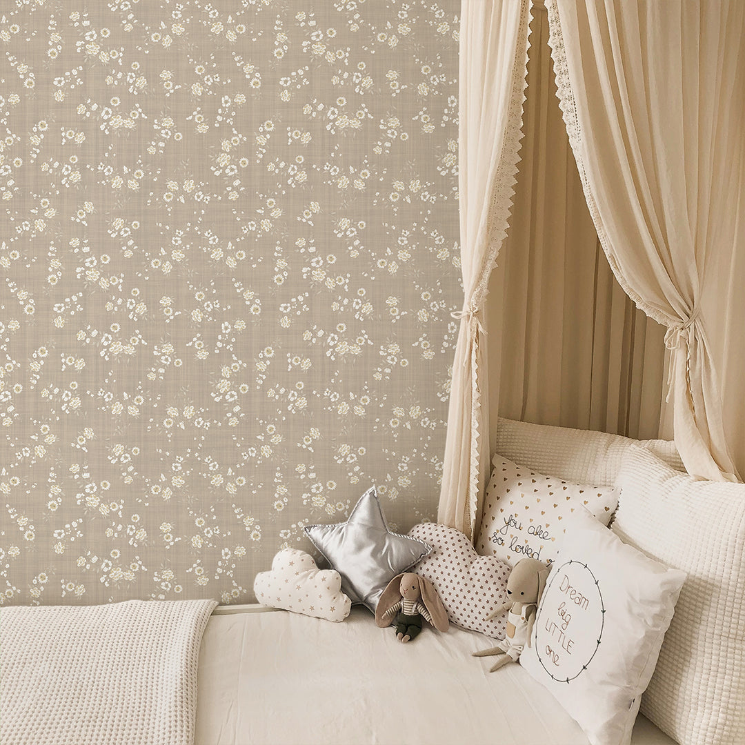 Soft beige floral wallpaper mural with tiny white blossoms for a calm neutral room. Removable peel and stick, temporary, self-adhesive. Also available as traditional unpasted wallpaper or pre-pasted wallpaper. Wall Murals - all materials are eco-friendly. Made in the USA. High-quality removable material, this wallpaper is easy to apply and reposition, ideal for renters, home decorators and designers.