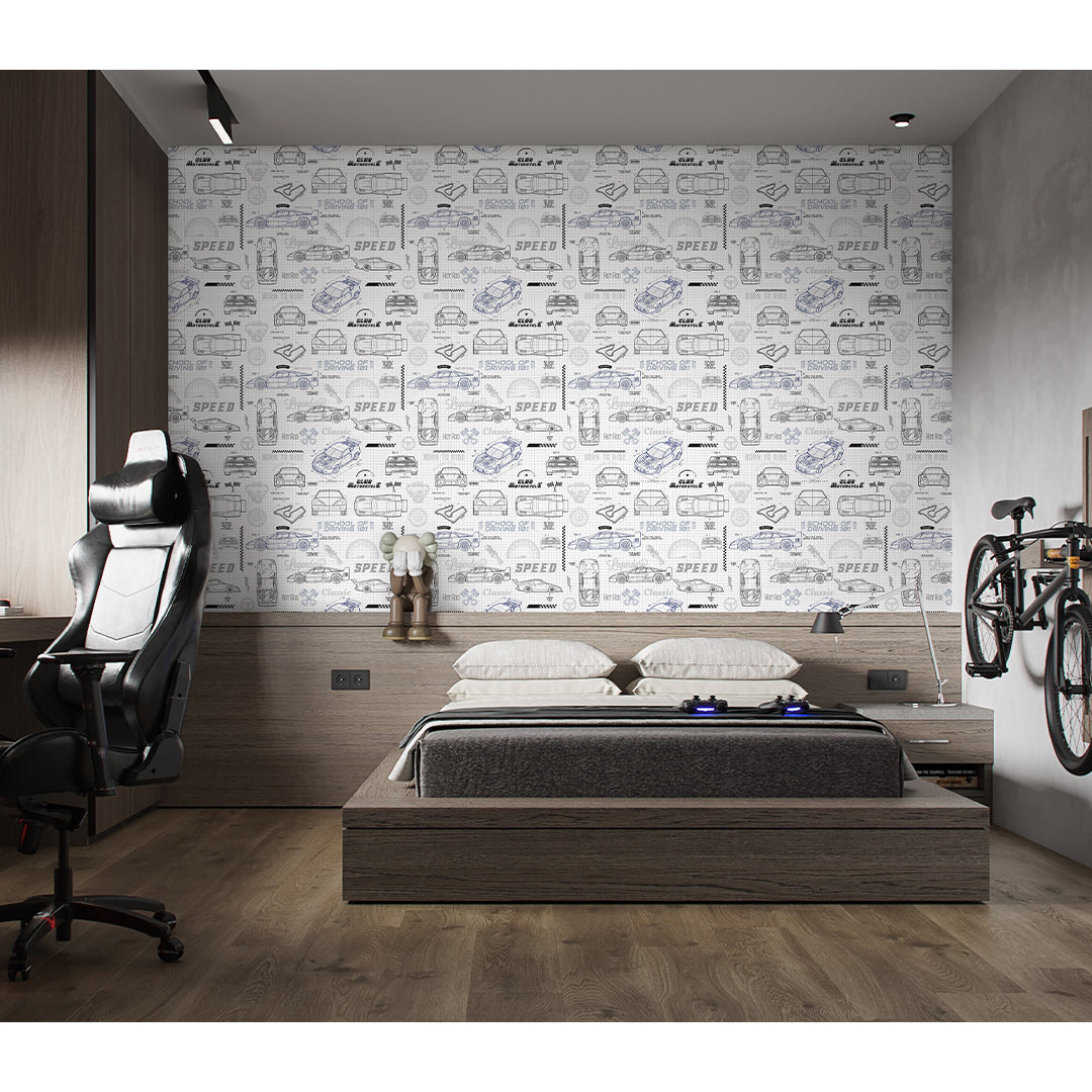 Self Adhesive Temporary Removable Vinyl Wallpaper Or Polyester Fabric Peel and Stick Wallpaper Race Car Blueprint with Sketch Style Sports Cars on a Grid Background.