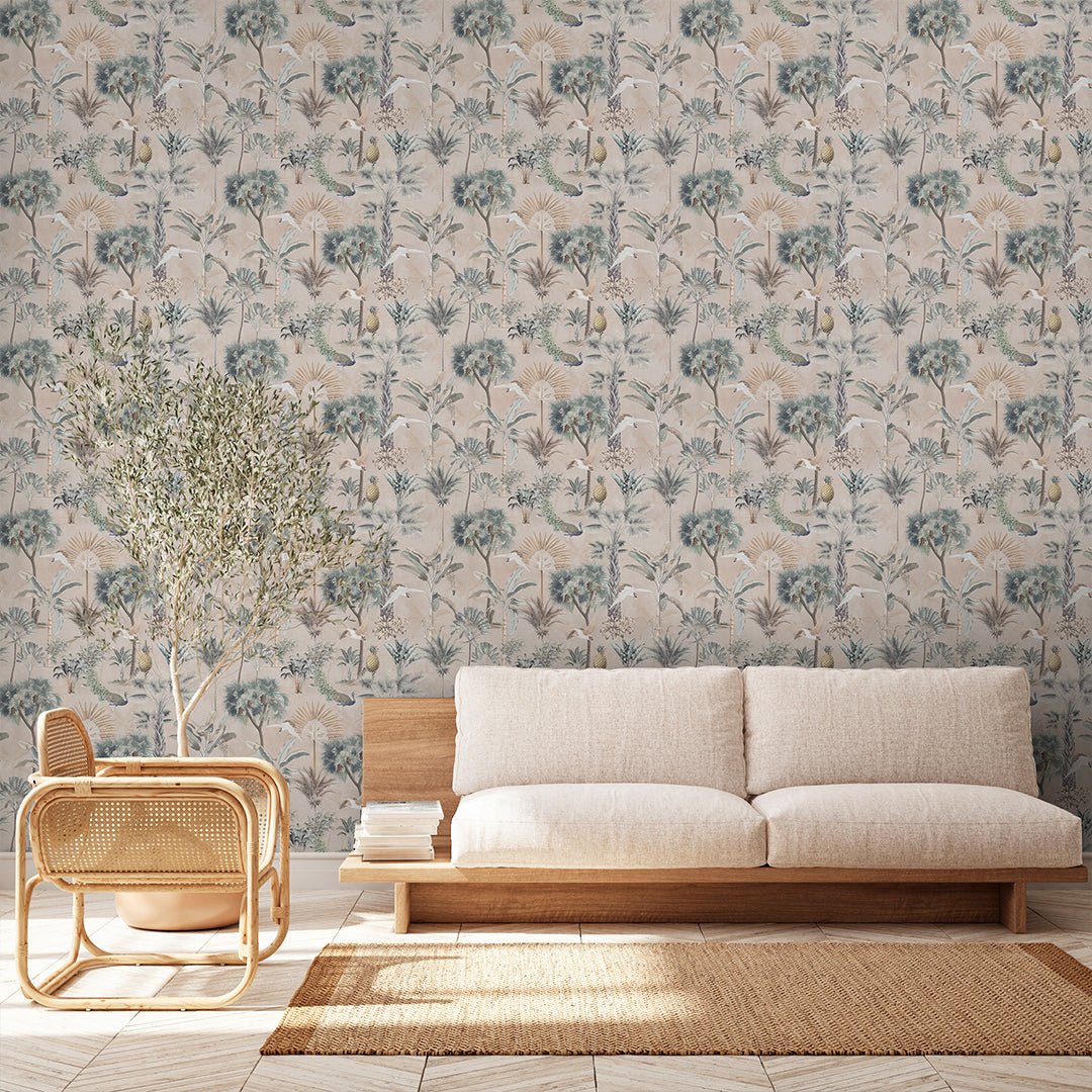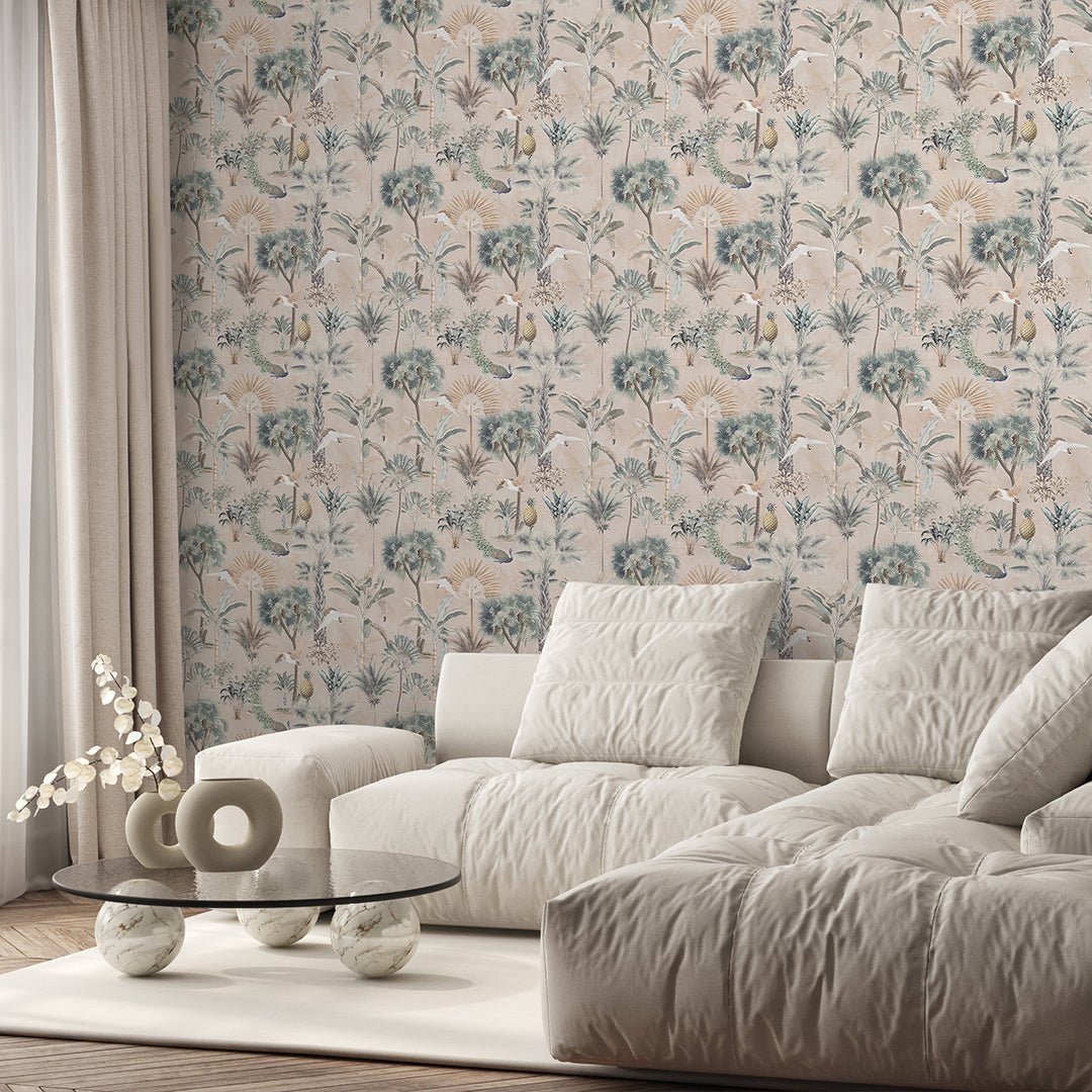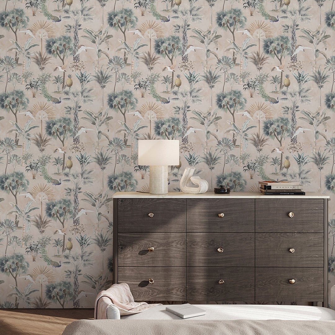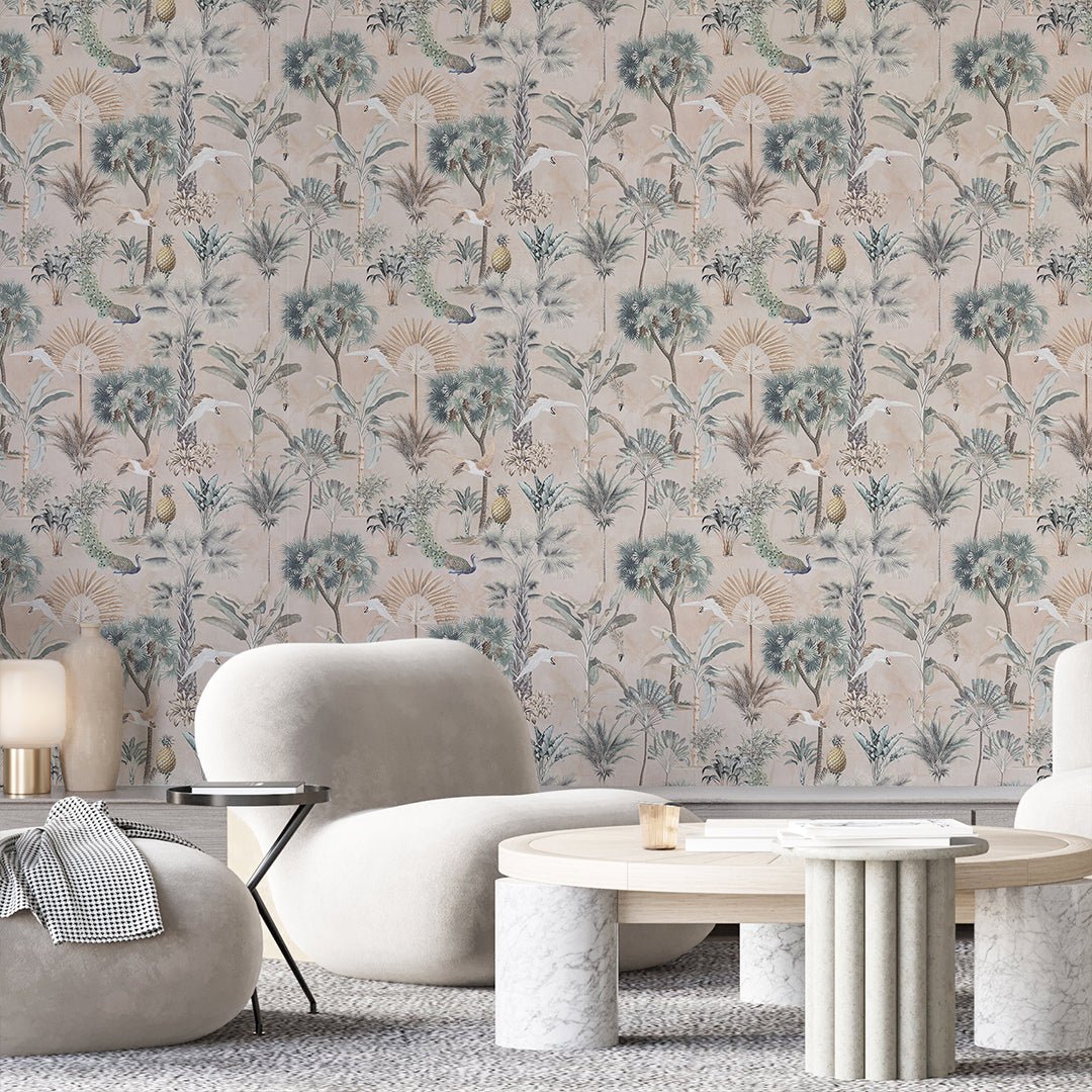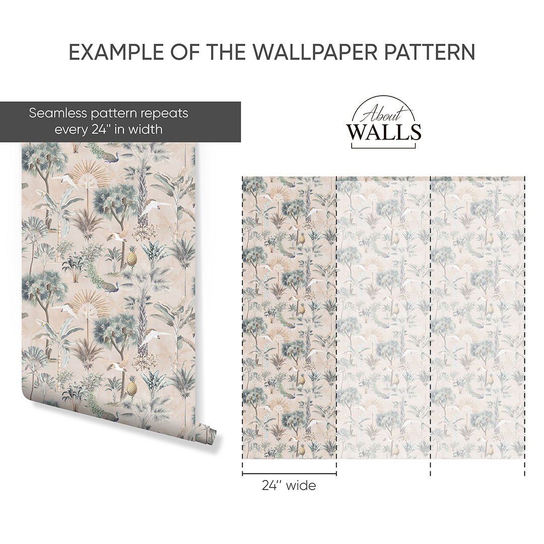 Self Adhesive Temporary Removable Vinyl Wallpaper Or Polyester Fabric Peel and Stick Wallpaper Vintage Beige Tropical Jungle with Palm Trees Peacocks White Birds and Pineapples. Botanical Coastal Pattern Fabric Wallcovering.