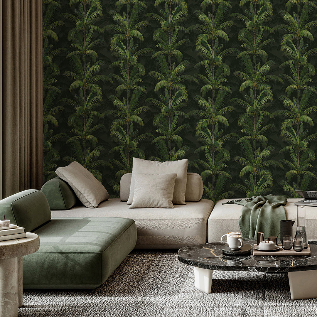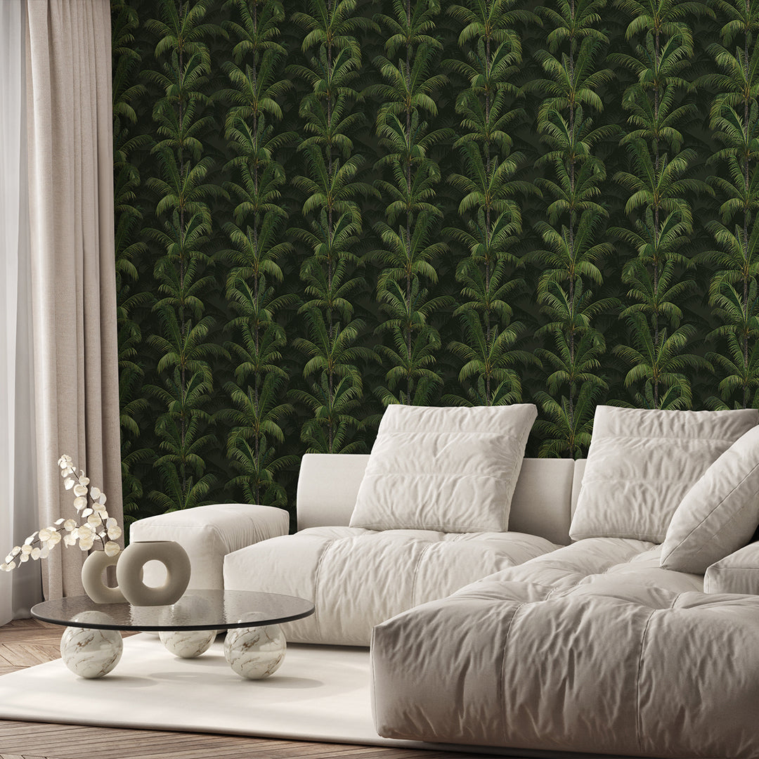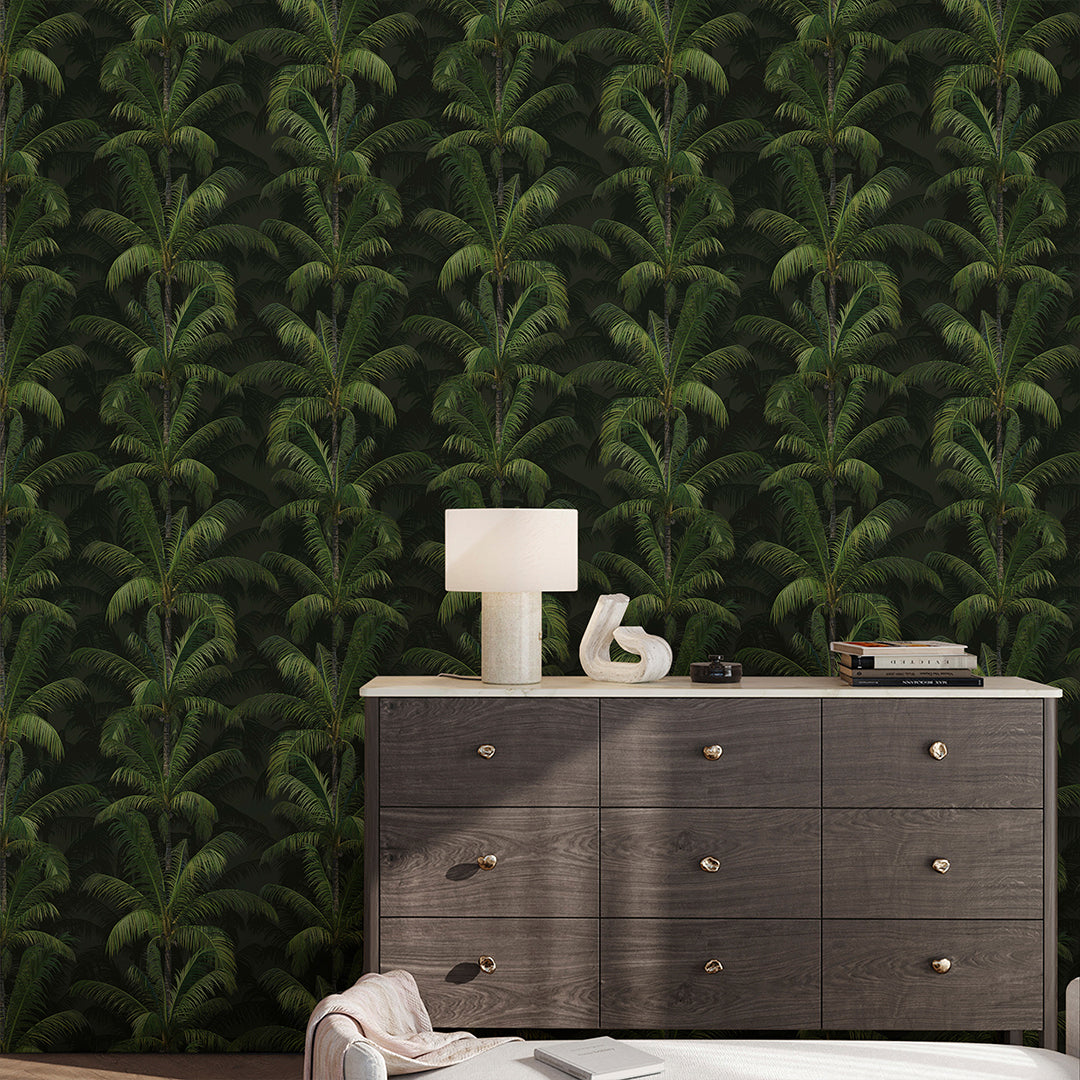 Dark tropical palm wallpaper mural with layered jungle fronds on a deep green background for a moody coastal or boho accent wall. Removable peel and stick, temporary, self-adhesive, traditional unpasted wallpaper or pre-pasted wallpaper and Wall Murals - all materials are eco-friendly. Made in the USA. High-quality removable material, this wallpaper is easy to apply and reposition, making it suitable for renters and home decorators and designers.