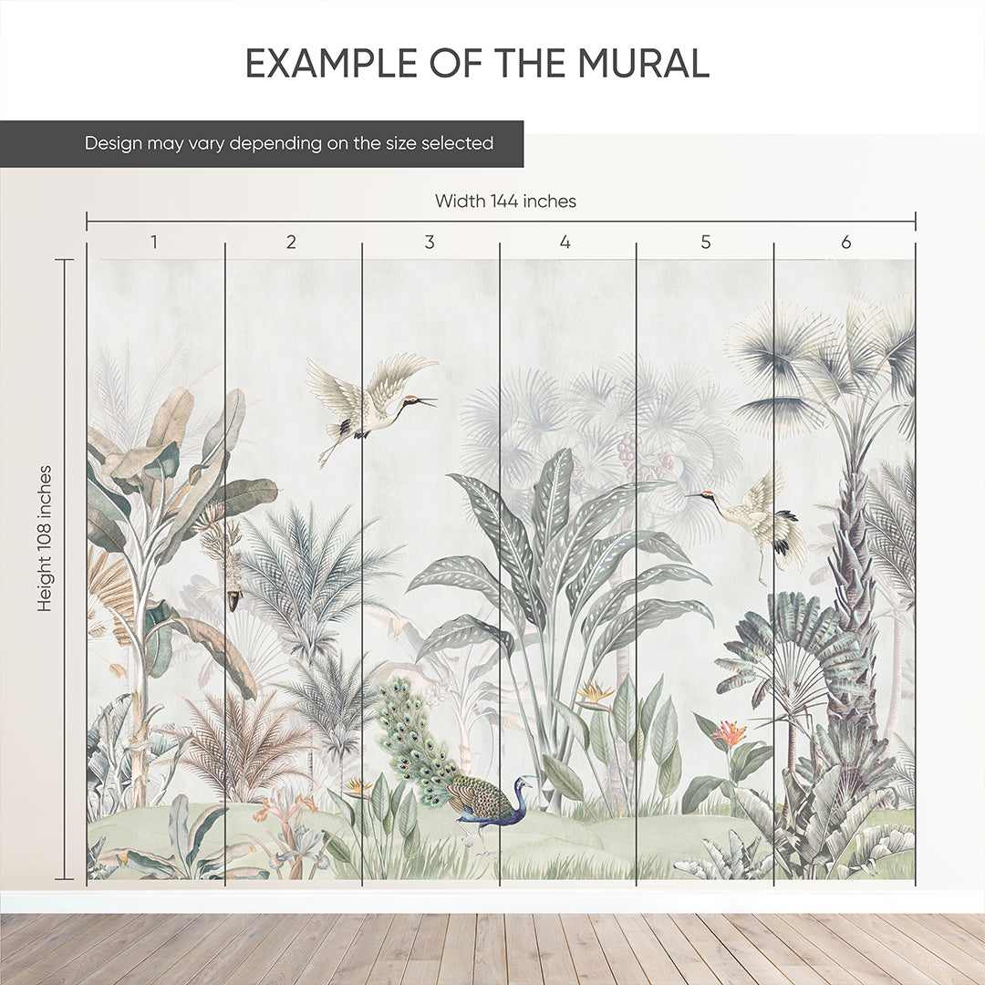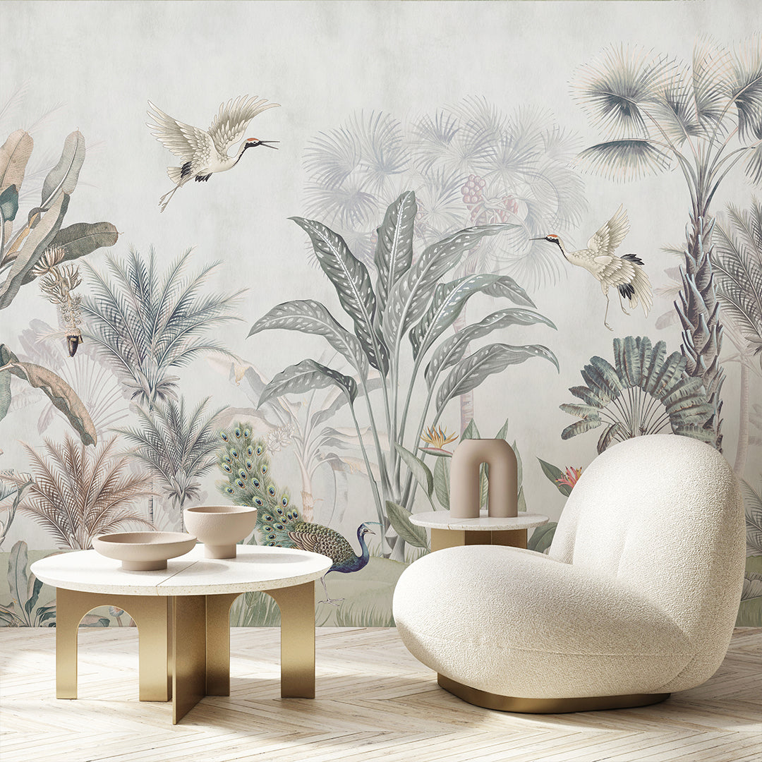 Tropical Wall Murals featuring peacock and birds with lush botanicals in gray and light green tones. Removable peel and stick, temporary, self-adhesive, traditional unpasted wallpaper or pre-pasted wallpaper. Wall Murals - all materials are eco-friendly. Made in the USA. High-quality removable material, this wallpaper is easy to apply and reposition, making it suitable for renters and home decorators and designers.