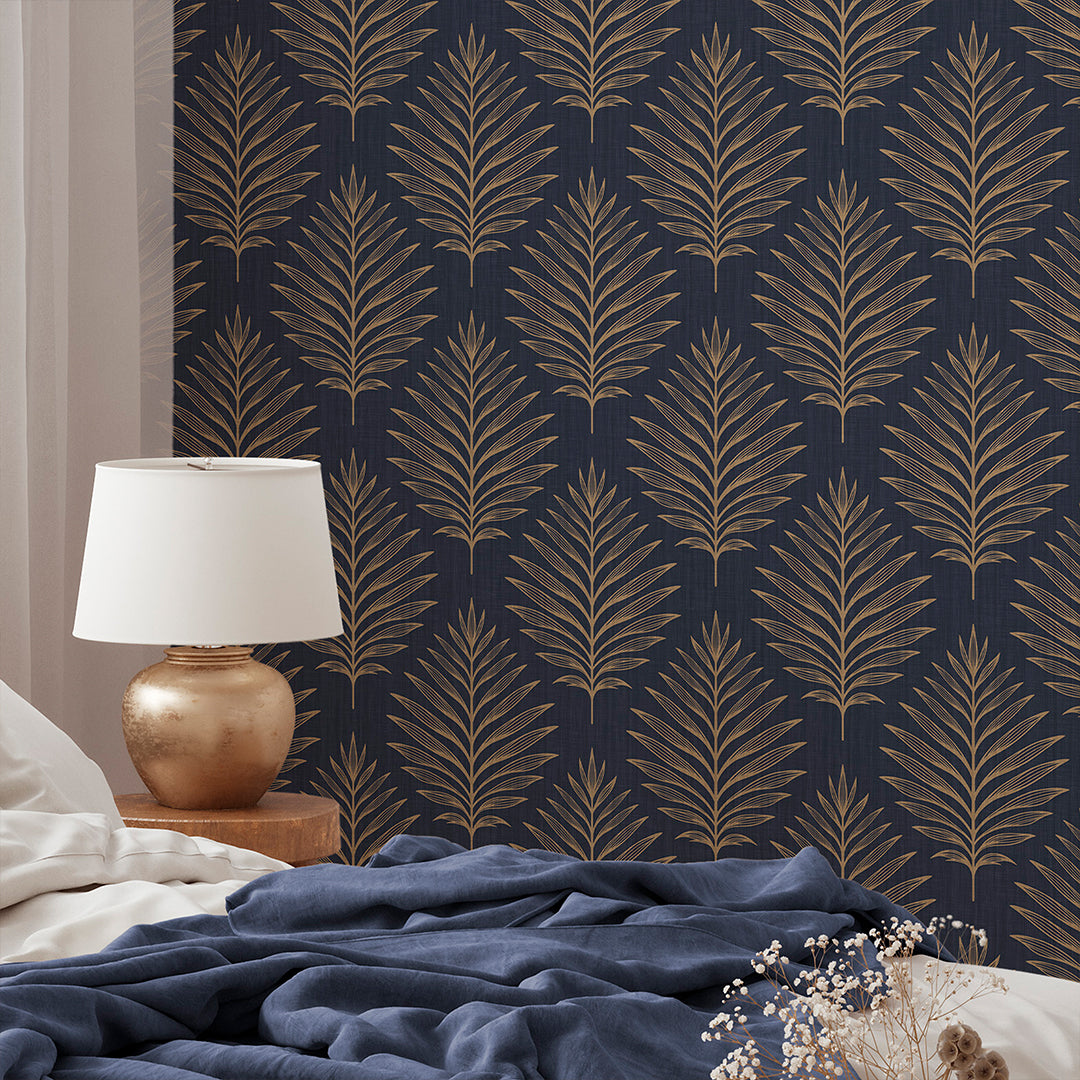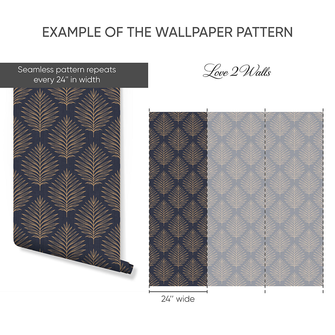 Deep navy blue wallpaper mural with beige palm leaves for a clean, modern tropical look. Removable peel and stick, temporary, self-adhesive, traditional unpasted wallpaper or pre-pasted wallpaper and Wall Murals - all materials are eco-friendly. Made in the USA. High-quality removable material, easy to apply and reposition for renters, home decorators and designers. Perfect for accent walls in living rooms, bedrooms, entryways, offices, or baths.
