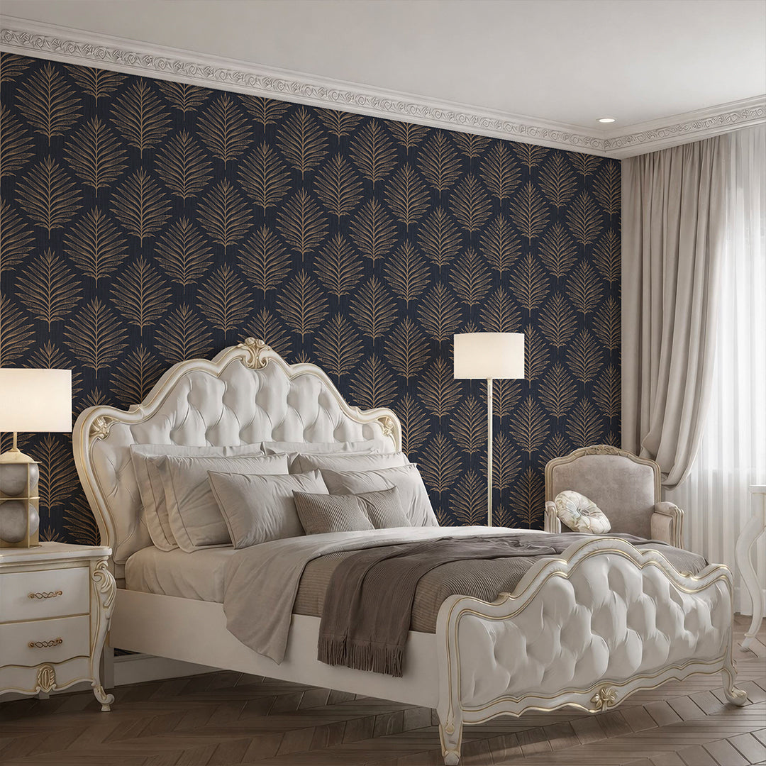 Navy Blue Palm Leaves Wallpaper L059