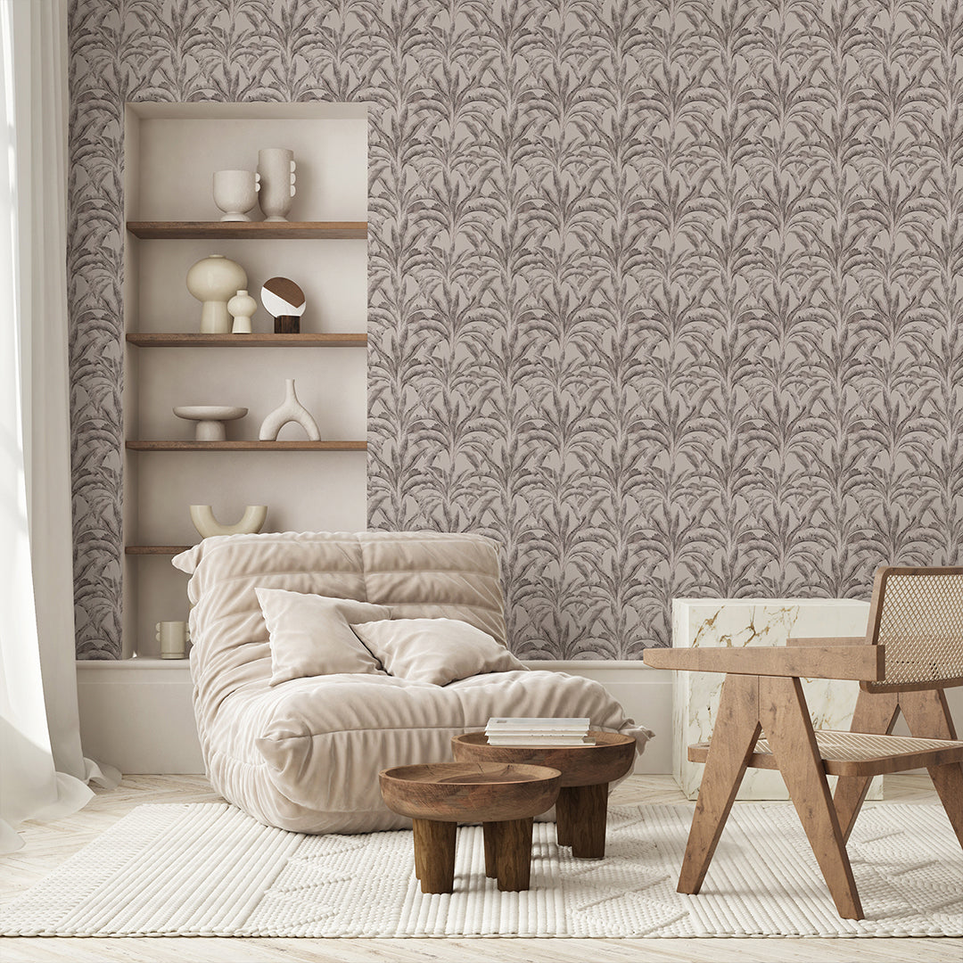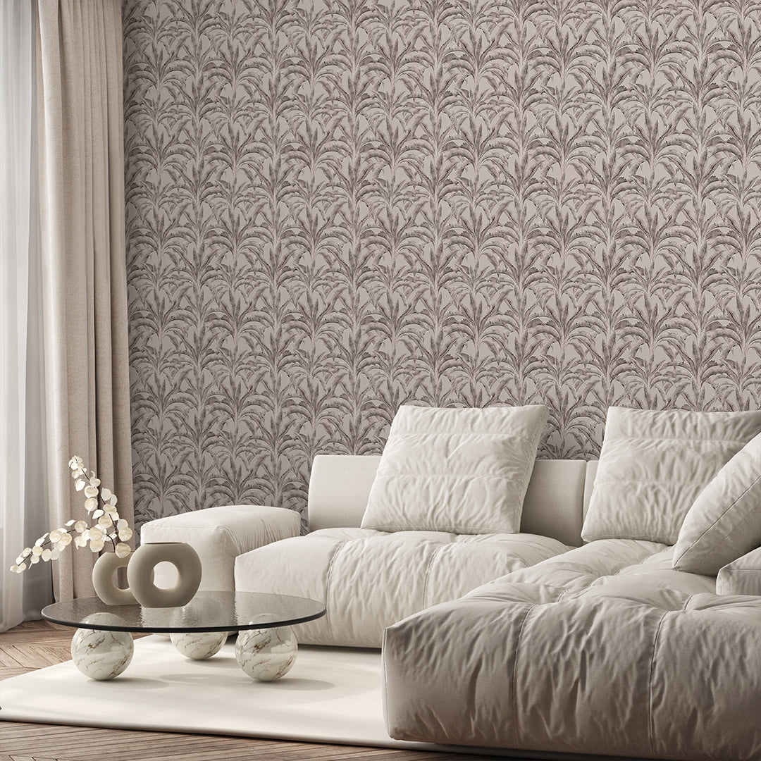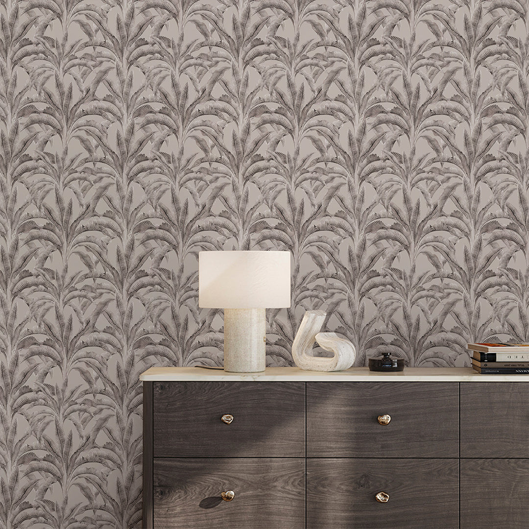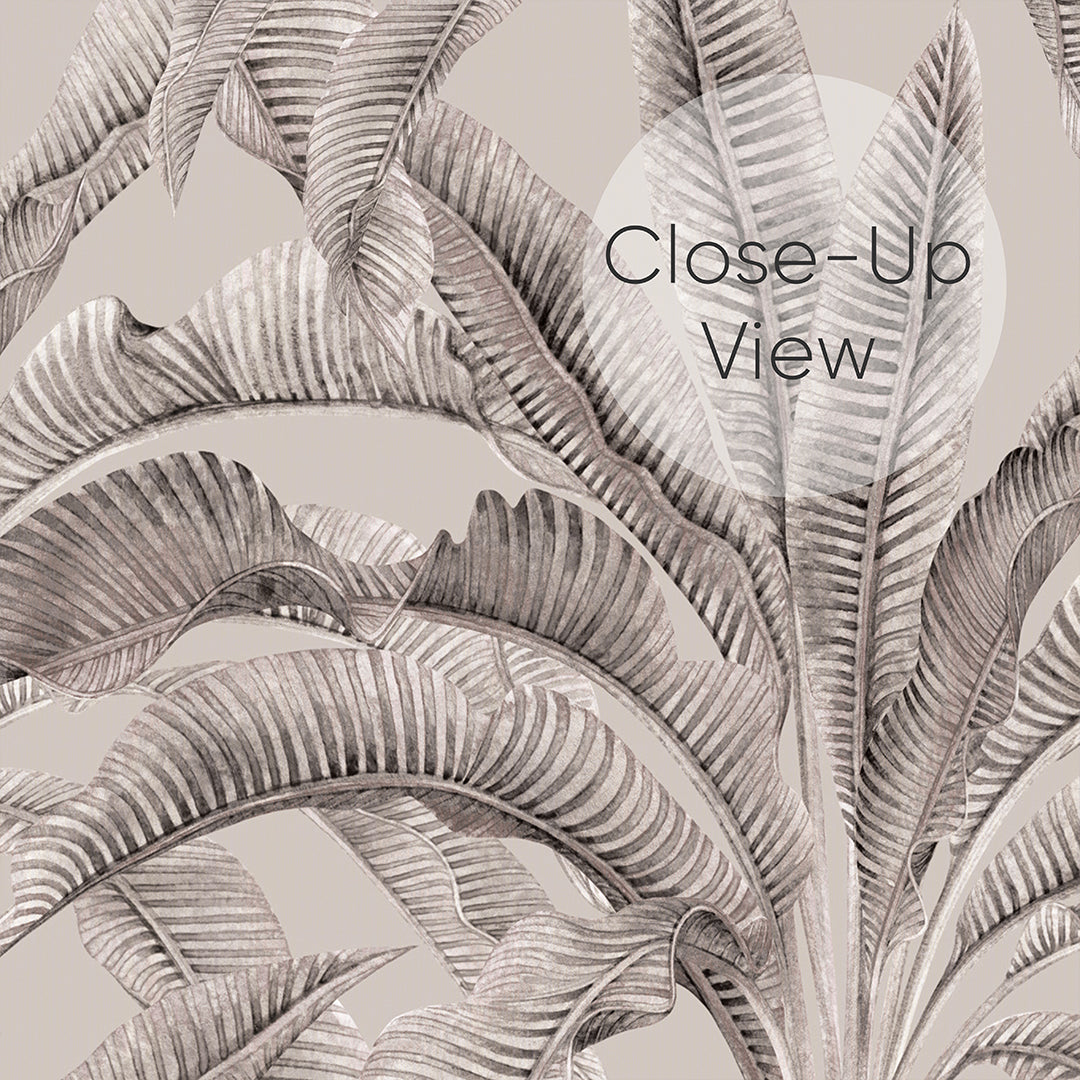 Neutral banana leaf wallpaper mural in warm gray (greige) on a soft beige background for a calm modern tropical look. Removable peel and stick, temporary, self-adhesive, or unpasted wallpaper or pre-pasted wallpaper options. Wall Murals made with eco-friendly materials. Made in the USA. High-quality removable material is easy to apply and reposition ideal for renters, home decorators, and designers.