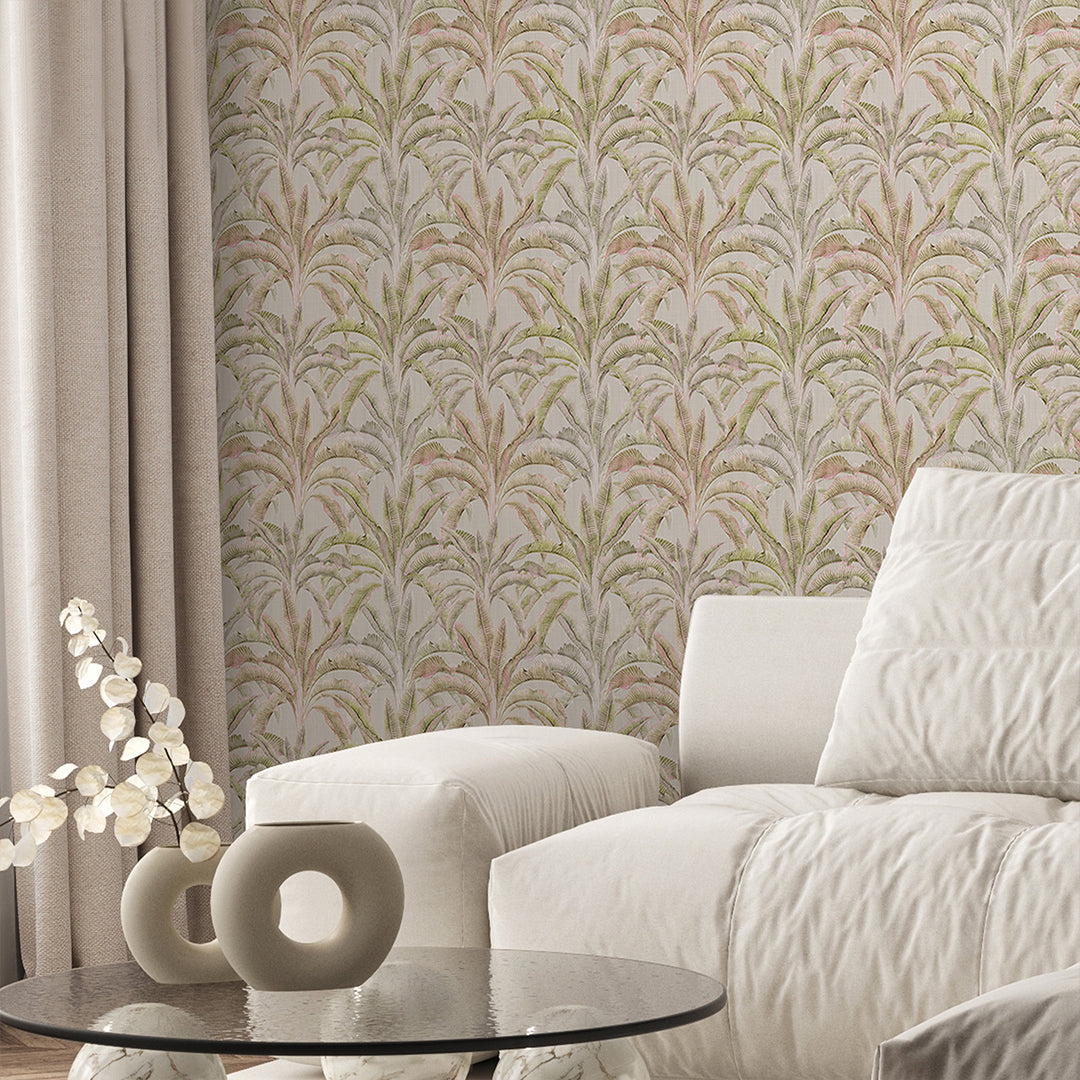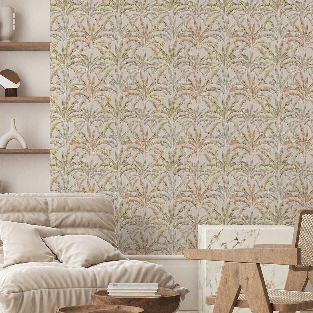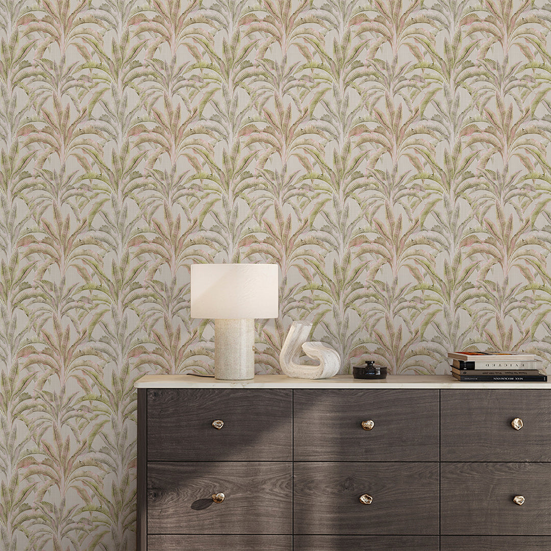 Soft pastel banana leaves in muted sage with gentle blush accents on a light plaster-texture background—calm modern tropical style for any room. Removable peel and stick, temporary, self-adhesive, traditional unpasted wallpaper or pre-pasted wallpaper and Wall Murals - all materials are eco-friendly. Made in the USA. High-quality removable material, this wallpaper is easy to apply and reposition, making it suitable for renters and home decorators and designers.