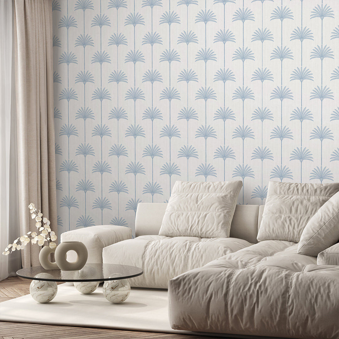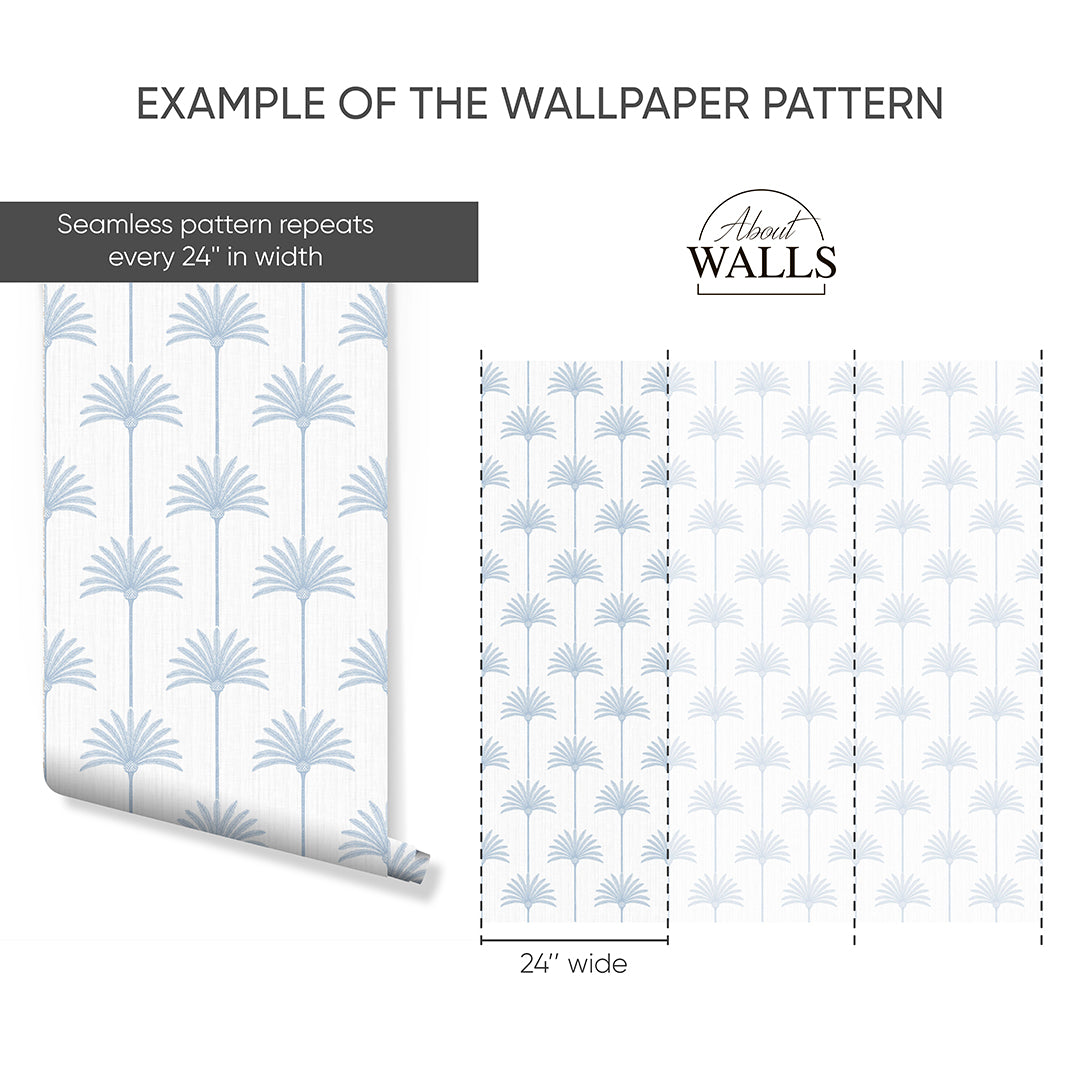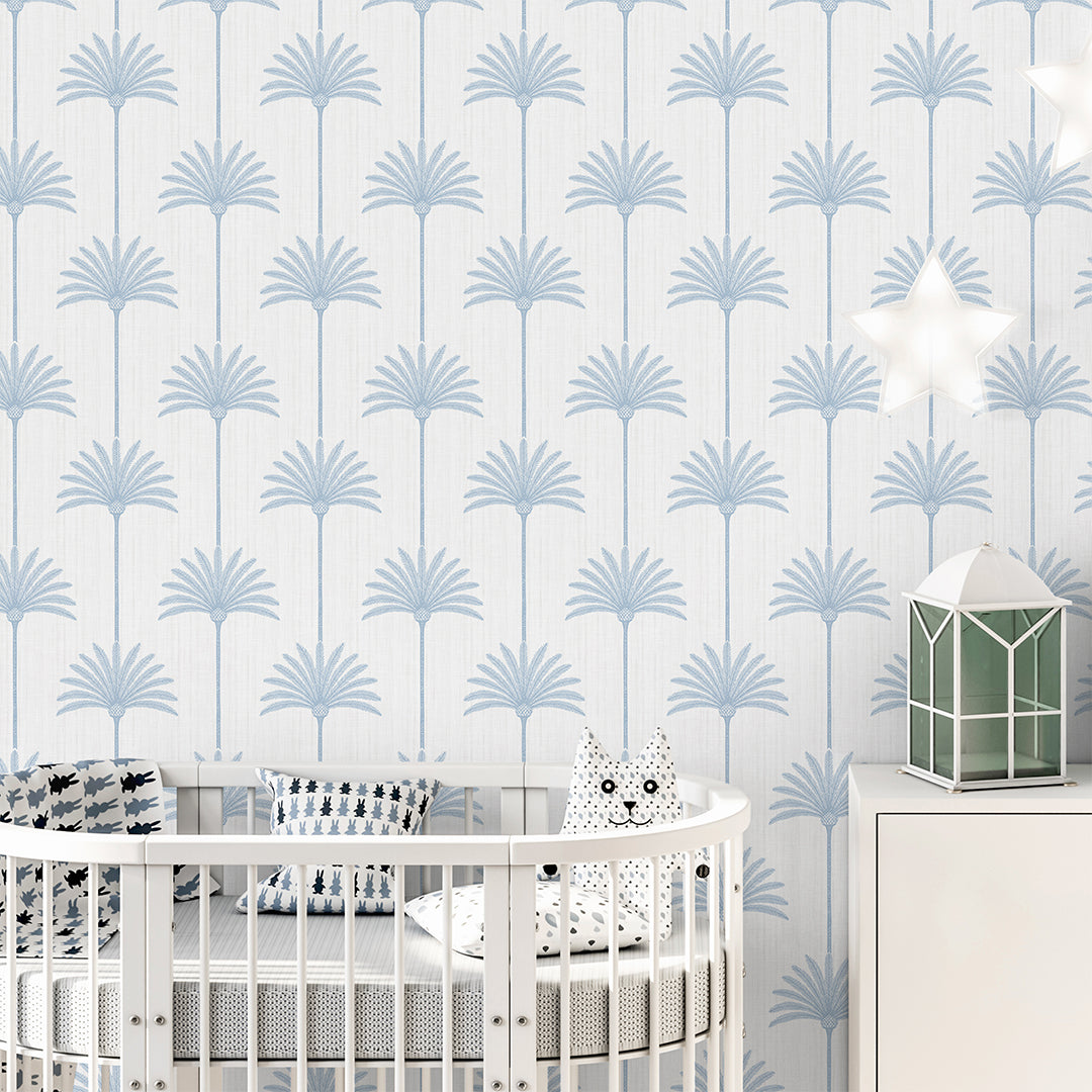 Soft Blue Palm Tree Stripe wallpaper for a coastal nursery or boys room. Minimal Scandinavian pattern for a beachy accent wall. Removable peel and stick, temporary, self-adhesive, traditional unpasted wallpaper or pre-pasted wallpaper and Wall Murals - all materials are eco-friendly. Made in the USA. High-quality removable material, this wallpaper is easy to apply and reposition, making it suitable for renters and home decorators and designers.
