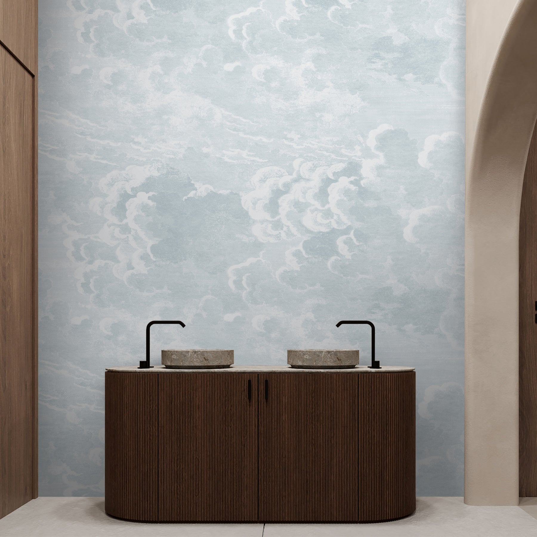 Peel and Stick Temporary Removable Vinyl Wallpaper, Traditional Unpasted Or Polyester Fabric Wallpaper with Neutral Blue Cloud with Retro Vintage Etched Sky Texture for Modern Interiors.