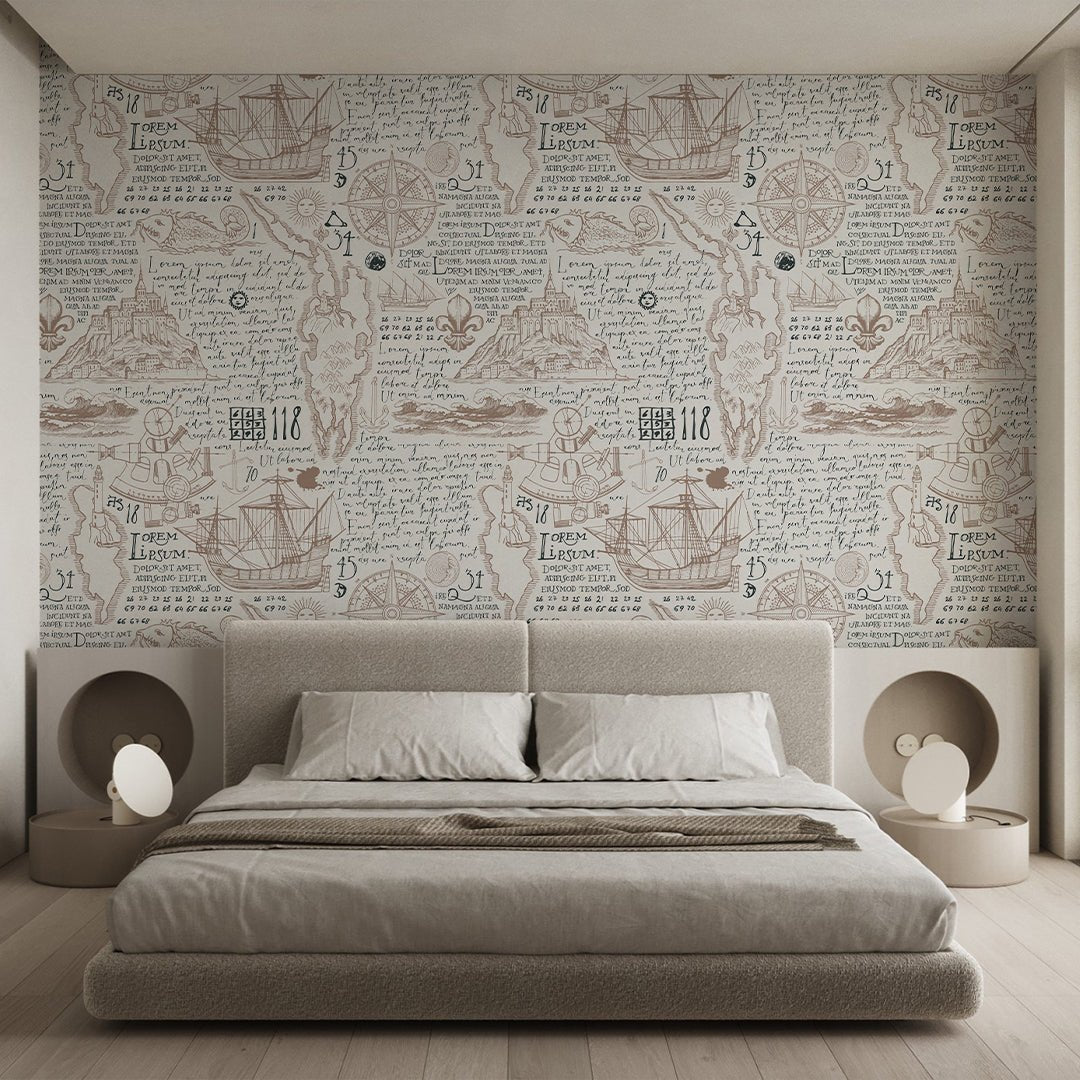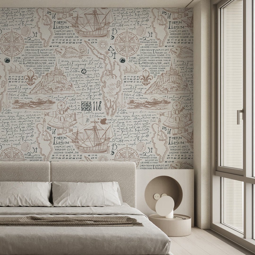 Self Adhesive Temporary Removable Vinyl Wallpaper Or Polyester Peel and Stick Wallpaper Vintage Beige Nautical Pirate Map Style with Maritime Sketch Art. Pastel Retro Nautical Pattern Fabric Wallcovering.