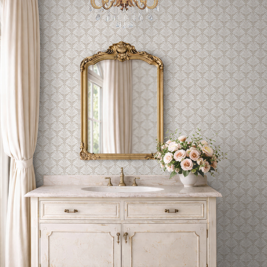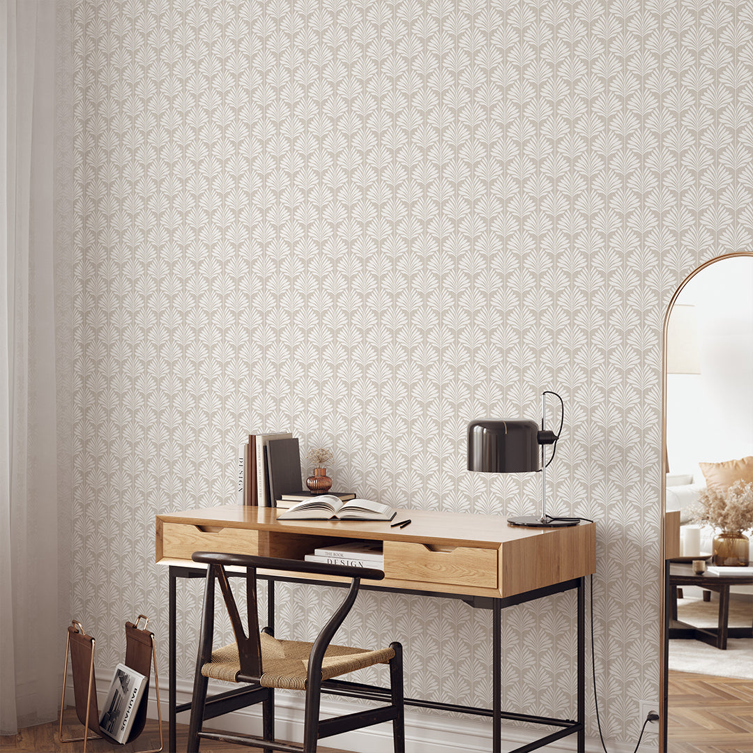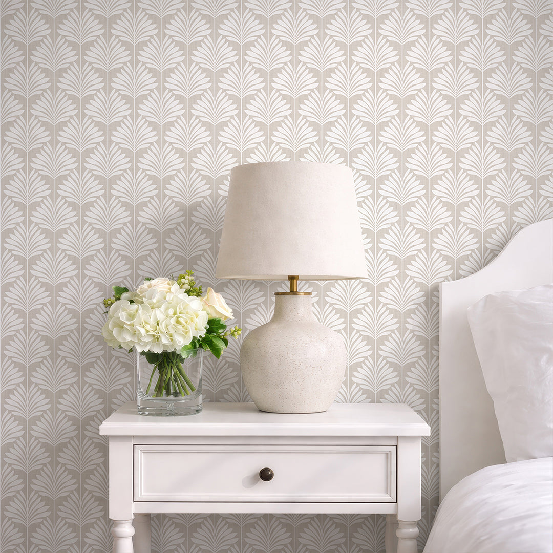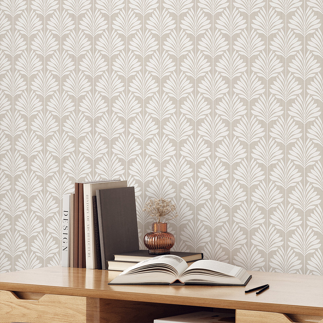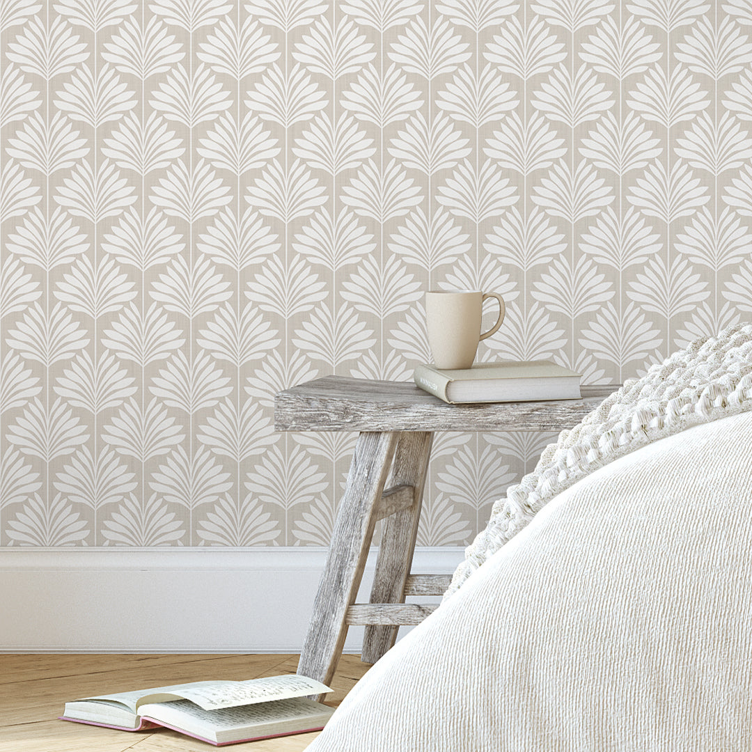 Beige linen texture tropical palm leaf mural with bright creamy ivory fronds for airy coastal, boho, and minimalist spaces. Removable peel and stick, temporary, self-adhesive, traditional unpasted wallpaper or pre-pasted wallpaper and Wall Murals - all materials are eco-friendly. Made in the USA. High-quality removable material, this wallpaper is easy to apply and reposition, making it suitable for renters and home decorators and designers.