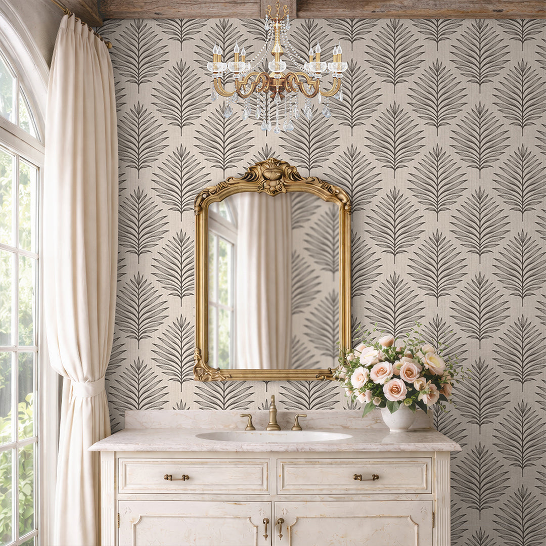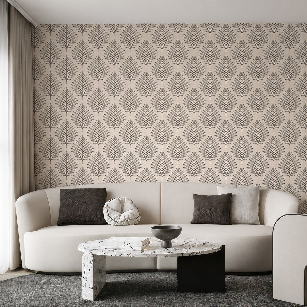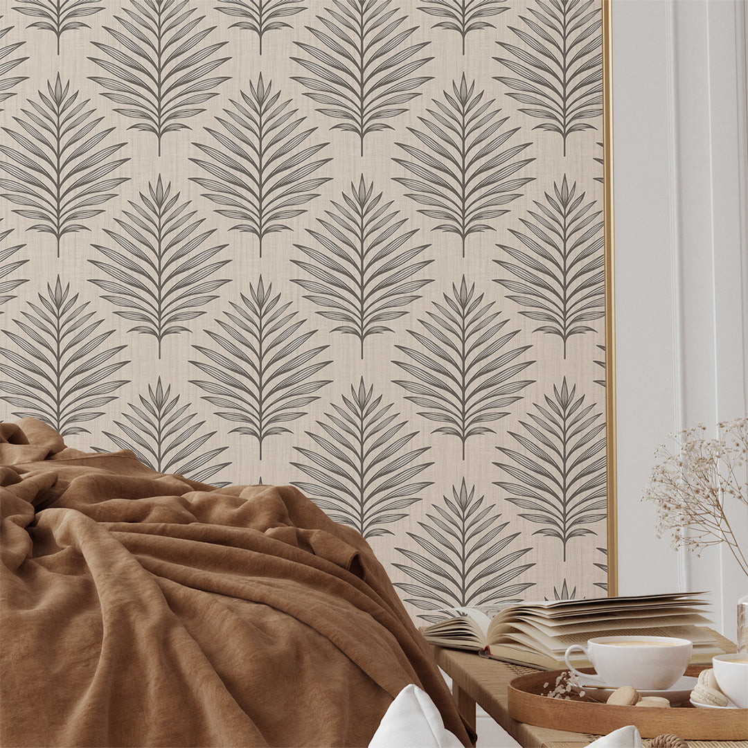 Beige linen texture tropical palm leaf mural with taupe brown botanical fronds for warm boho coastal interiors. Removable peel and stick, temporary, self-adhesive, traditional unpasted wallpaper or pre-pasted wallpaper and Wall Murals - all materials are eco-friendly. Made in the USA. High-quality removable material, this wallpaper is easy to apply and reposition, making it suitable for renters and home decorators and designers.