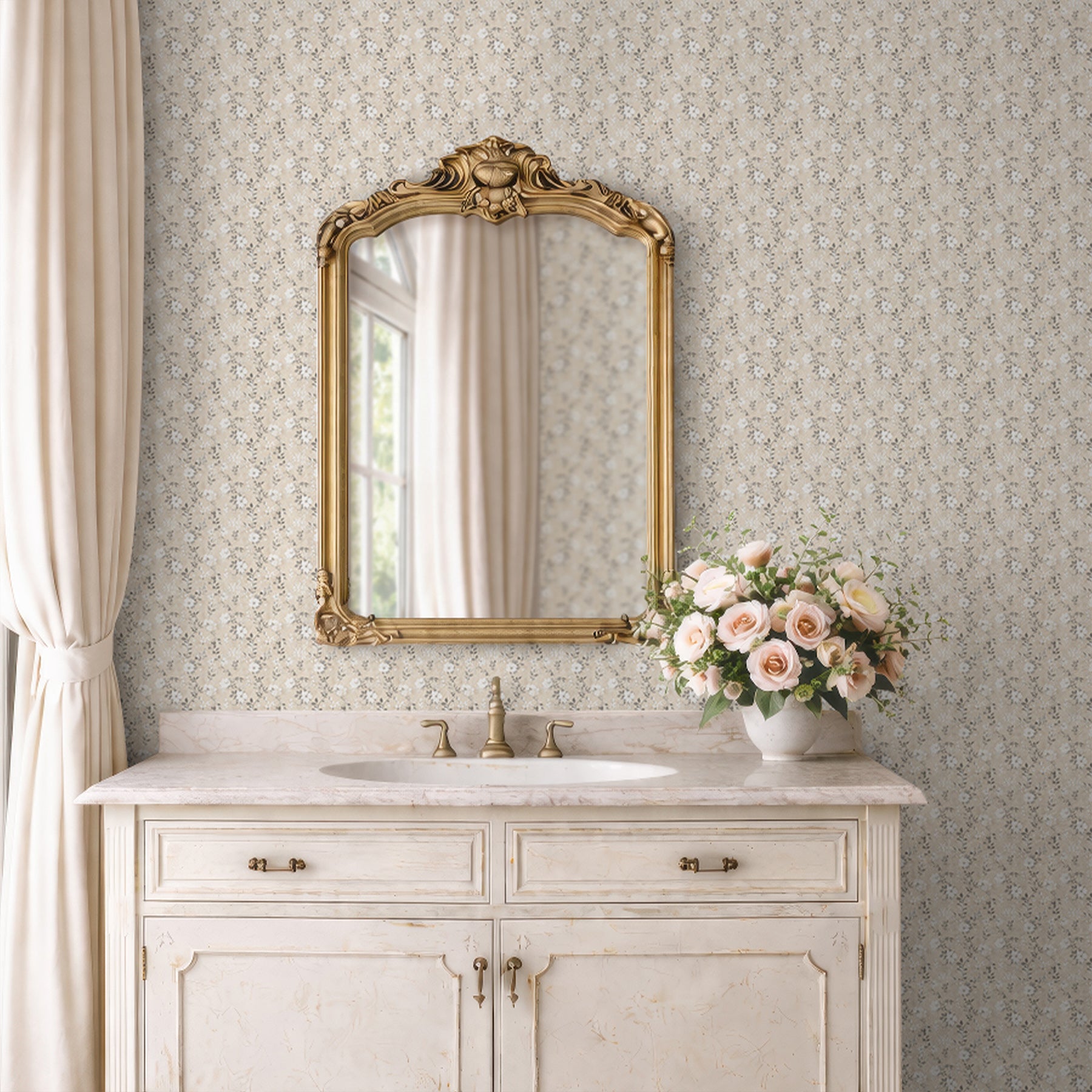 Neutral beige ditsy floral wall mural with tiny white wildflowers adds soft cottagecore charm to nurseries, bedrooms, bathrooms, and entryways. Removable peel and stick, temporary, self-adhesive, traditional unpasted wallpaper or pre-pasted wallpaper and Wall Murals - all materials are eco-friendly. Made in the USA. High-quality removable material, this wallpaper is easy to apply and reposition, making it suitable for renters and home decorators and designers.