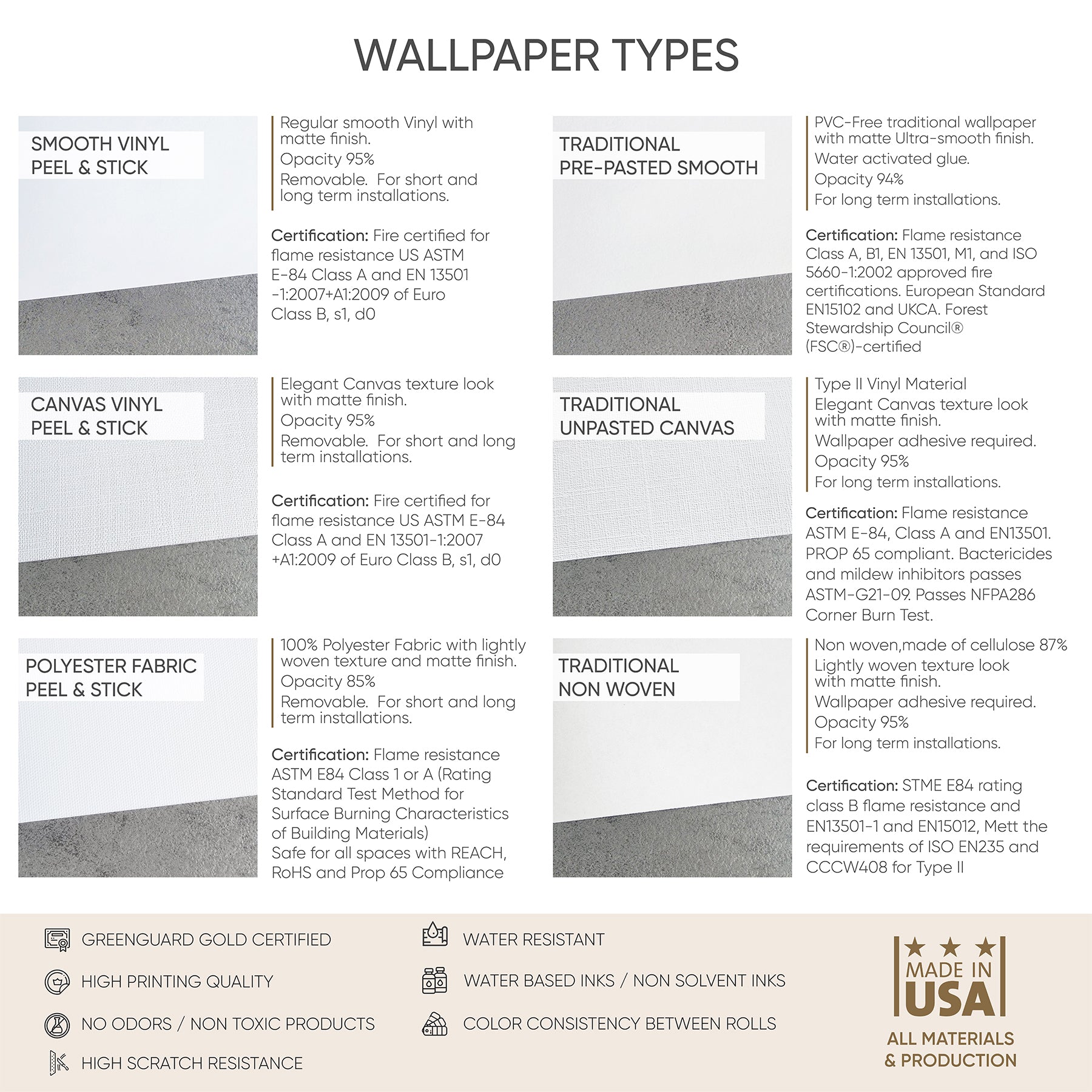 - Traditional Pre-Pasted Wallpaper: Matte and Ultra Smooth. Water activated glue. For long -term installations. Can be installed with wallpaper paste. PVC-free.
