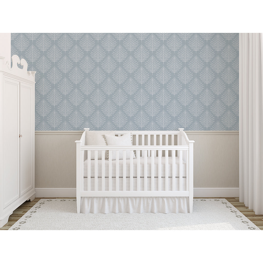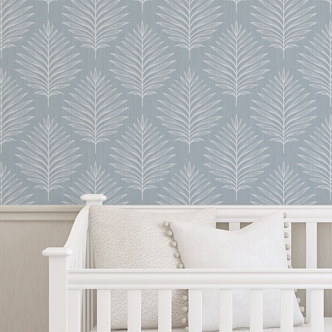 Dusty blue linen texture tropical palm leaf mural with crisp white botanical fronds for modern coastal and minimalist spaces. Removable peel and stick, temporary, self-adhesive, traditional unpasted wallpaper or pre-pasted wallpaper and Wall Murals - all materials are eco-friendly. Made in the USA. High-quality removable material, this wallpaper is easy to apply and reposition, making it suitable for renters and home decorators and designers.