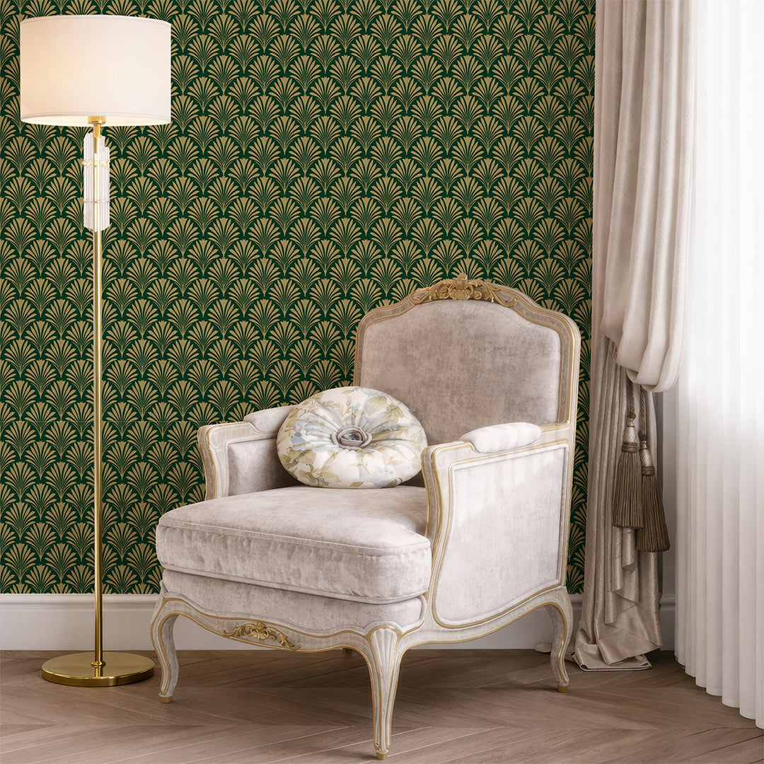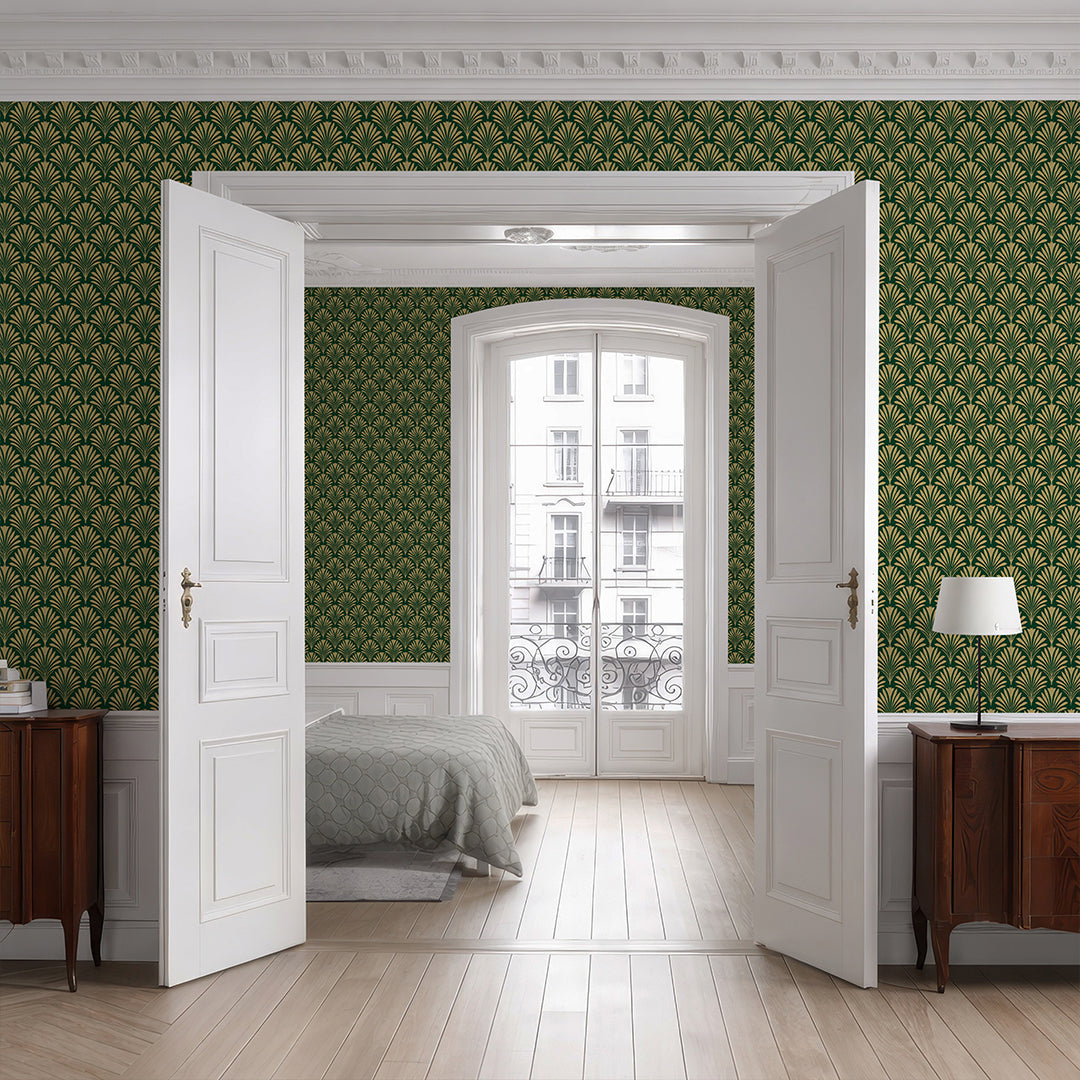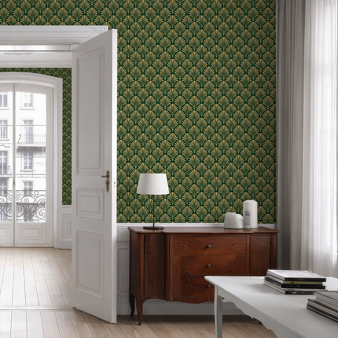 Emerald green botanical fan wallpaper with a bold repeating motif for an art deco inspired luxe look in living room, dining room, bedroom, or entryway. Removable peel and stick, temporary, self-adhesive, traditional unpasted wallpaper or pre-pasted wallpaper and Wall Murals - all materials are eco-friendly. Made in the USA. High-quality removable material, this wallpaper is easy to apply and reposition, making it suitable for renters and home decorators and designers.