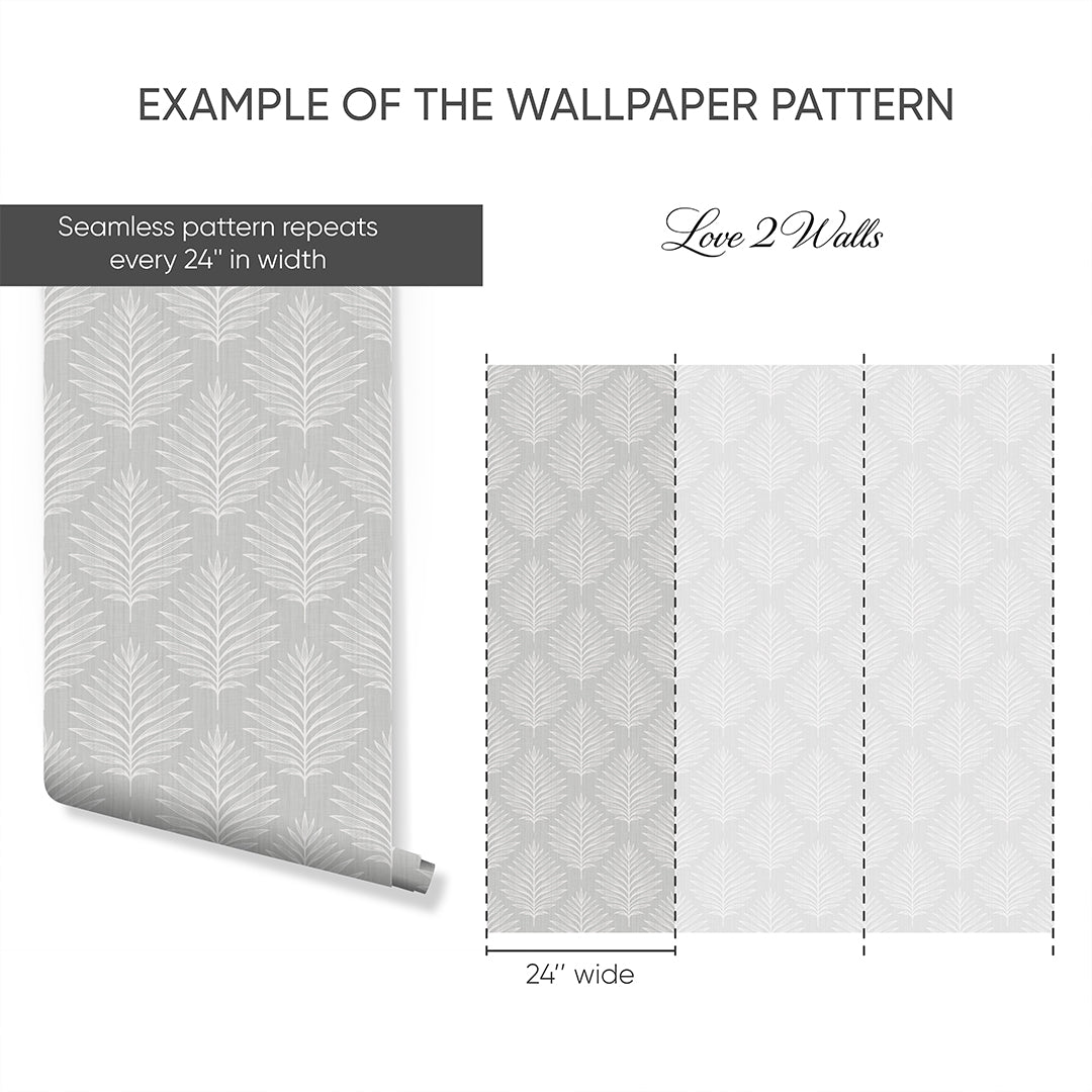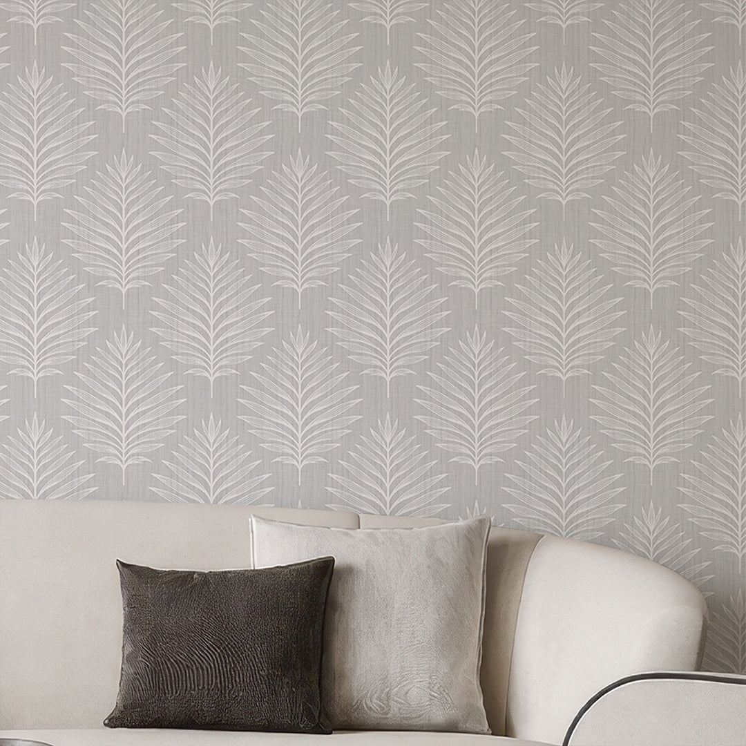 Gray linen texture tropical palm leaf mural with crisp white botanical fronds for modern coastal and minimalist spaces. Removable peel and stick, temporary, self-adhesive, traditional unpasted wallpaper or pre-pasted wallpaper and Wall Murals - all materials are eco-friendly. Made in the USA. High-quality removable material, this wallpaper is easy to apply and reposition, making it suitable for renters and home decorators and designers.