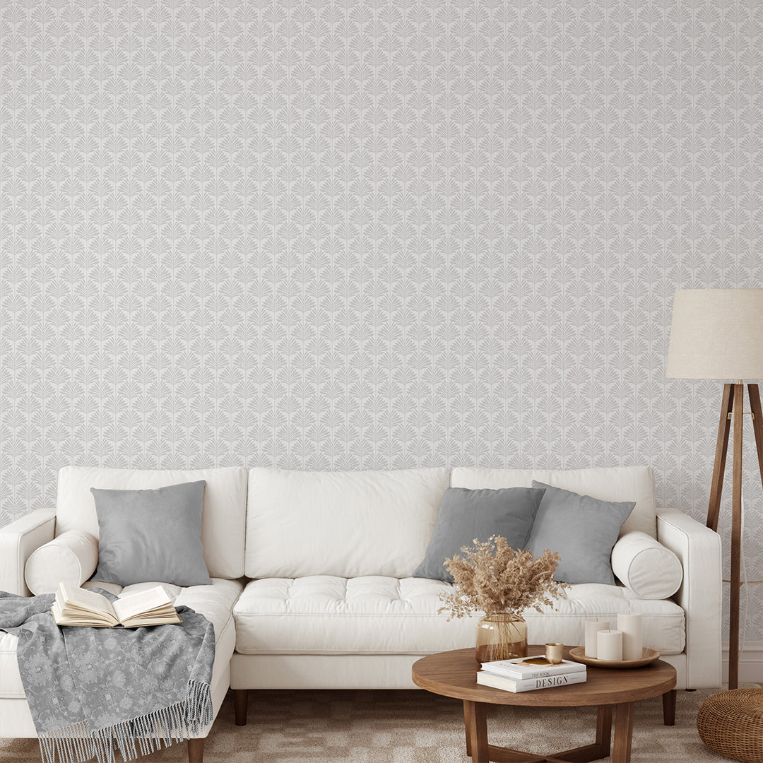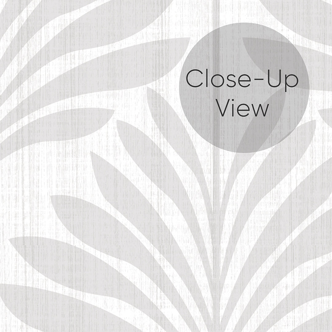 Soft gray tropical palm leaf mural on a light gray linen texture background—clean, calming, and perfect for modern neutral, coastal, boho, and minimalist spaces. Removable peel and stick, temporary, self-adhesive, traditional unpasted wallpaper or pre-pasted wallpaper and Wall Murals - all materials are eco-friendly. Made in the USA. High-quality removable material, this wallpaper is easy to apply and reposition, making it suitable for renters and home decorators and designers.