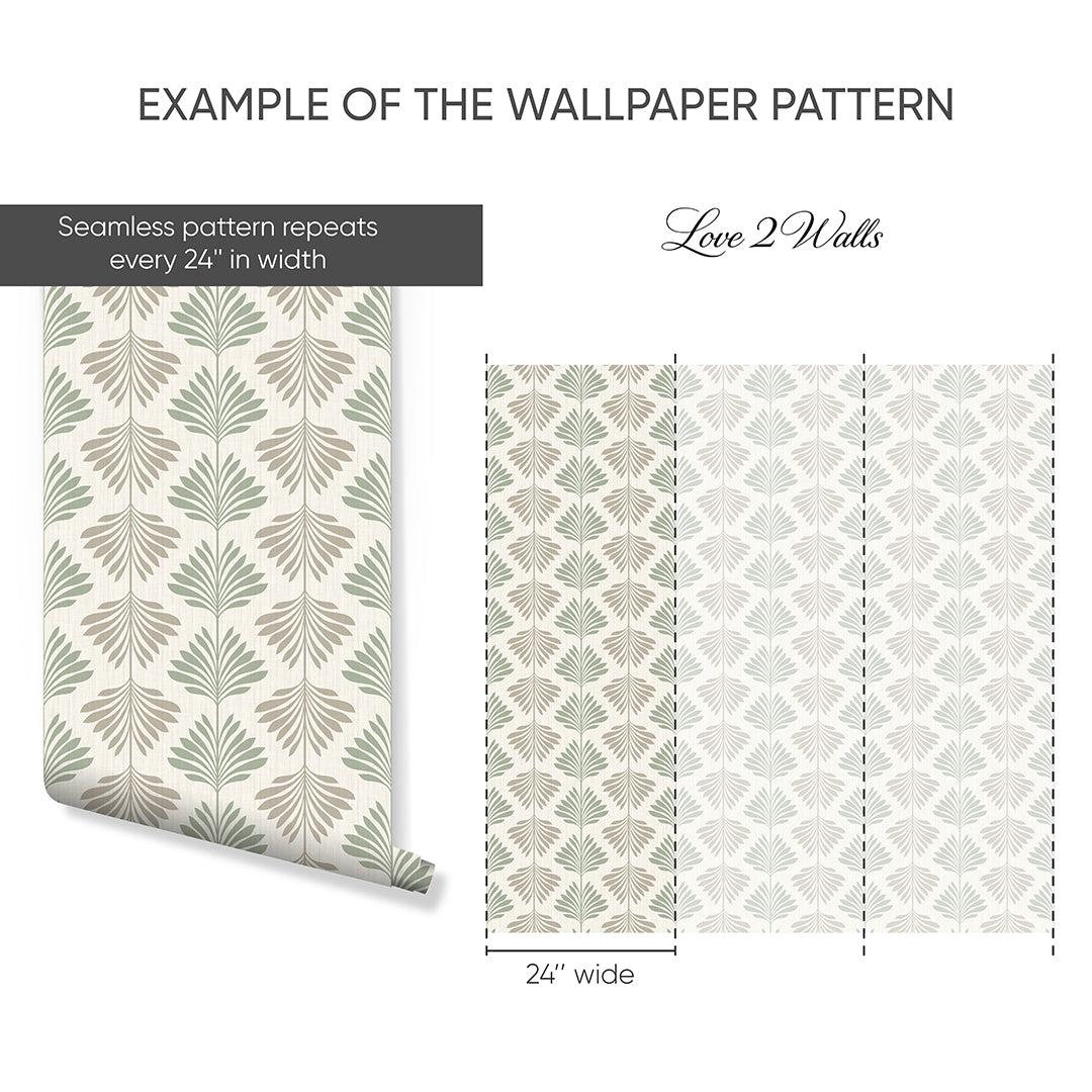 Sage green and beige palm leaf wallpaper mural with beige linen texture, a neutral coastal botanical look for bedroom, bathroom, nursery, or living room. Removable peel and stick, temporary, self-adhesive, traditional unpasted wallpaper or pre-pasted wallpaper and Wall Murals - all materials are eco-friendly. Made in the USA. High-quality removable material, easy to apply and reposition for renters, home decorators and designers.