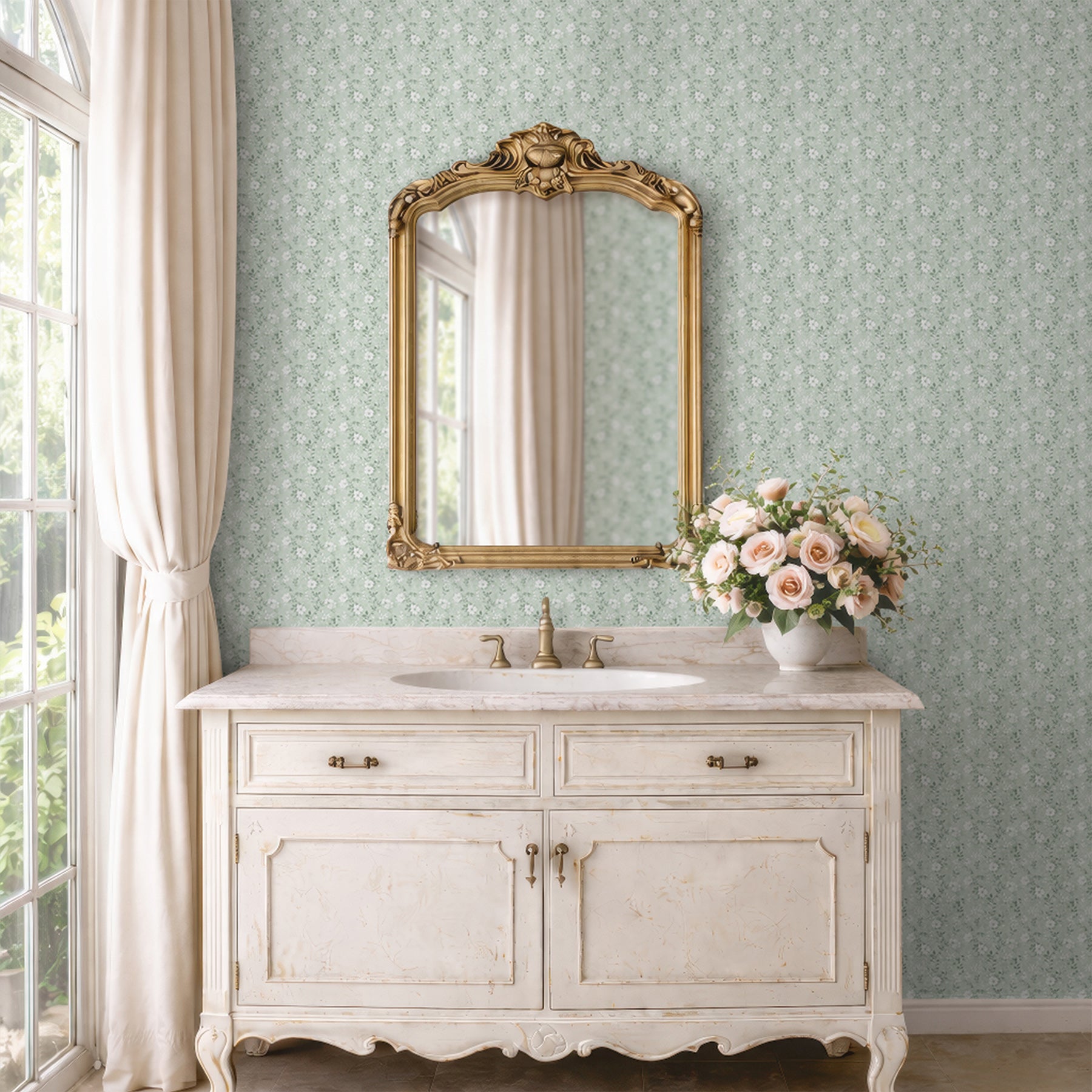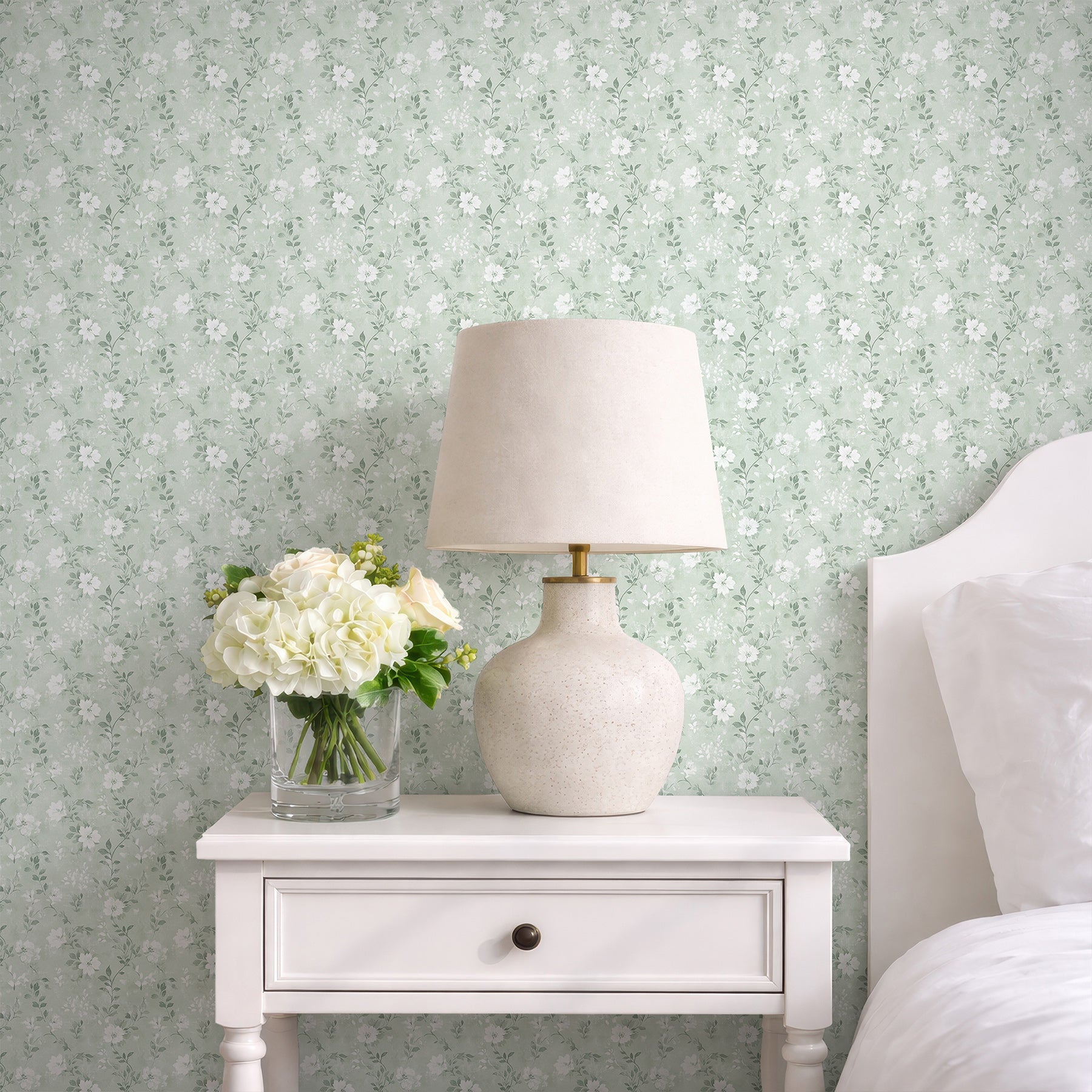 Soft mint green ditsy floral wall mural with tiny white wildflowers adds airy cottagecore charm to nurseries, bedrooms, bathrooms, and entryways. Removable peel and stick, temporary, self-adhesive, traditional unpasted wallpaper or pre-pasted wallpaper and Wall Murals - all materials are eco-friendly. Made in the USA. High-quality removable material, this wallpaper is easy to apply and reposition, making it suitable for renters and home decorators and designers.