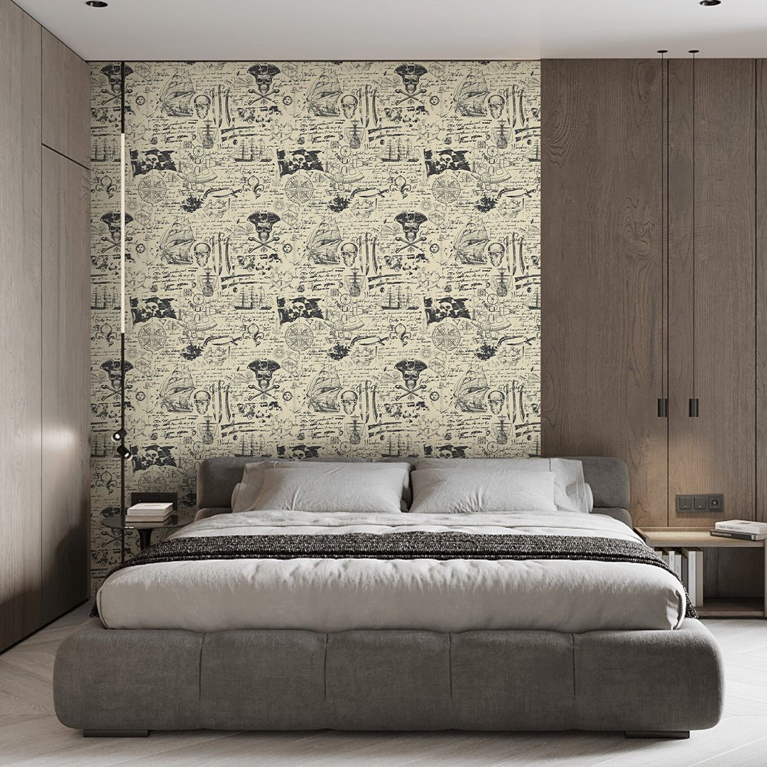 Self Adhesive Temporary Removable Vinyl Wallpaper Or Polyester Peel and Stick Wallpaper Vintage Beige Nautical Pirate Map Style with Maritime Sketch Art . Pastel Retro Nautical Pattern Fabric Wallcovering.